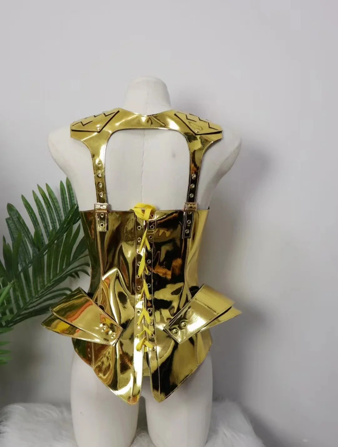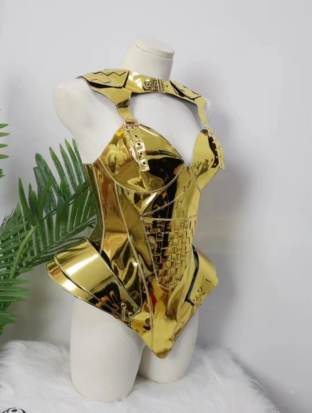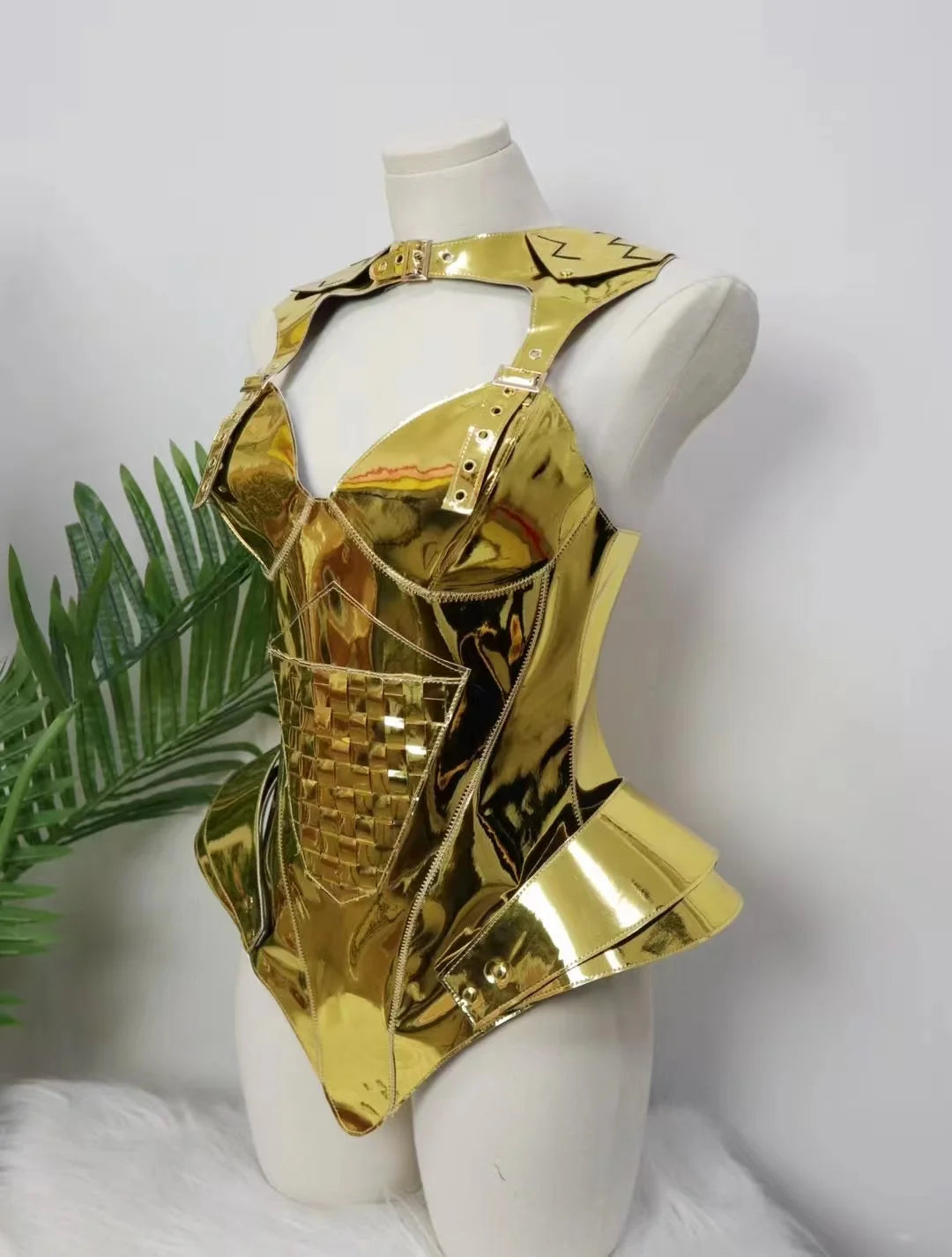 Command the stage in this Gold & Silver Laser Mirror Armor performance dress — a futuristic, high-impact costume designed for leading dance teams, gogo performers, singers, and club talent who want armor-like shine with movement-friendly construction.