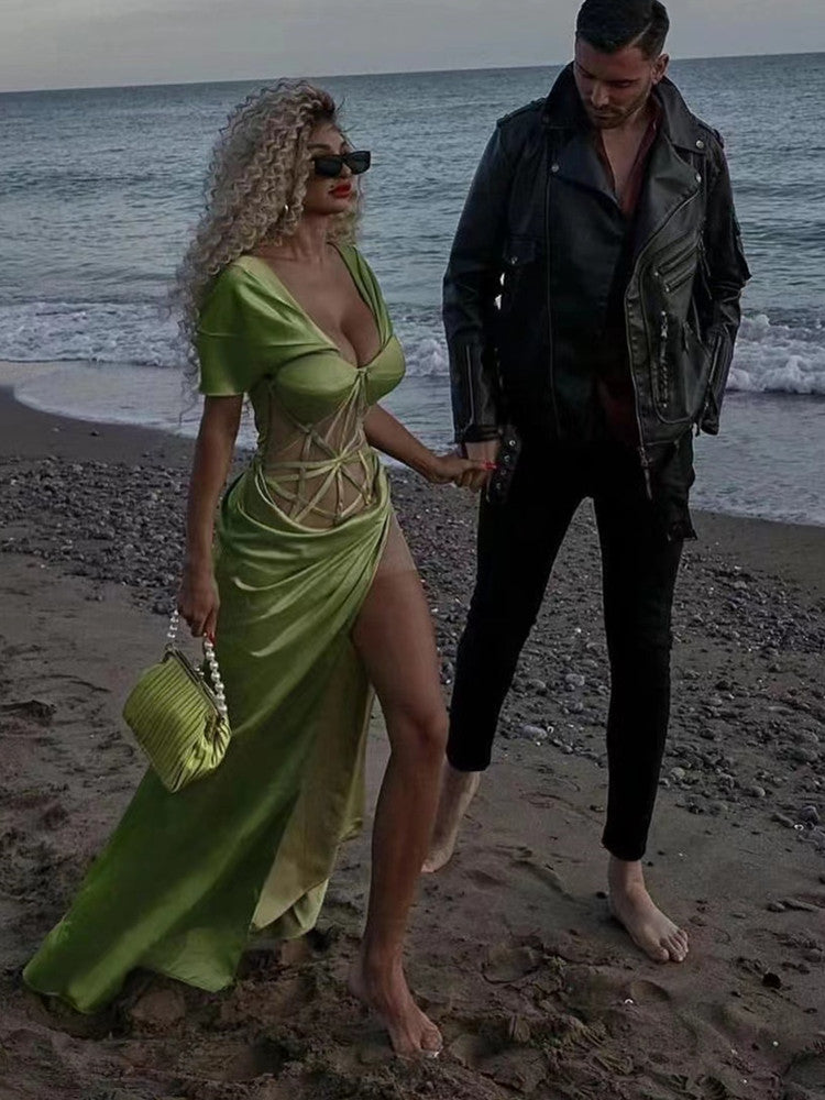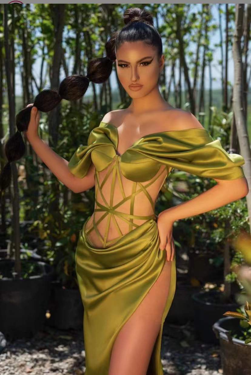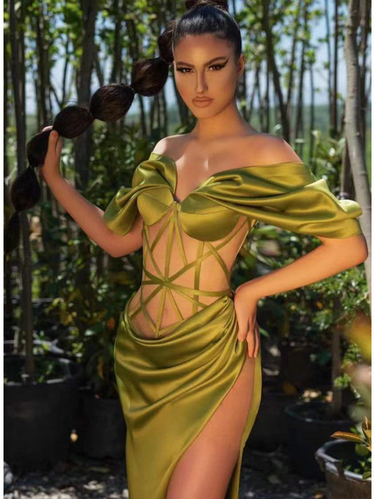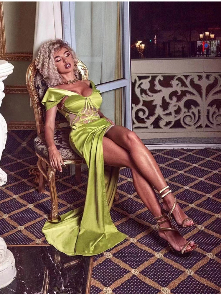 Green Color Women Off the Shoulder Long Dress Split Evening Party Dress Silk Celebrity Red Carpet Dress
