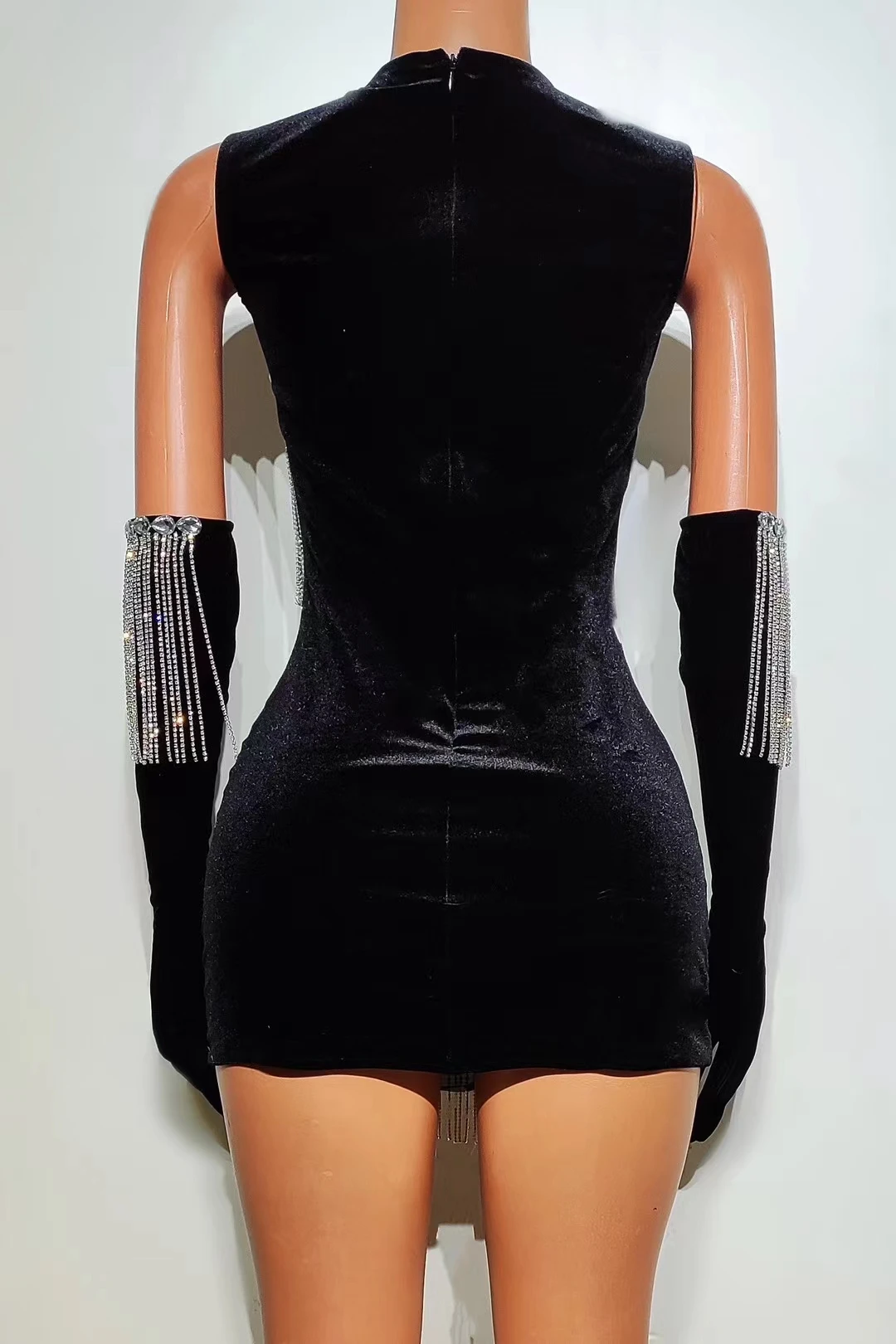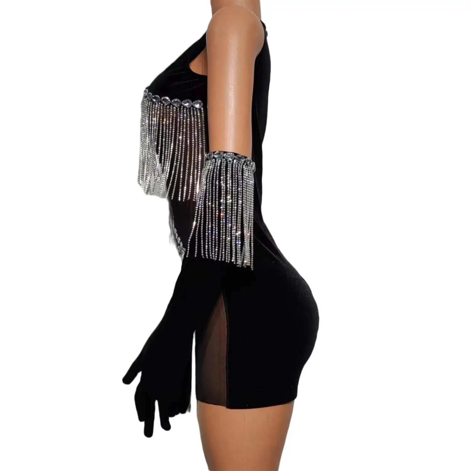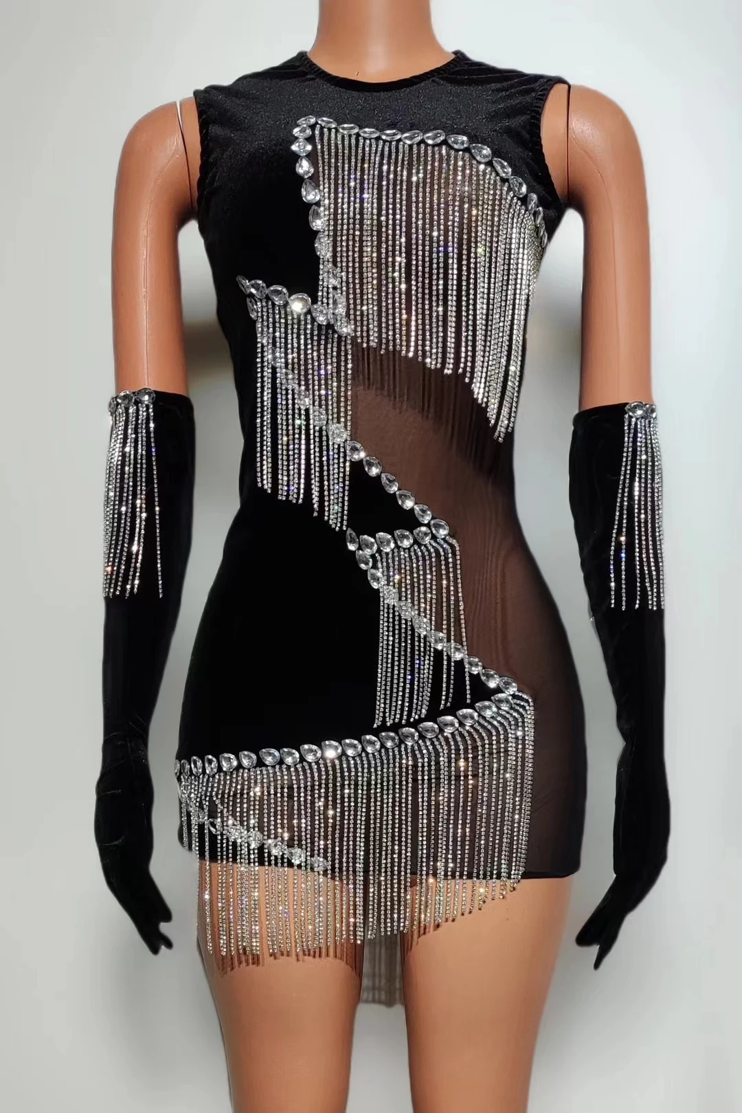 Women Diamond Tassel Short Skirt with Glove Birthday Party Princess Dress Fashion Rhinestones Stage Performance Costumes Yanhui