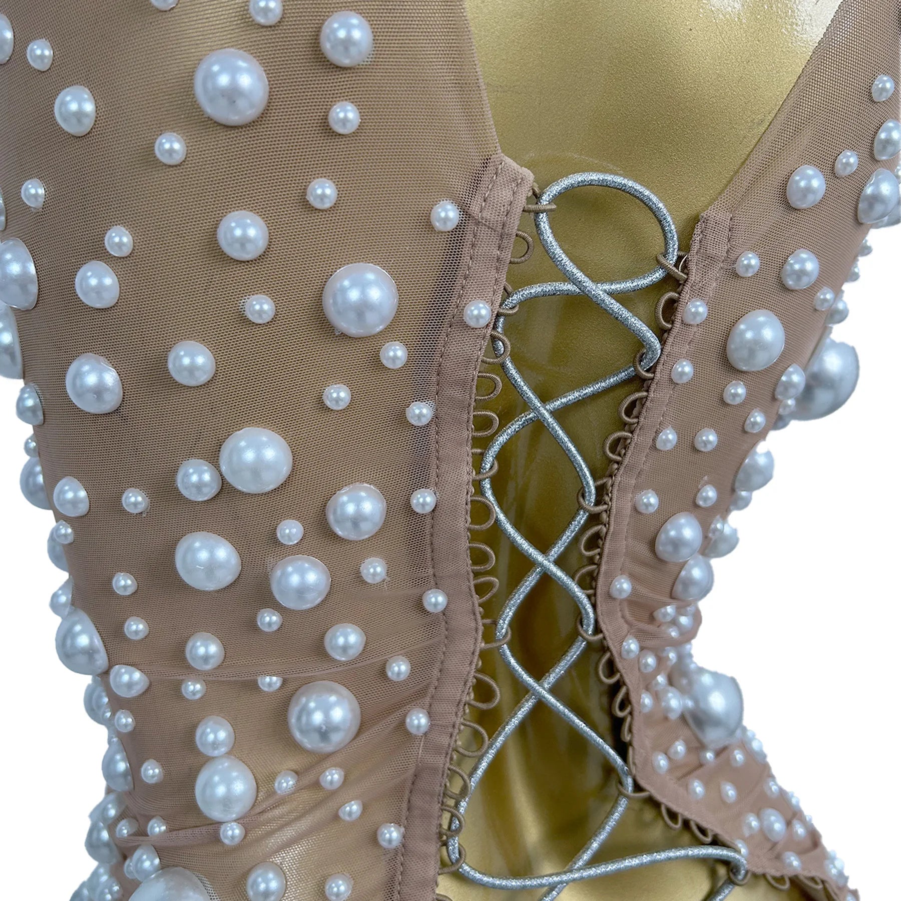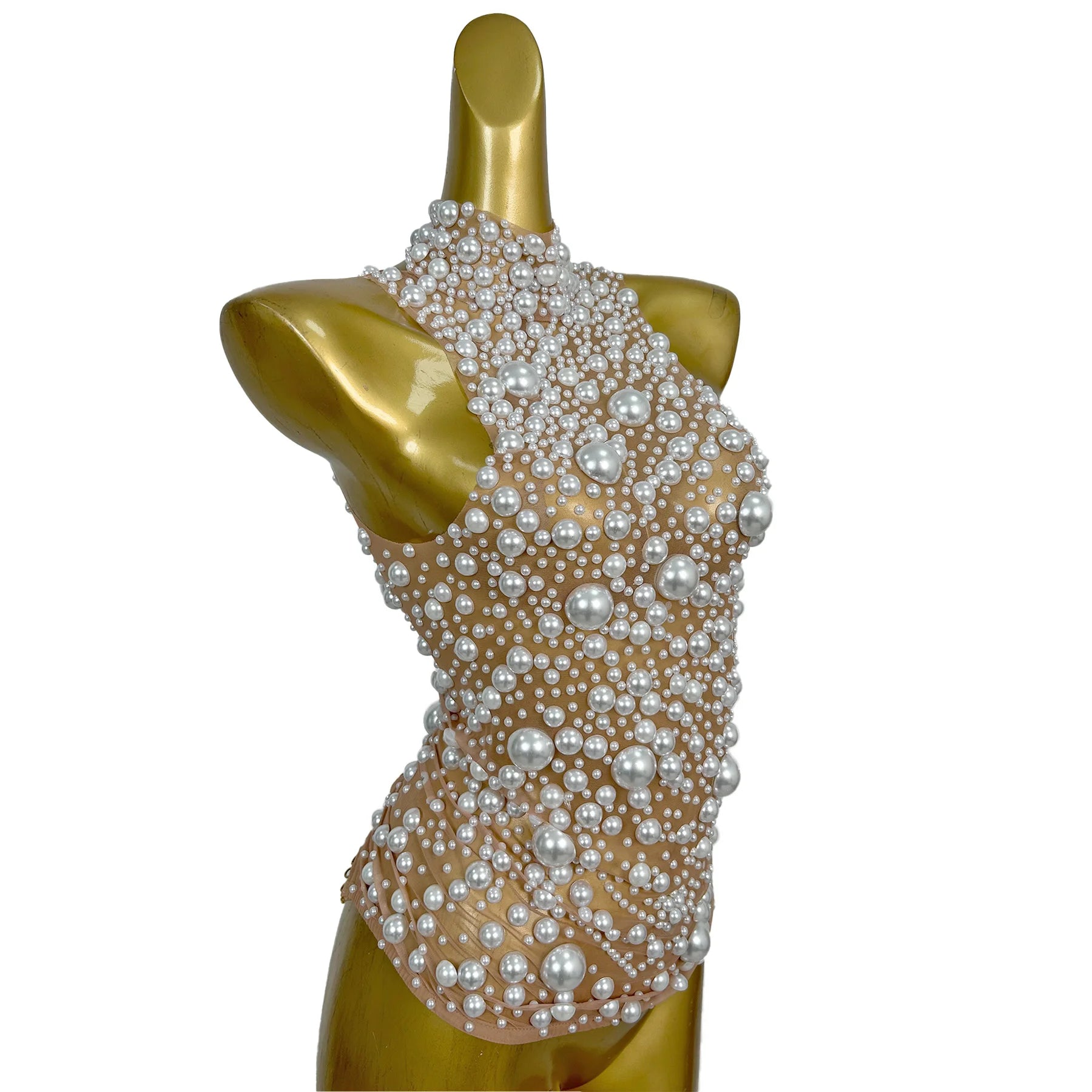 High-end Full White Pearls Sleeveless Tops Sparkly Luxury See Through Mesh Tops Nightclub Party Outfit Stage Show Wear