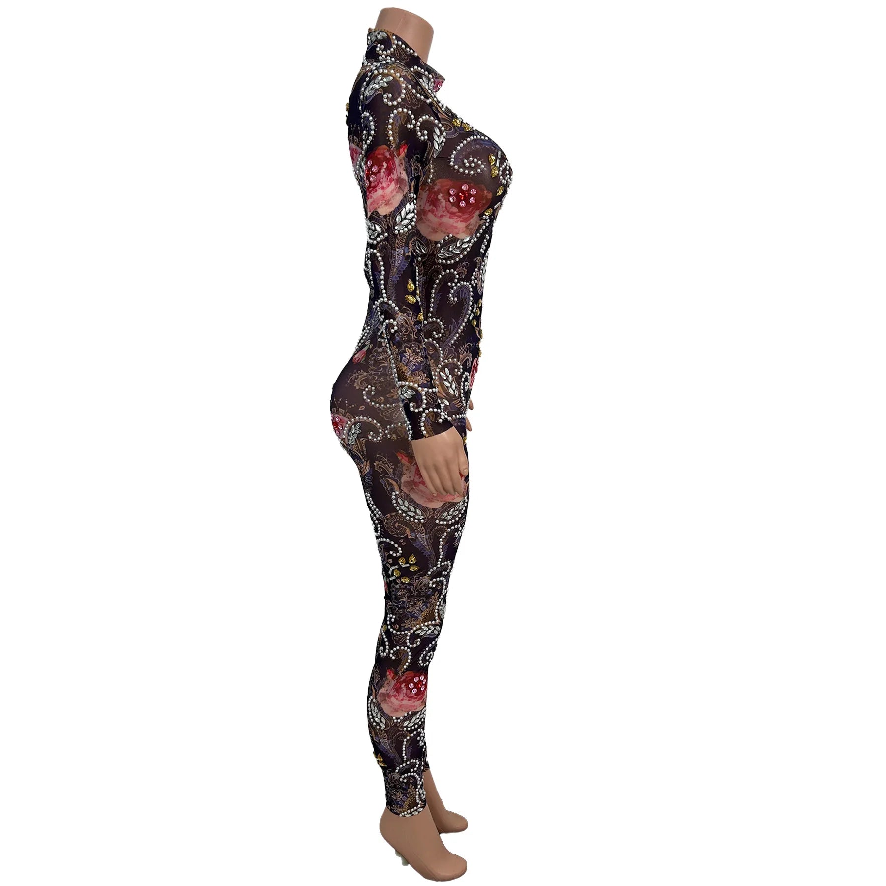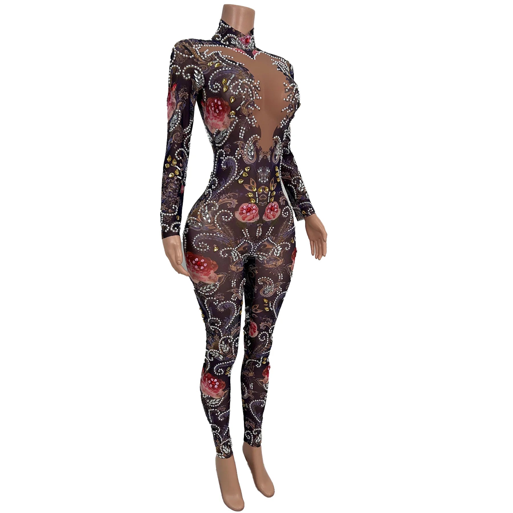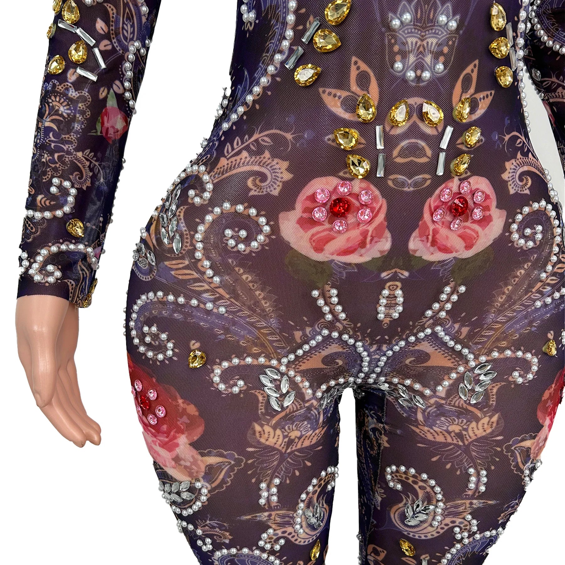 High-end Pearls Rose Printing Mesh Outfit Club Celebrate Party Dance Tight Fitting Jumpsuit Stage Drag Queen Show Wear