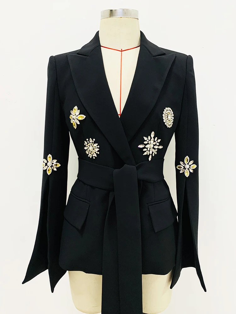 Step into the spotlight with our Newest Fashion Runway Designer Blazer. This stunning women's jacket features chic slit sleeves adorned with sparkling crystal rhinestones and dazzling diamonds, adding a touch of glamour to any outfit. The beaded belt cinches at the waist for a flattering silhouette, making it perfect for both formal events and fashionable outings. Elevate your wardrobe with this statement piece that effortlessly combines elegance and trendsetting style!