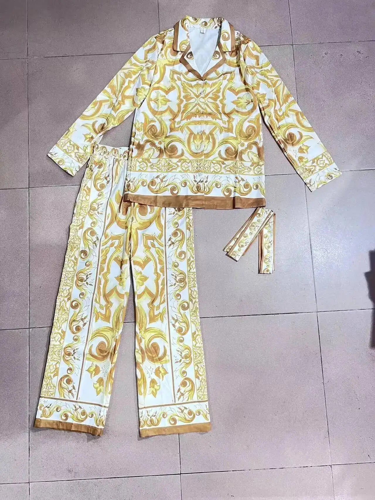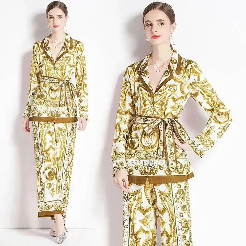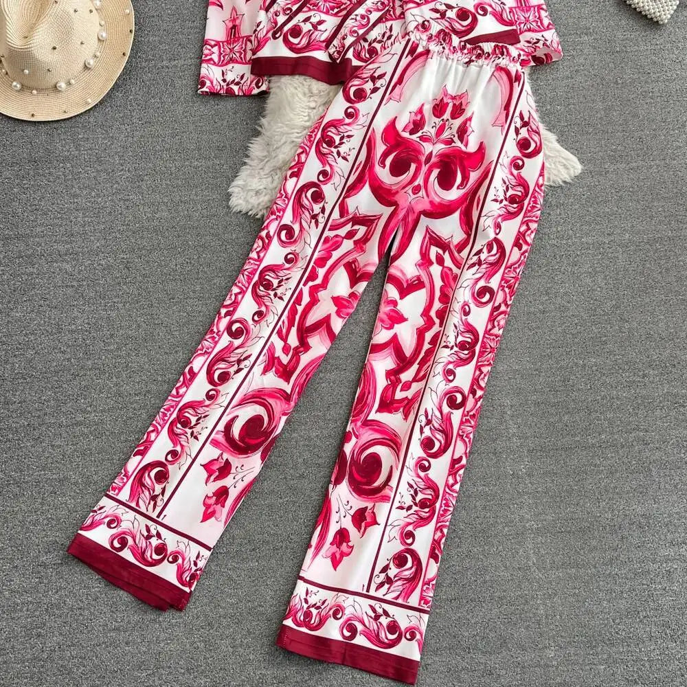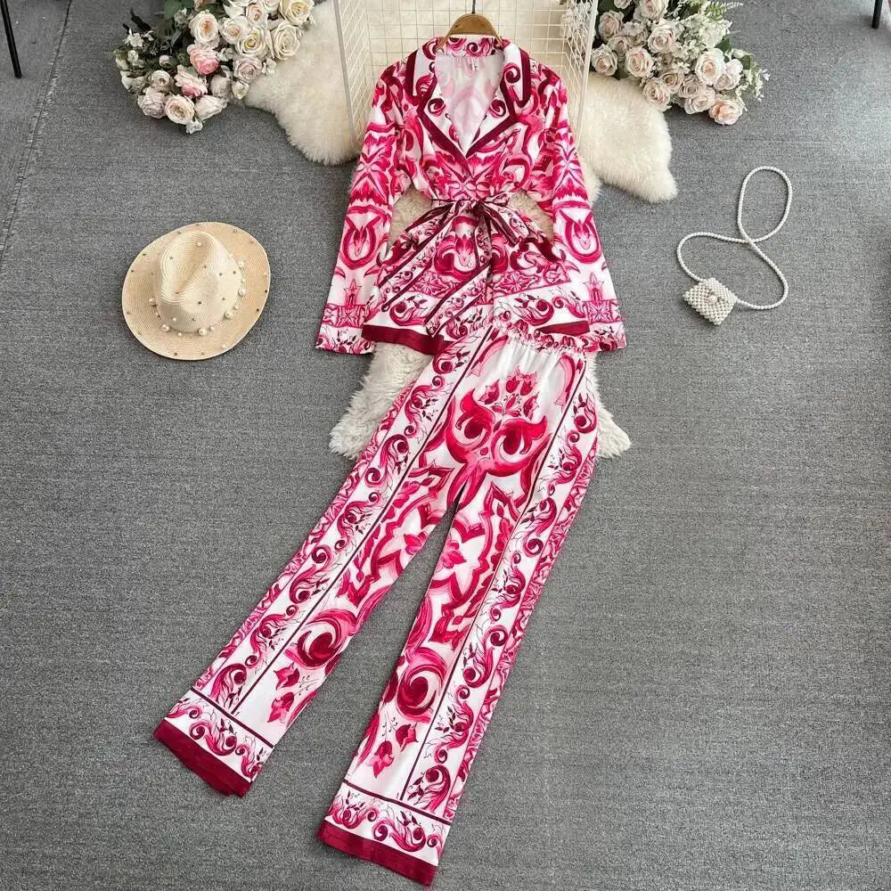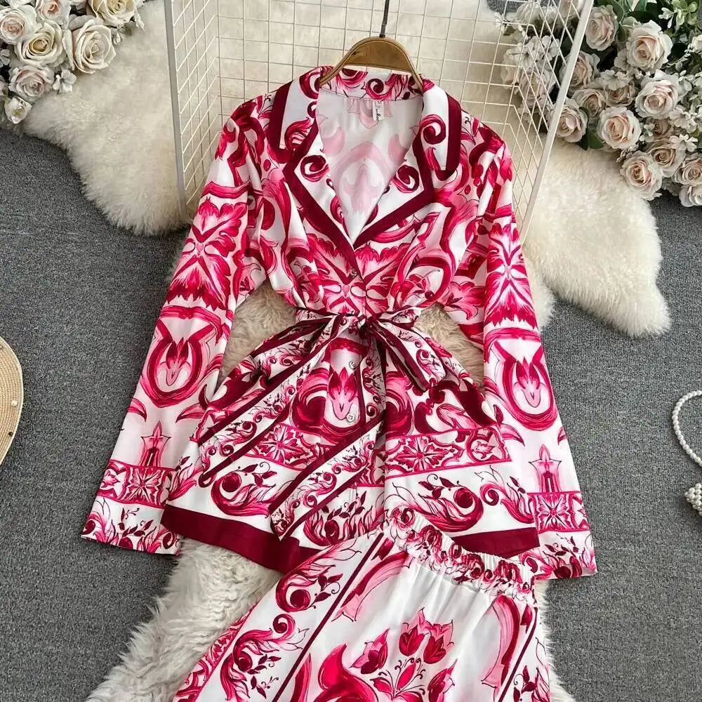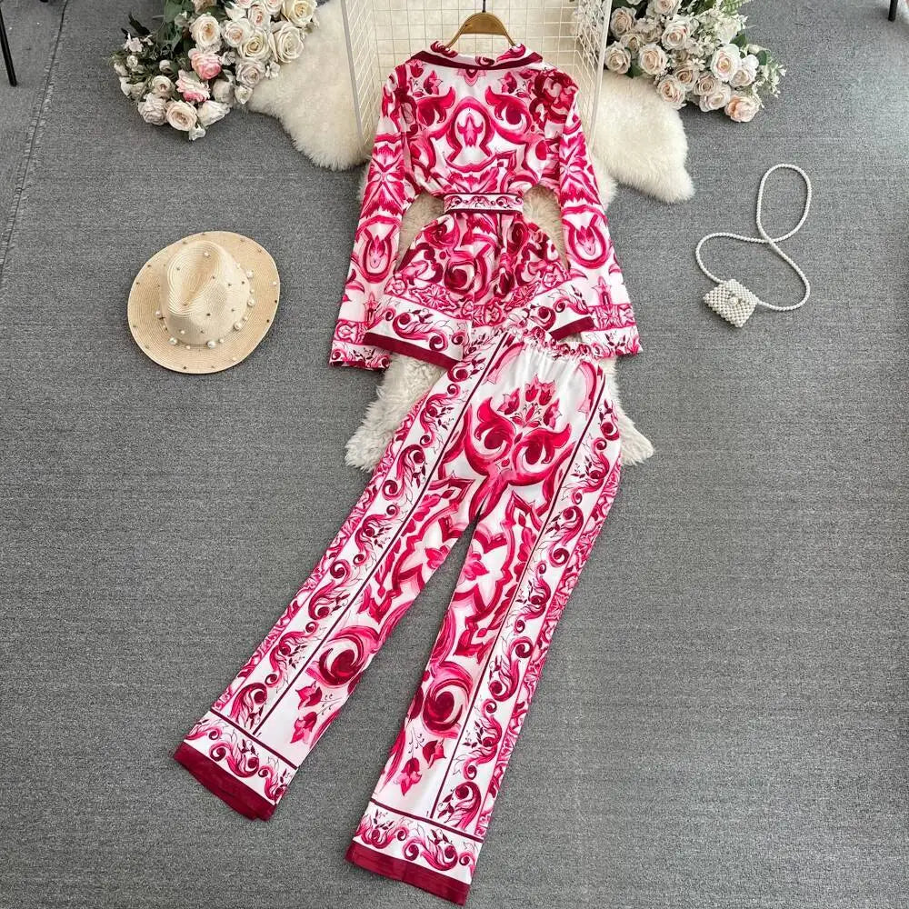 Porcelain Floral Two Piece Sets Women Long Sleeve Shirts Red White Blouses + Skinny Pants Suits Runway