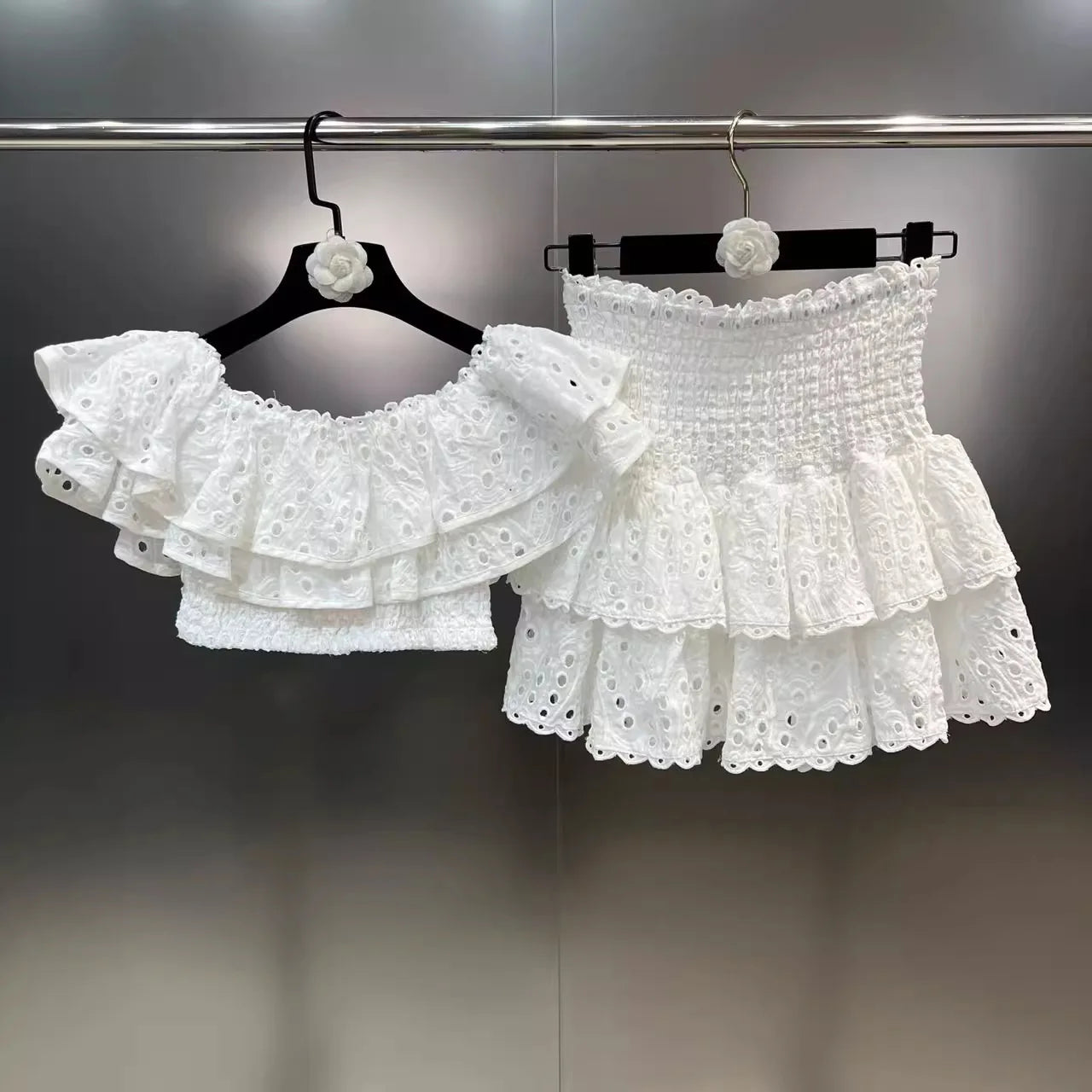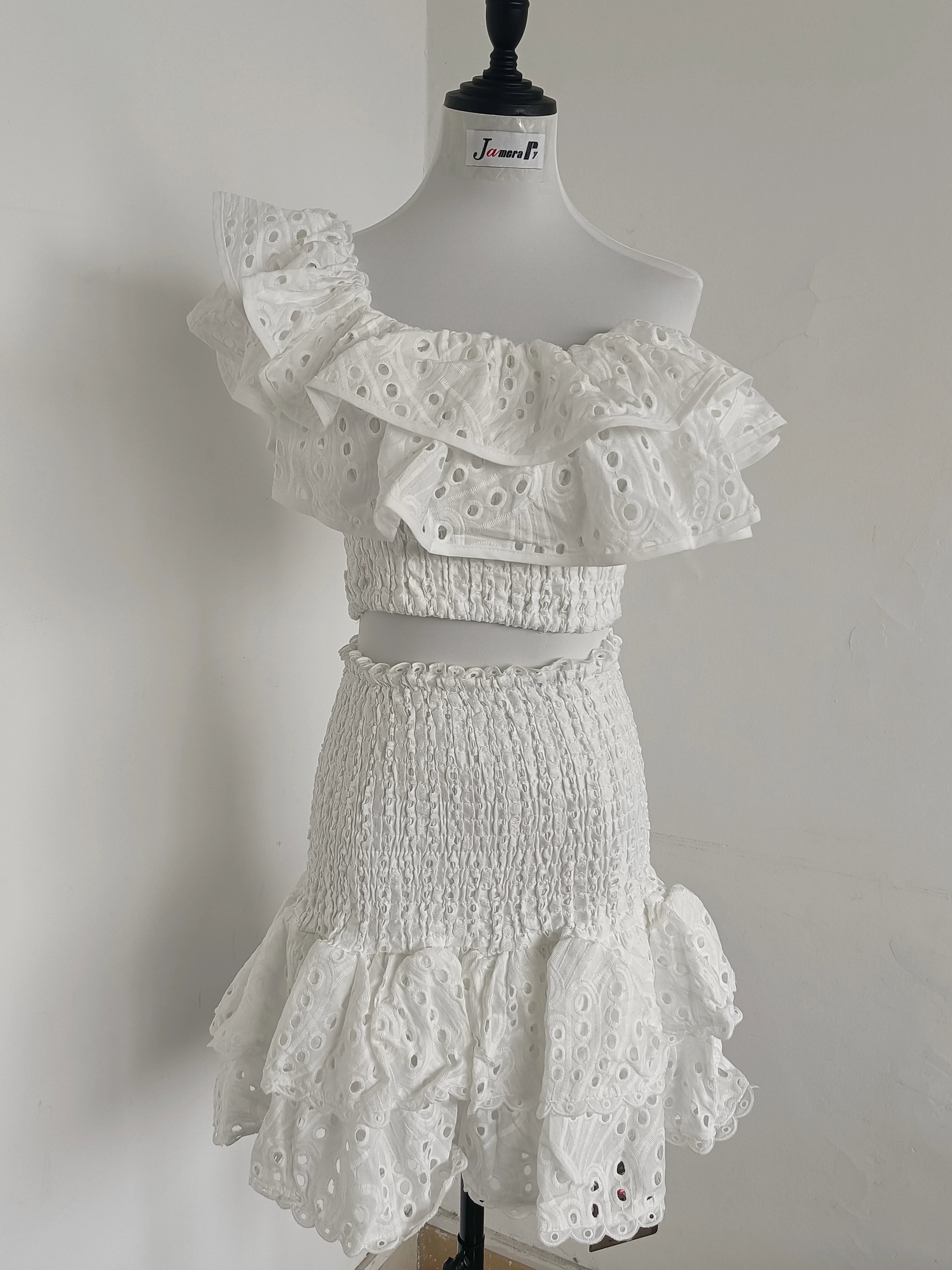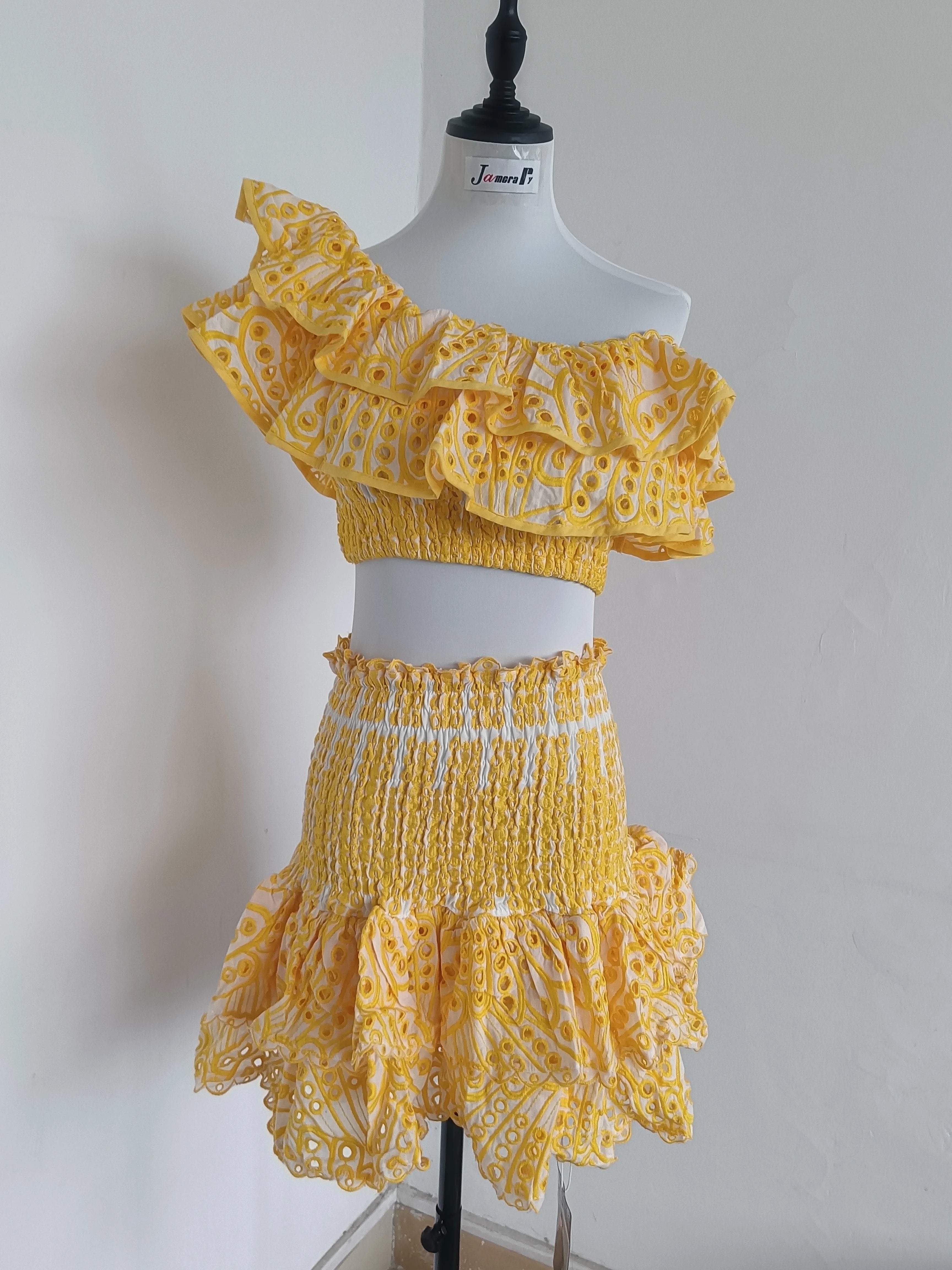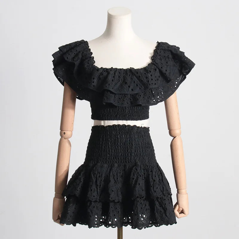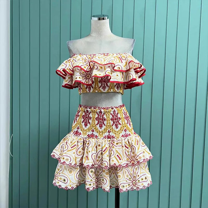 Floral Two Piece Women Dress Summer Cotton Embroidery Sexy Slash Neck Ruffles Short Skirts Suits Beach Crop Tops
