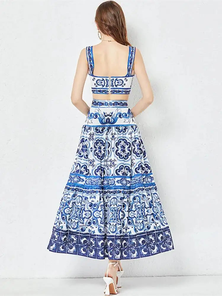 Summer Runway Blue and White Porcelain Two Piece Set Women Flower Print Short Crop Top + Holiday Beach Maxi Skirt Suits