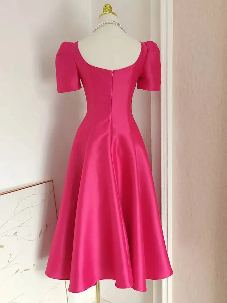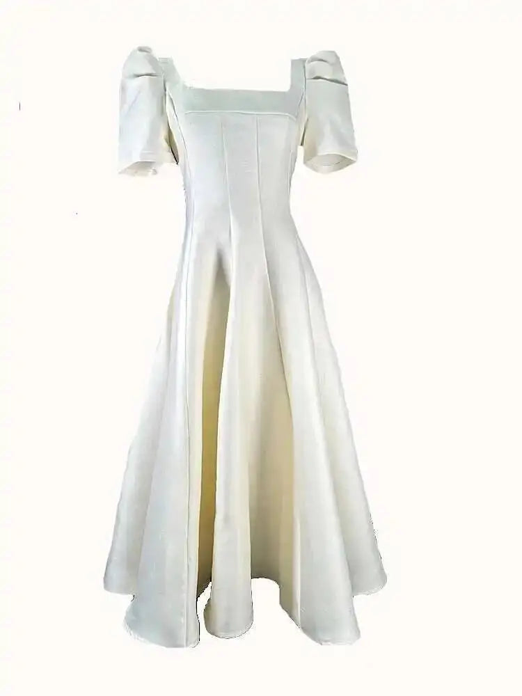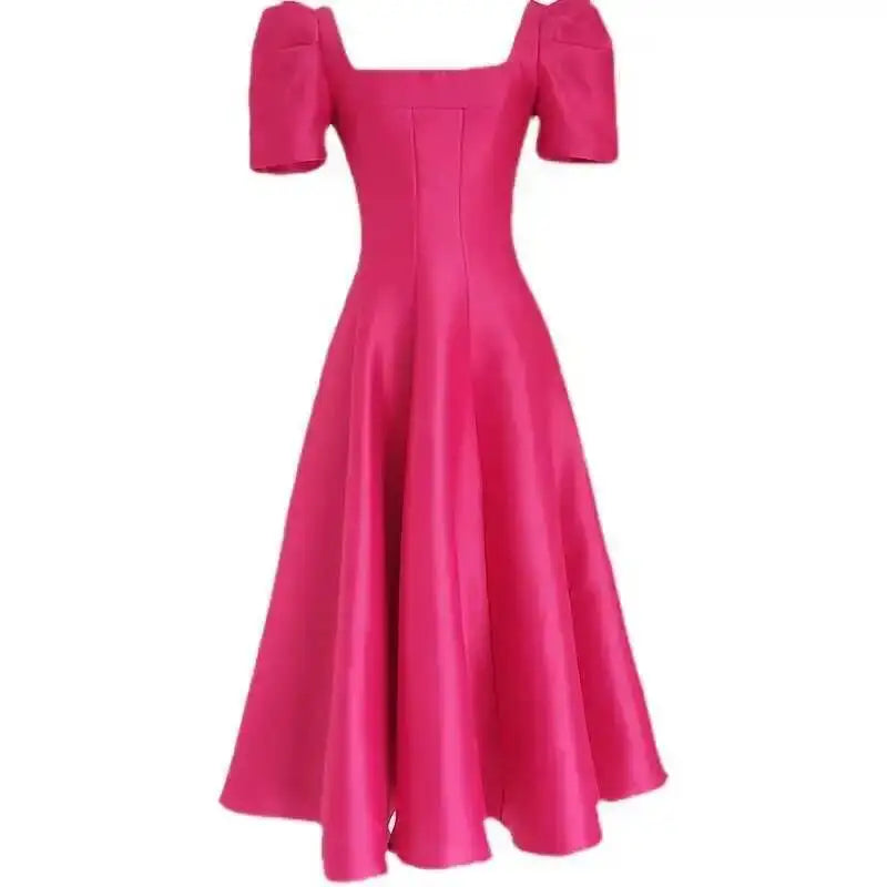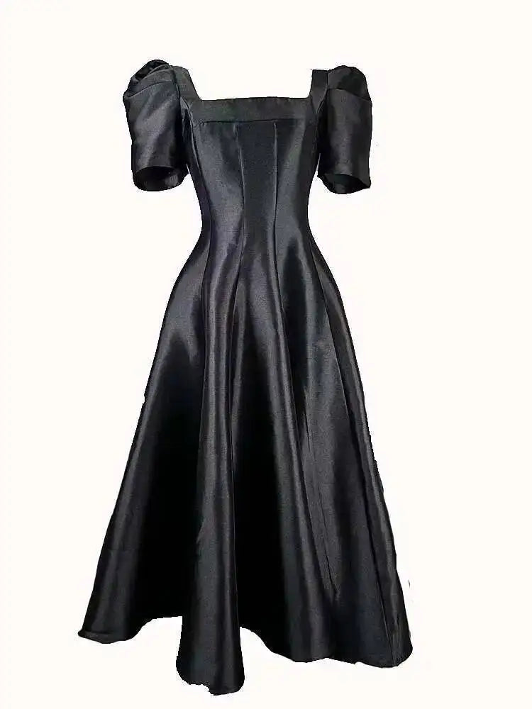 Summer Women Dress Long French Hepburn Style Fashion Party Elegant Square Collar Short Sleeve Midi Vestidos Party Robe