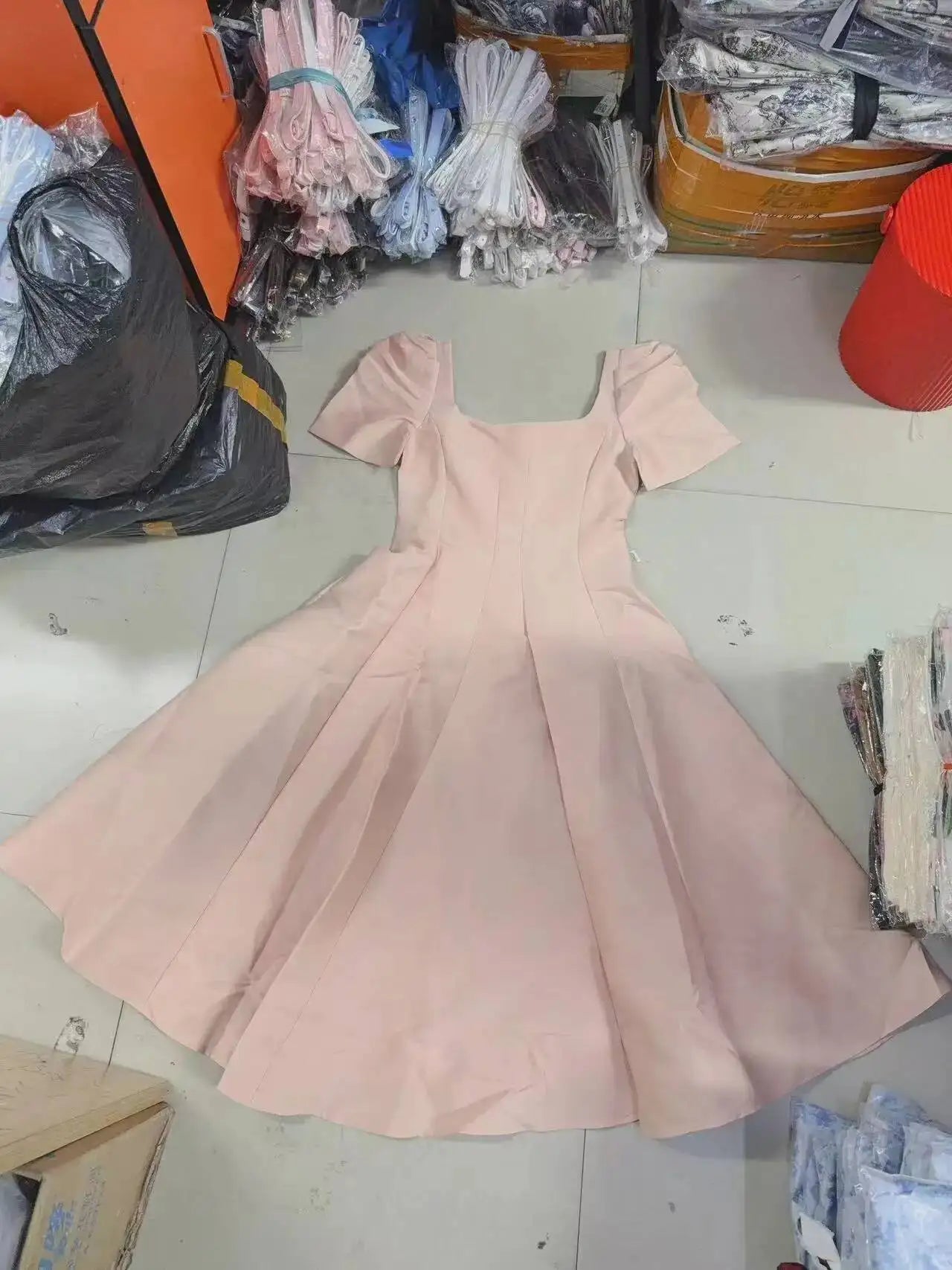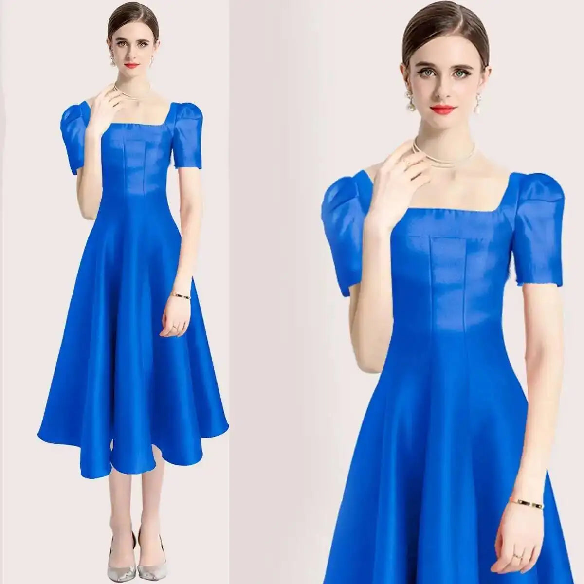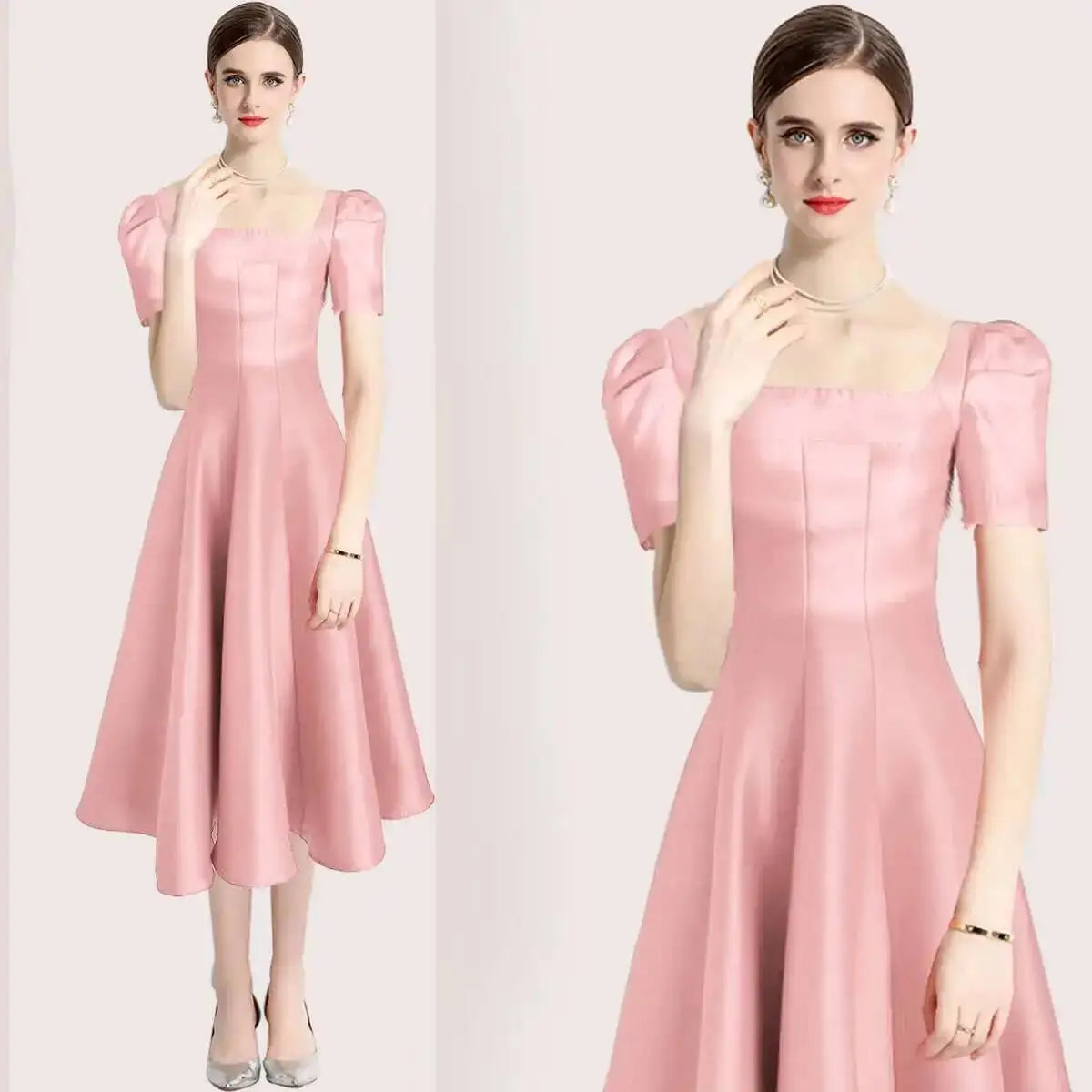 Summer Women Dress Long French Hepburn Style Fashion Party Elegant Square Collar Short Sleeve Midi Vestidos Party Robe