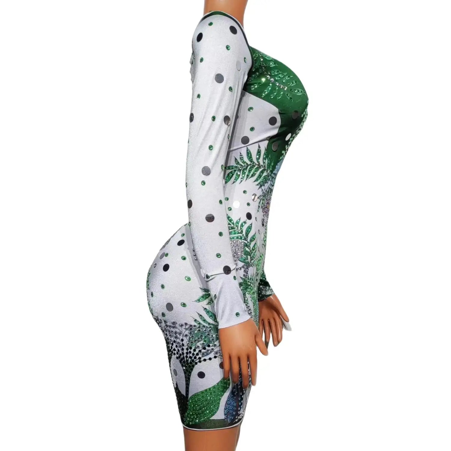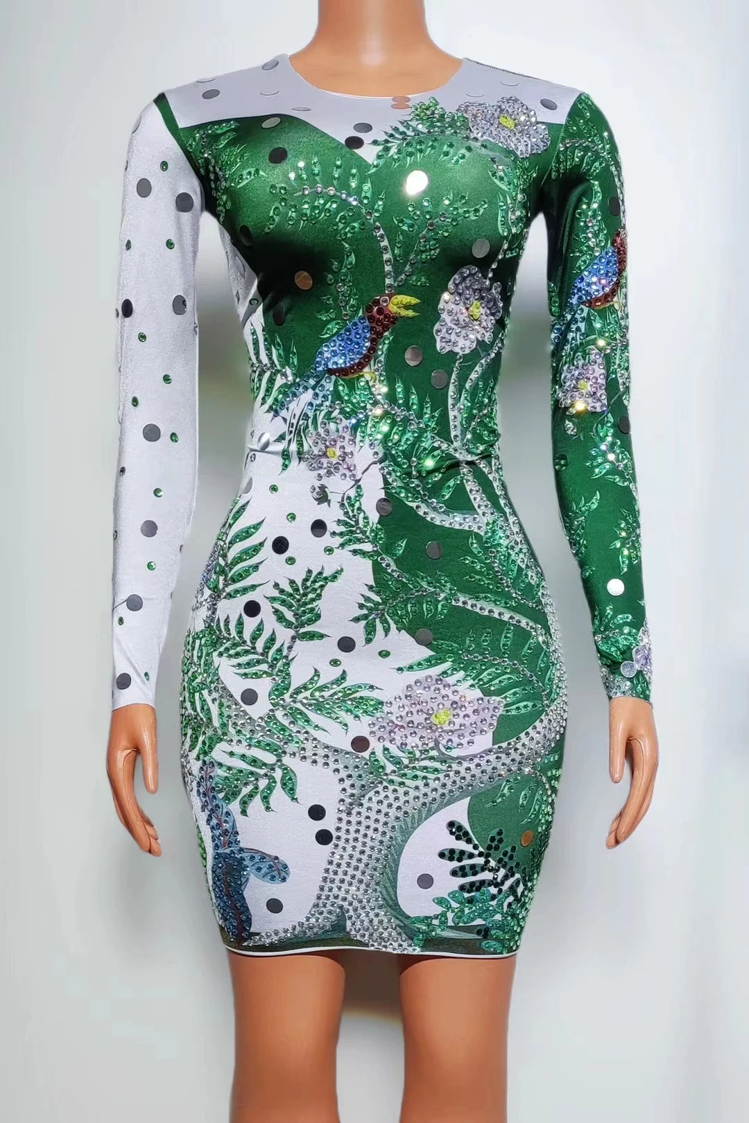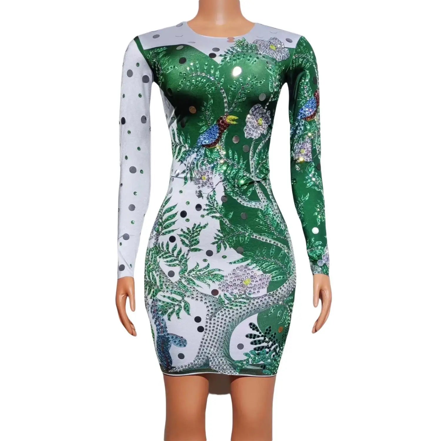Jungle Print Diamond Long Sleeved Slim Fit Dresses Women Sexy Green Singer Female Model Runway Performance Outfits Conglin
