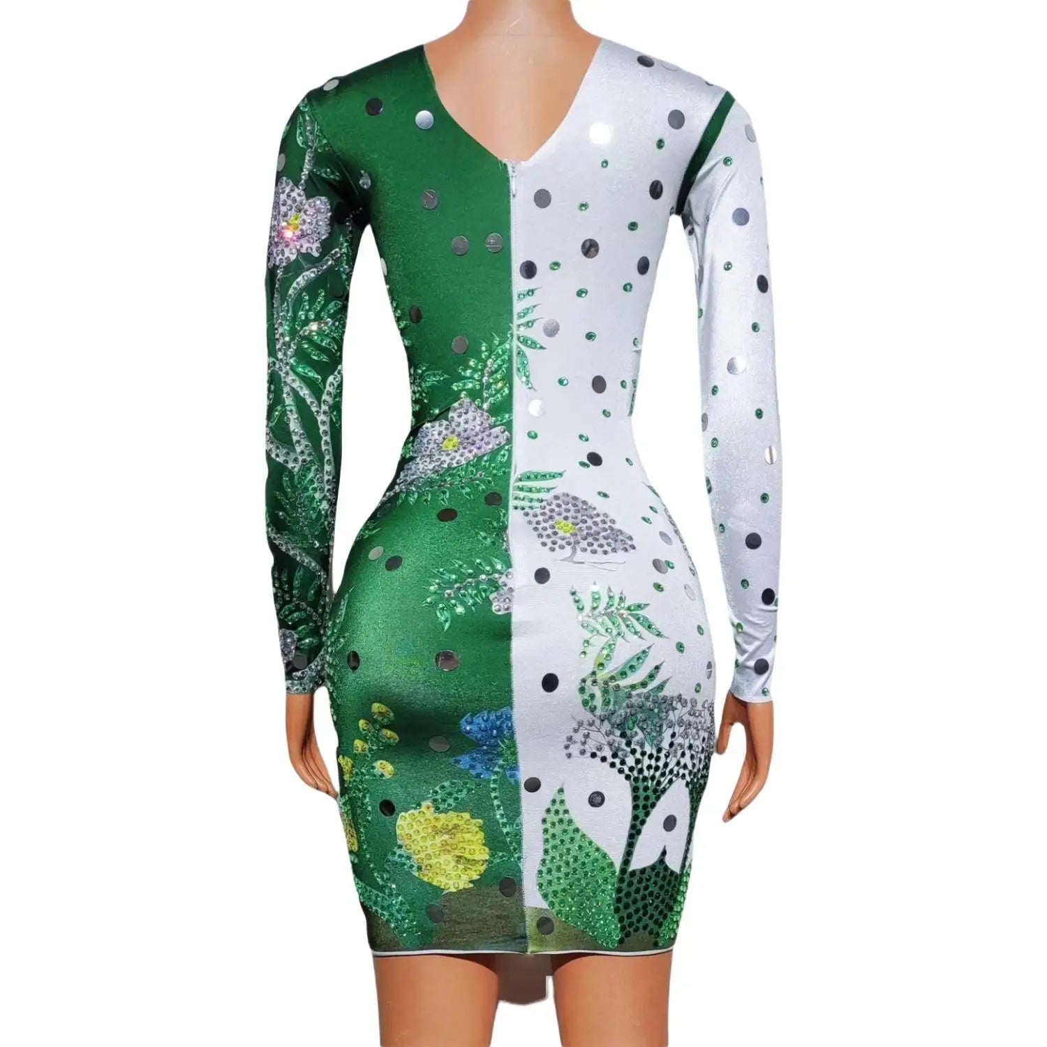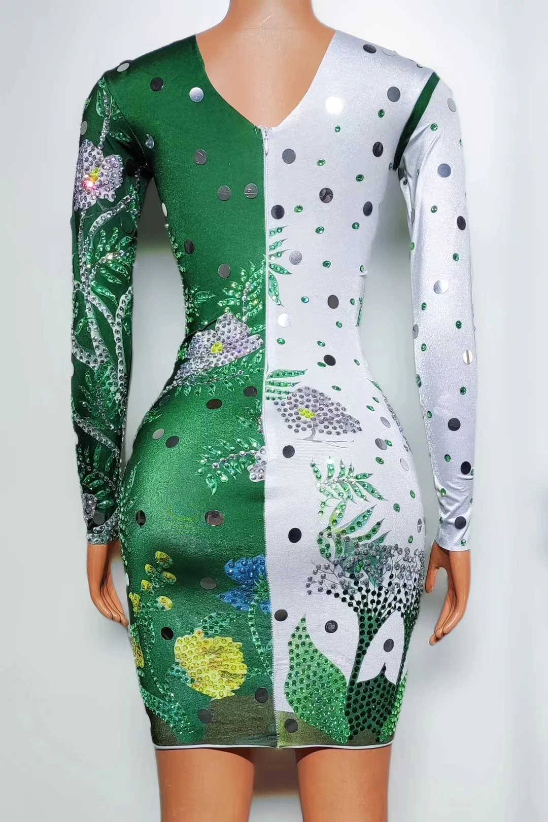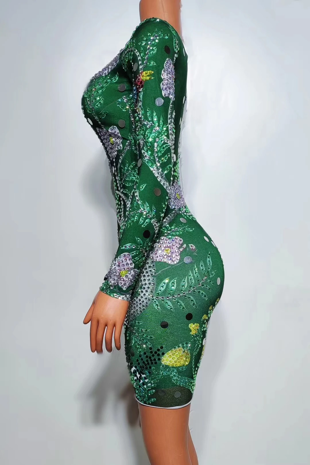 Jungle Print Diamond Long Sleeved Slim Fit Dresses Women Sexy Green Singer Female Model Runway Performance Outfits Conglin