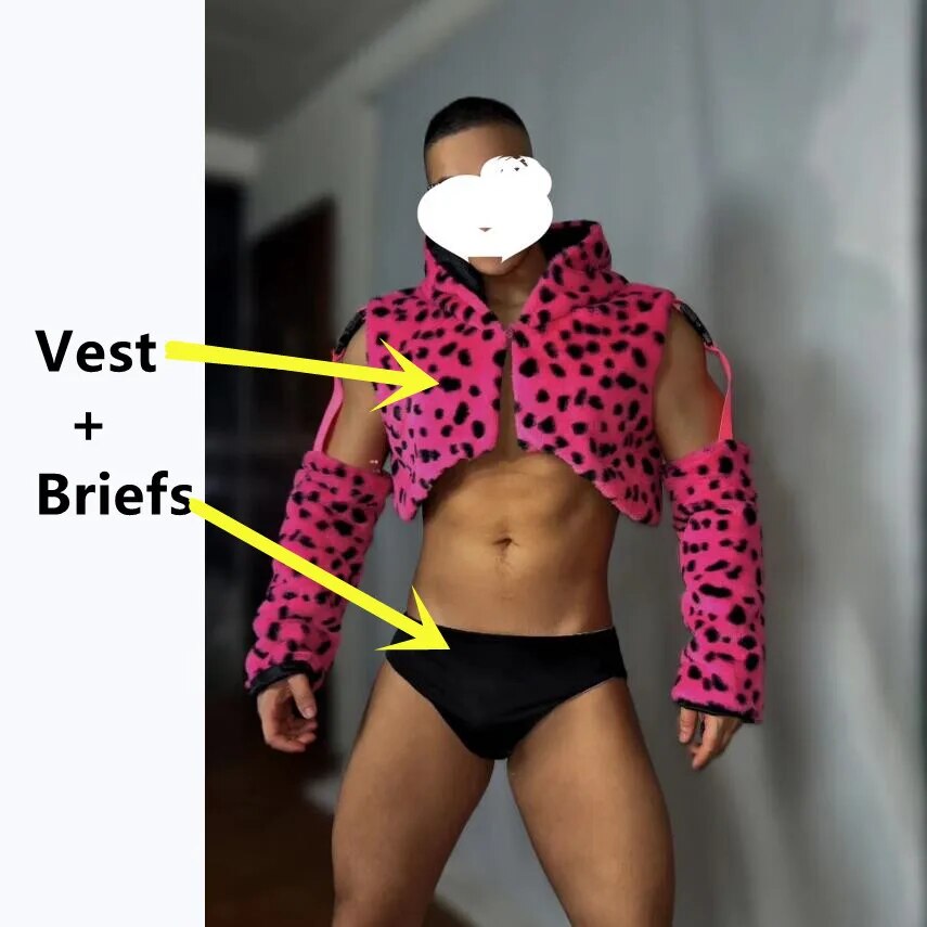 Leopard Faux Fur Vest Short Waistcoat Nightclub Bar Sexy Rave Outfit DJ Male Singer Dancer Club Party Performance Costume Rose