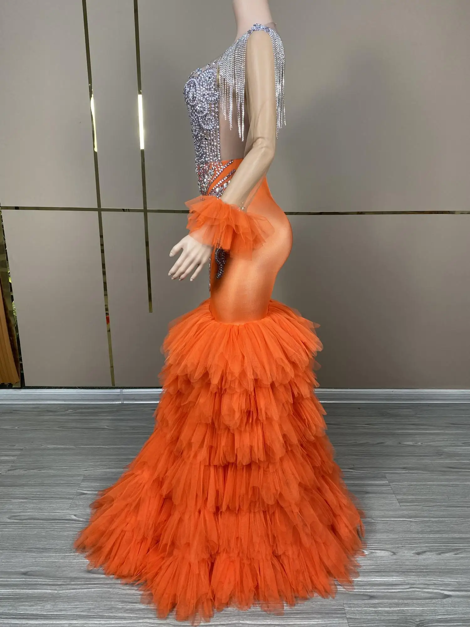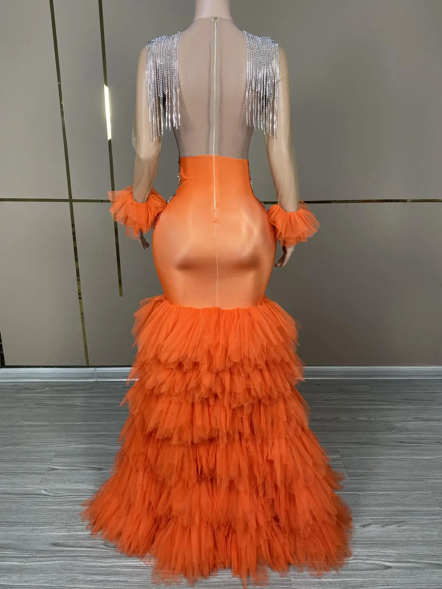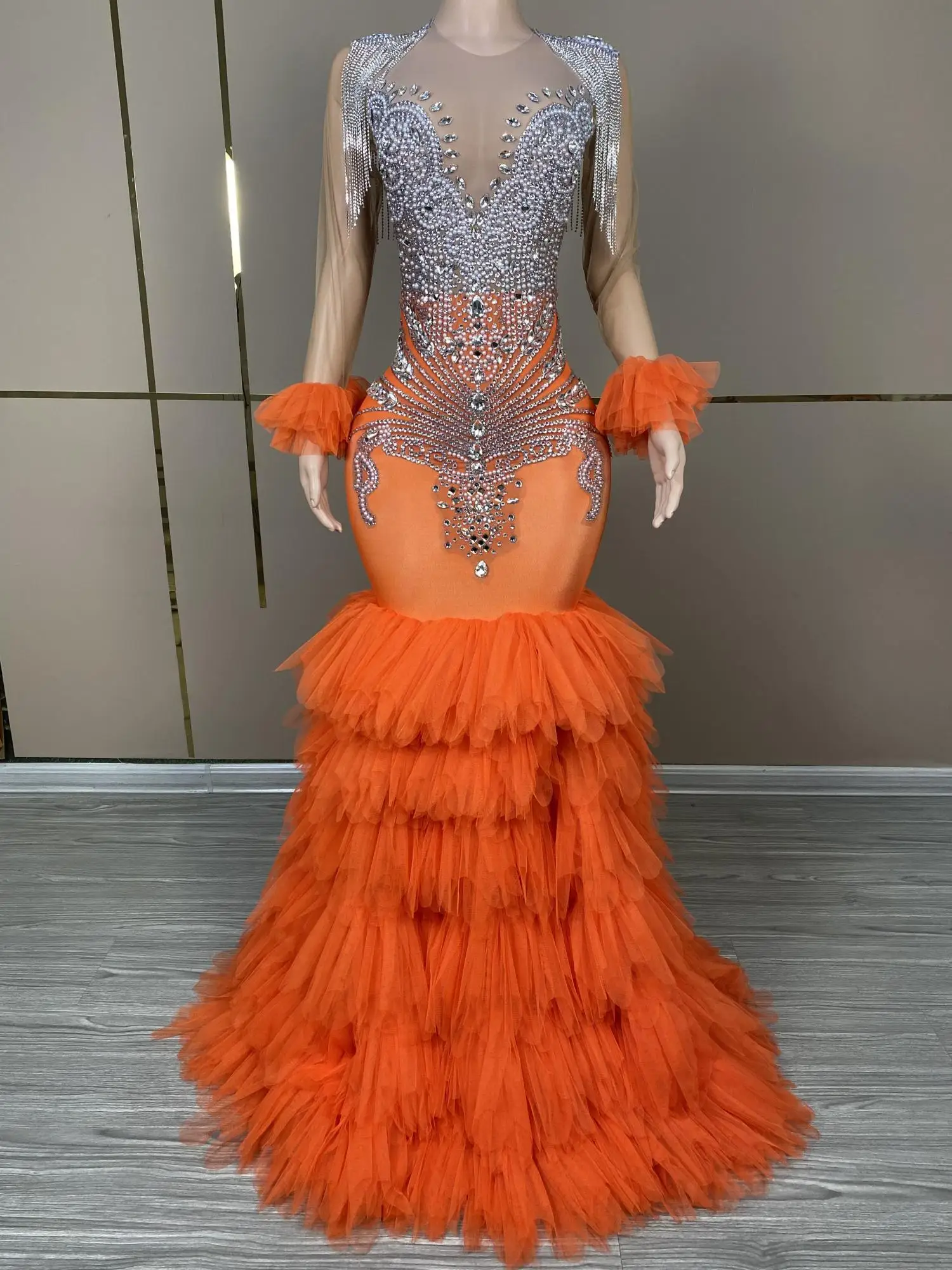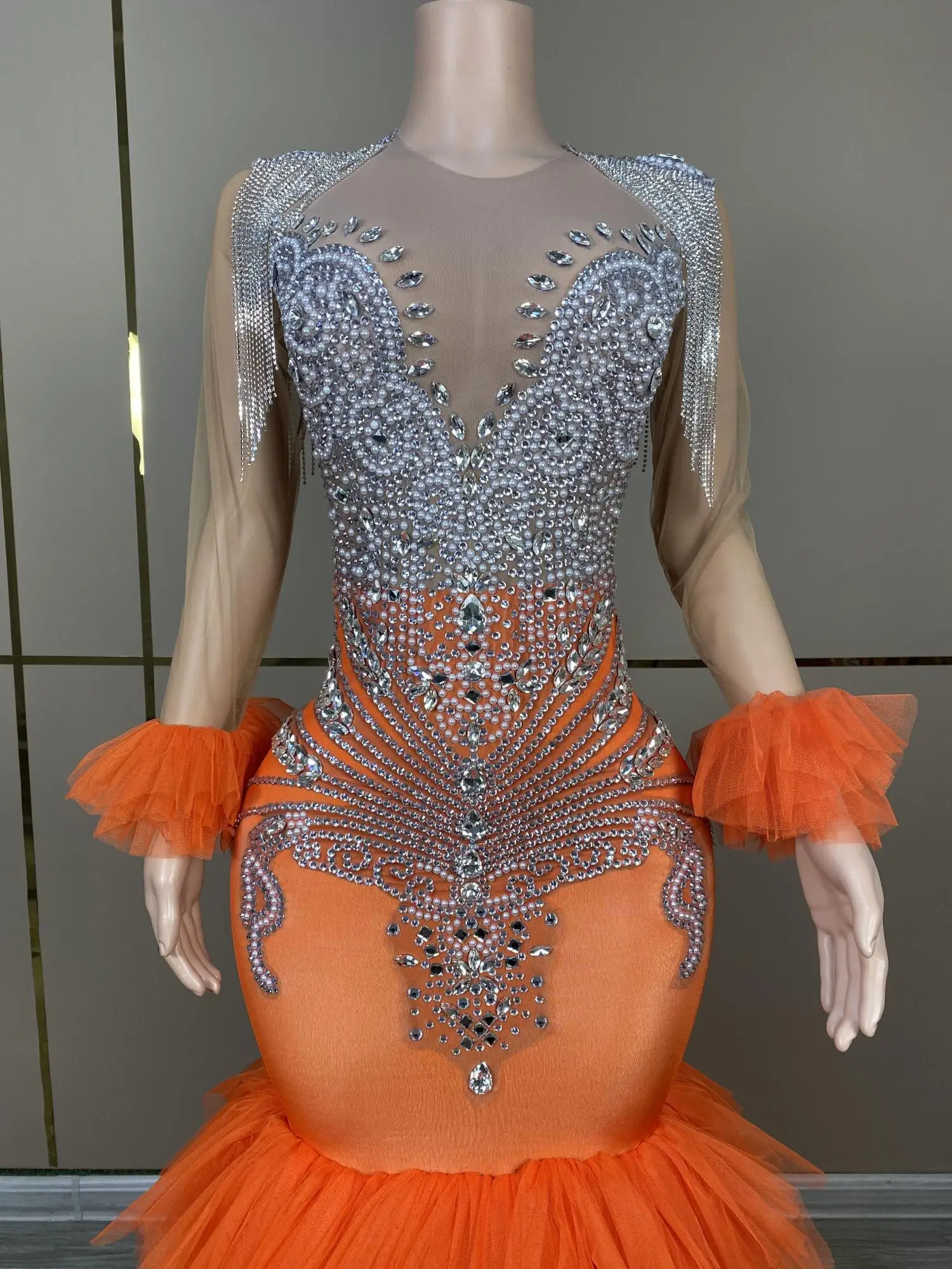 Long Glitter Prom Dresses 2024 Orange Mermaid Style Sexy Sheer Top Luxury Sparkly Beaded Silver Black Girl Formal Prom Gala Gowns