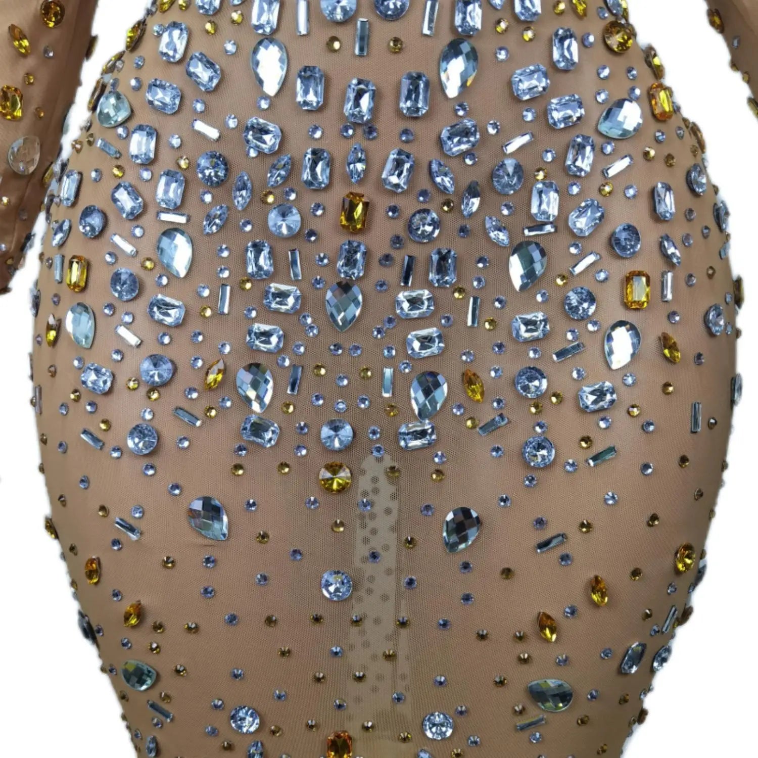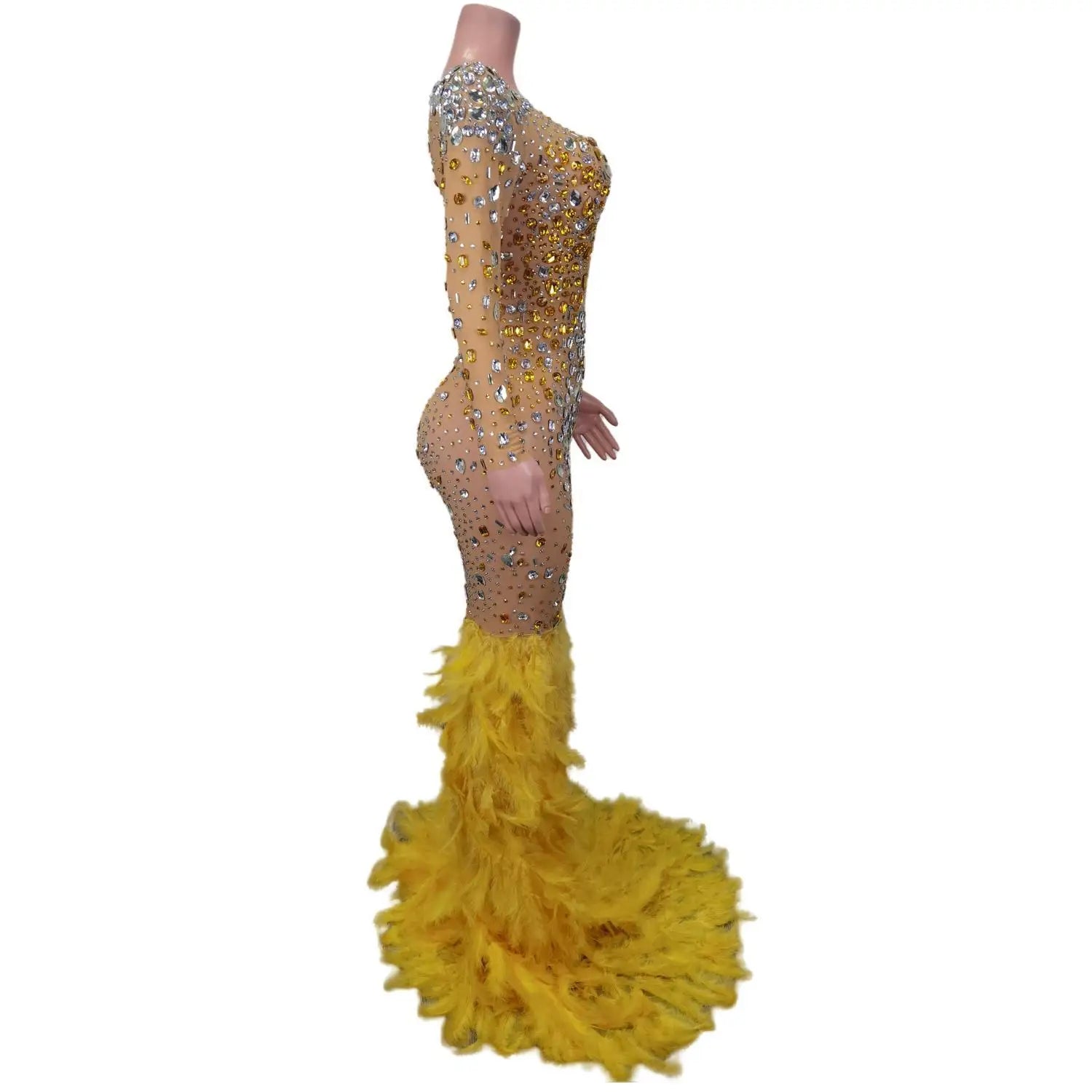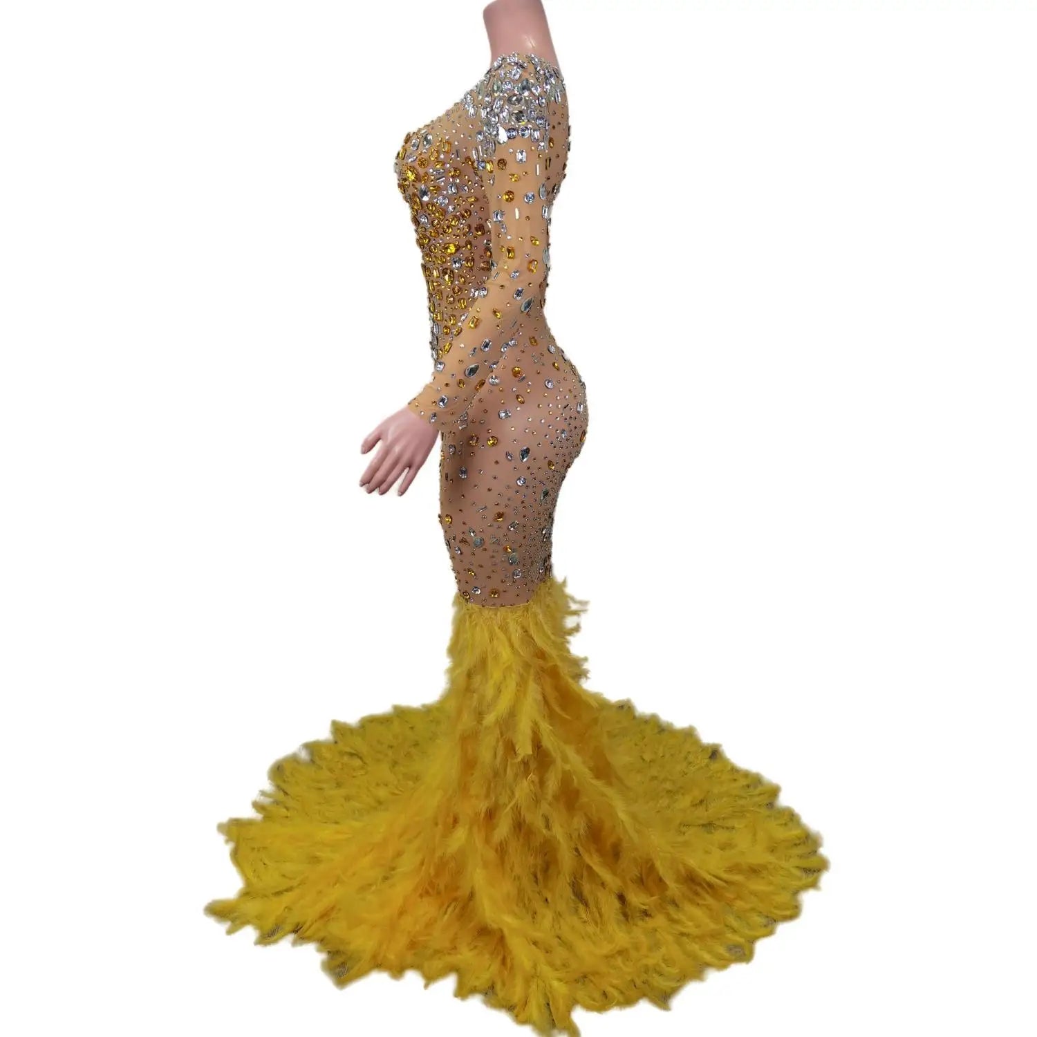 Long Gold Prom Dresses Sheer O-neck Sparkly Luxury Beaded Diamond Black Girls Feather Mermaid Prom Formal Gowns