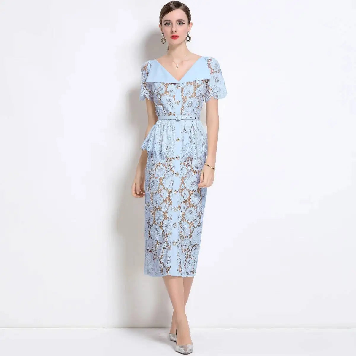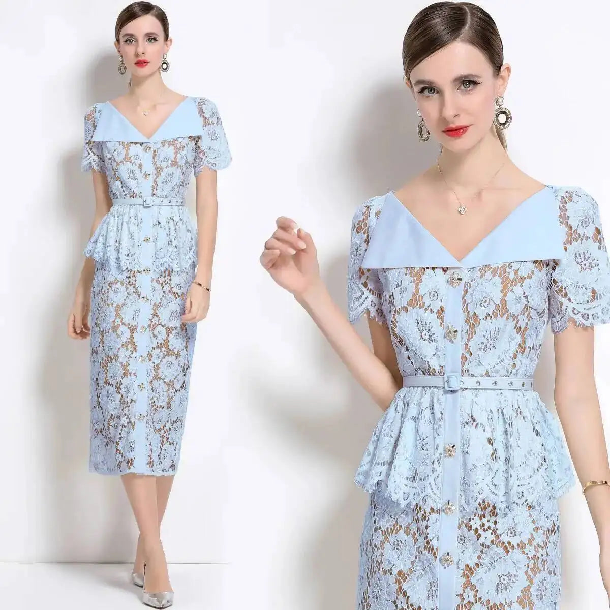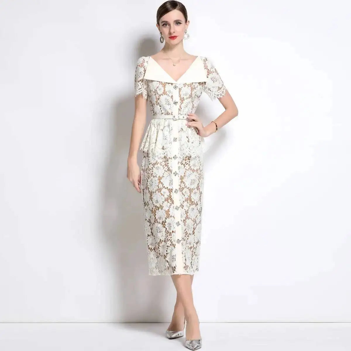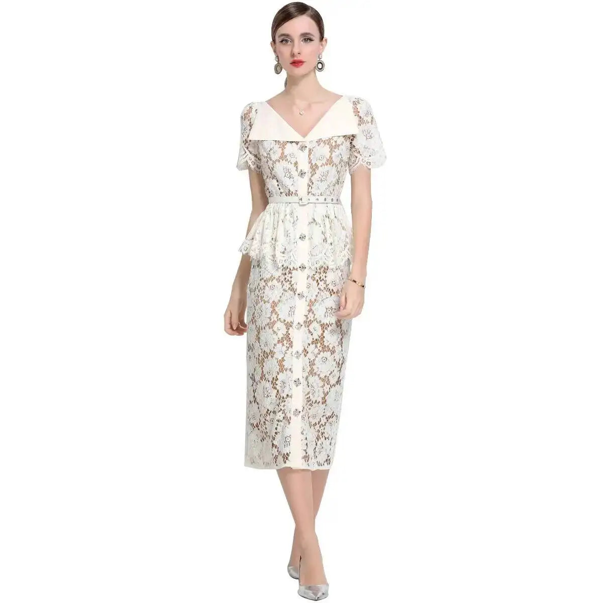 Long Lace Prom Dress Women Summer Dresses Short Sleeve Embroidery Single Breasted Beaded Diamonds Evening Party Midi Robe