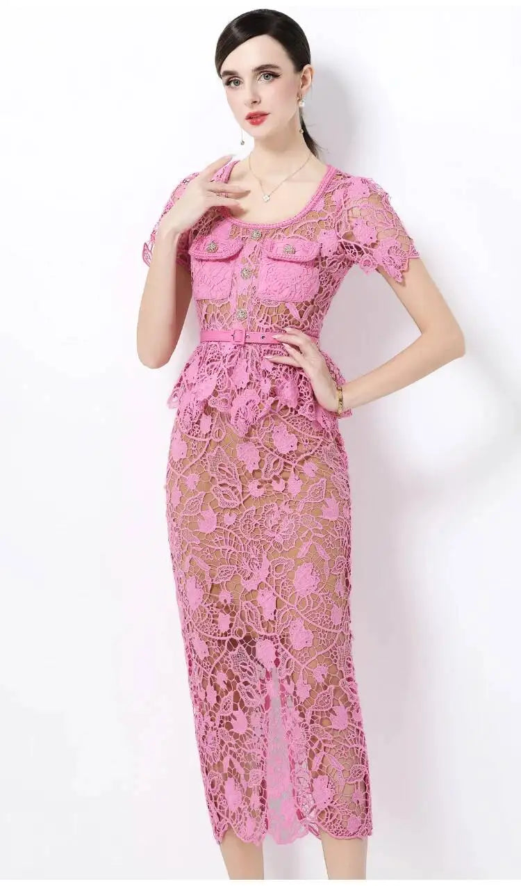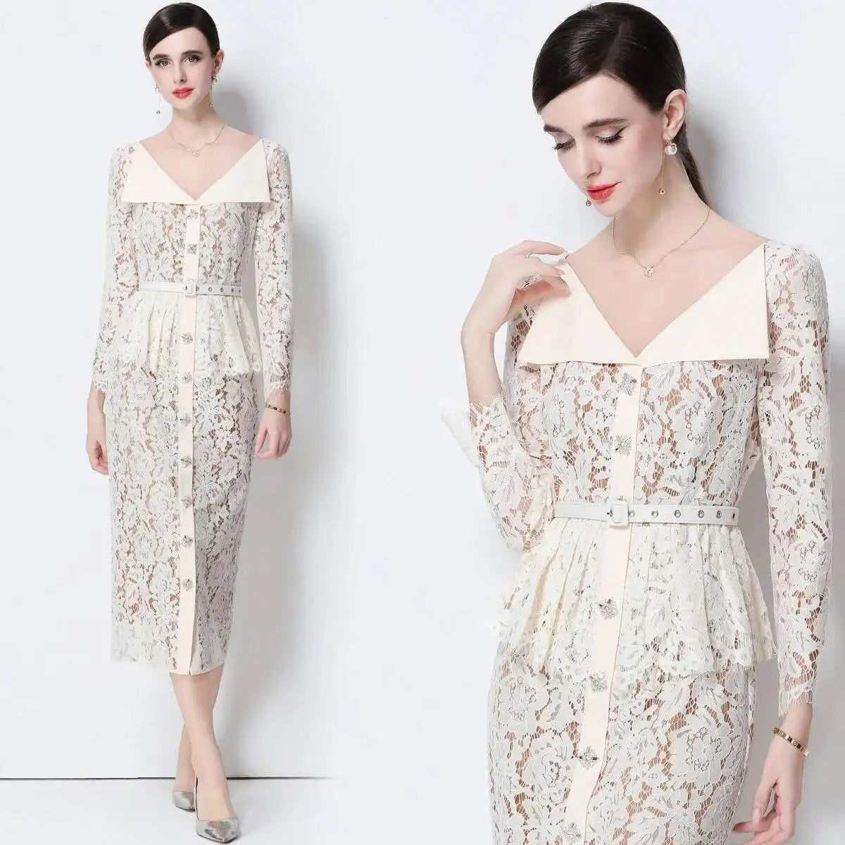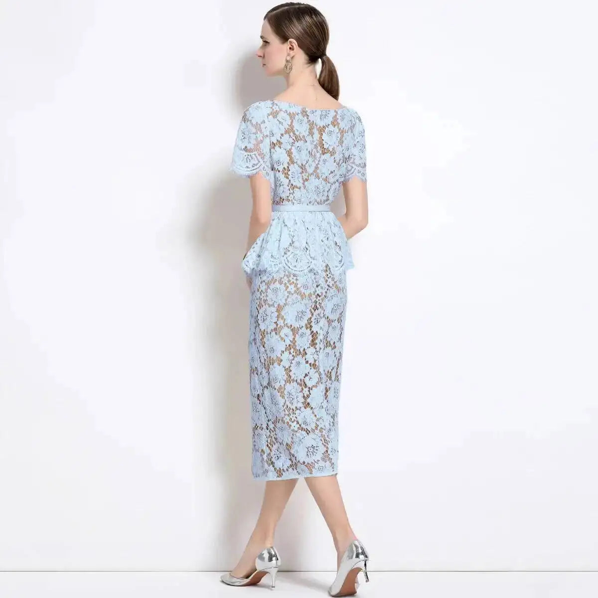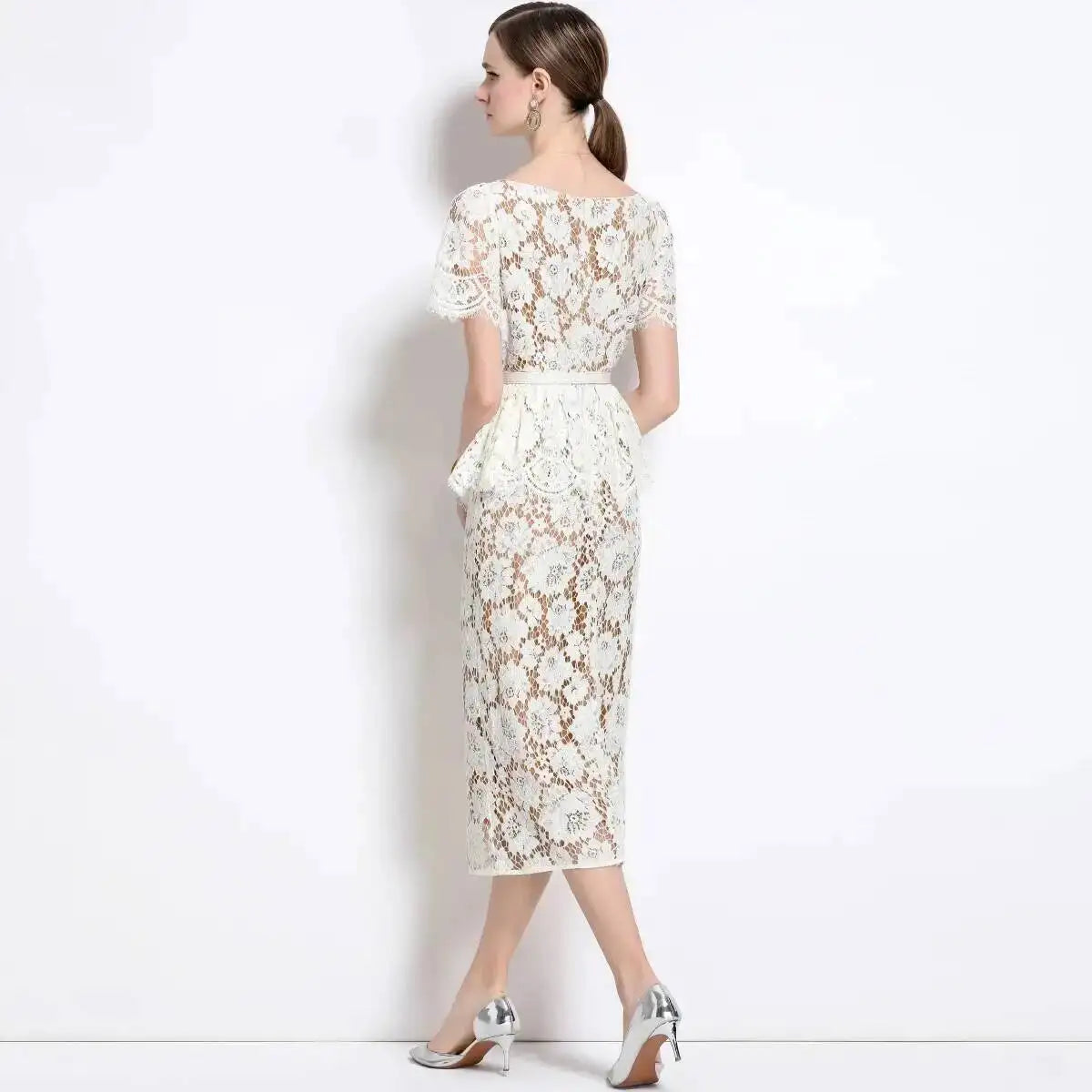 Long Lace Prom Dress Women Summer Dresses Short Sleeve Embroidery Single Breasted Beaded Diamonds Evening Party Midi Robe