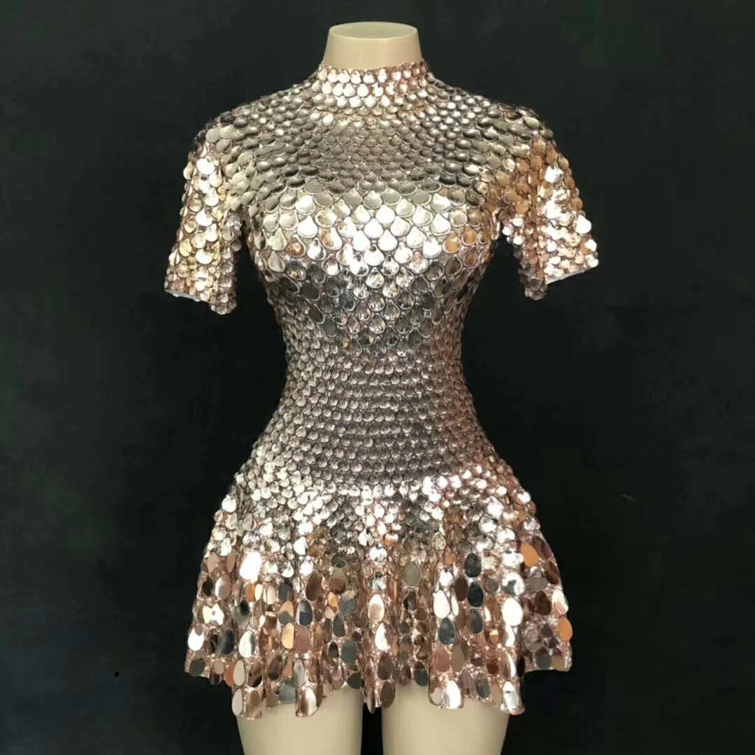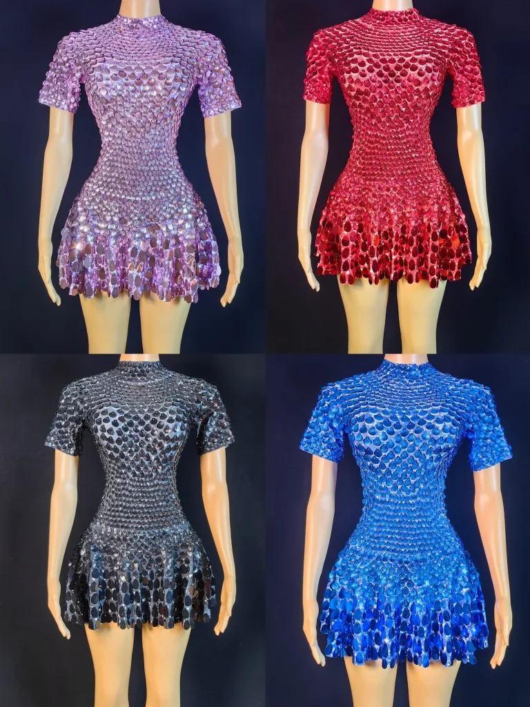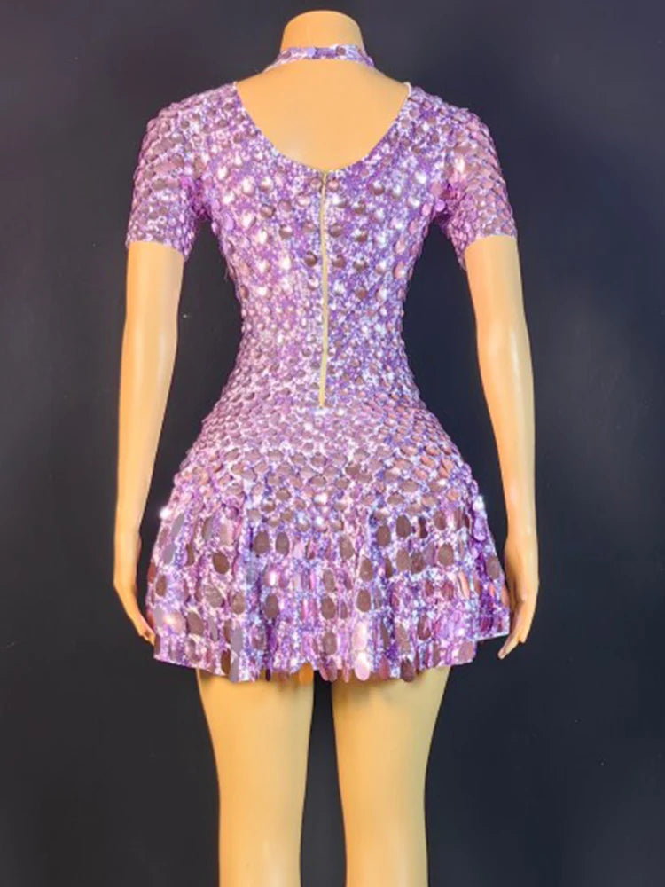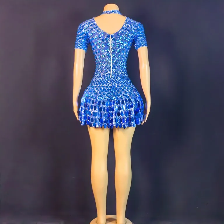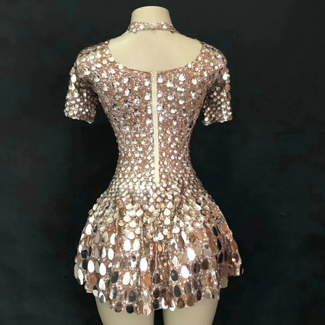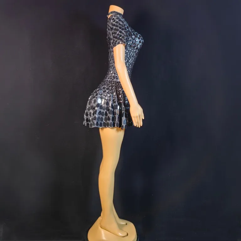 Lovely Sequins Mini Dress Sexy Nightclub Leotard Shining Costume Celebrate Rhinestone Bodysuit Birthday Silver Dresses