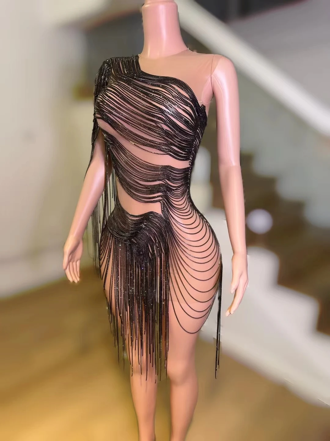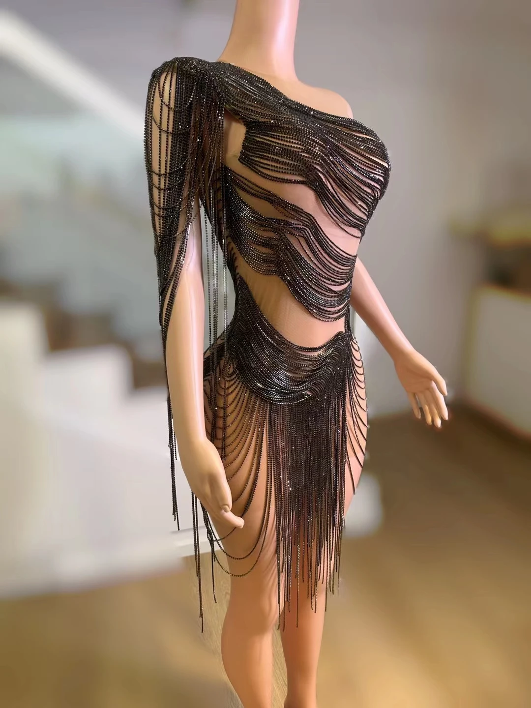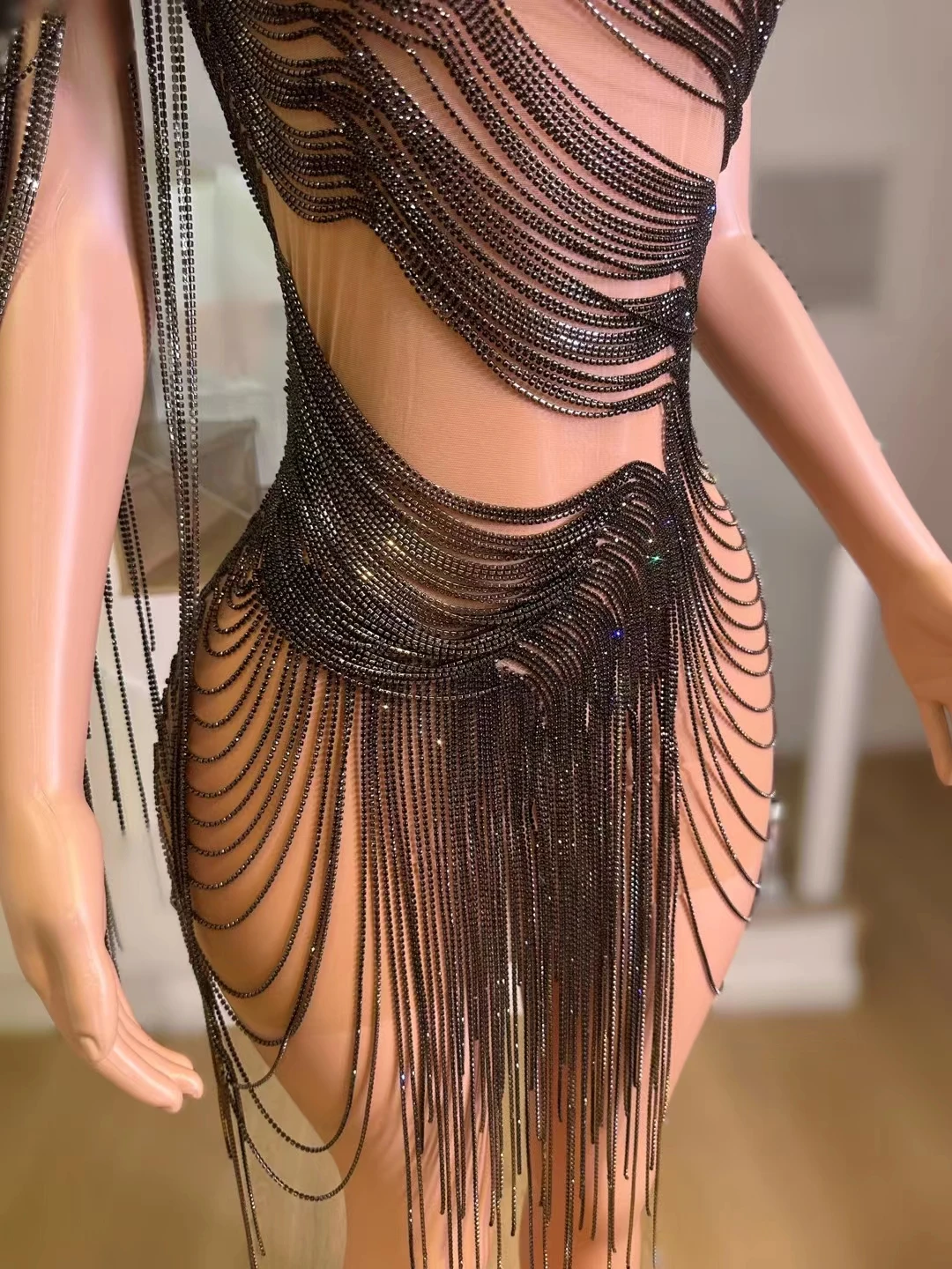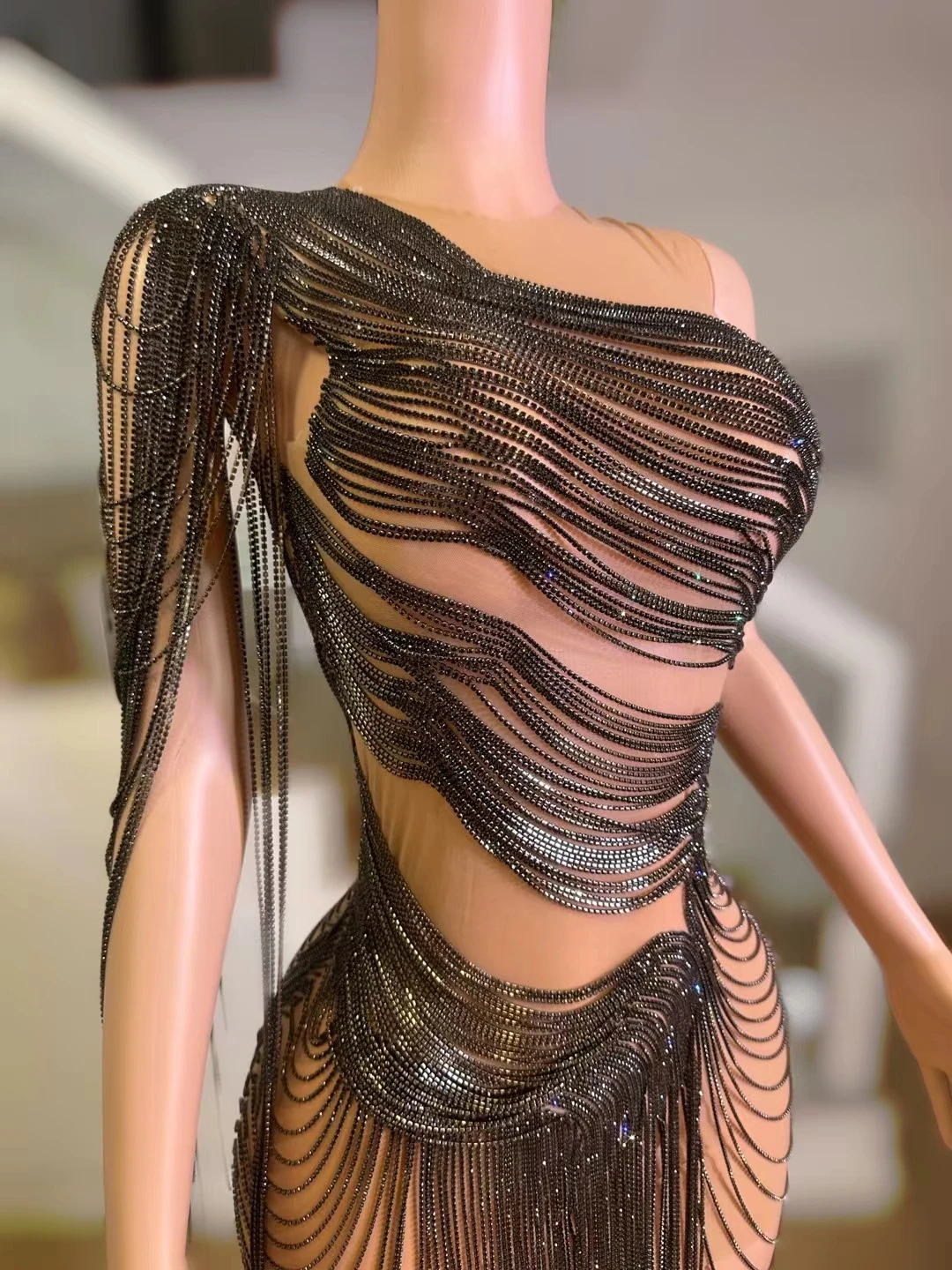 Luxurious Crystal Chains Birthday Celebrate Evening Prom Dress Women Sexy See Through Photography Singer Show Stage Wear Fasi