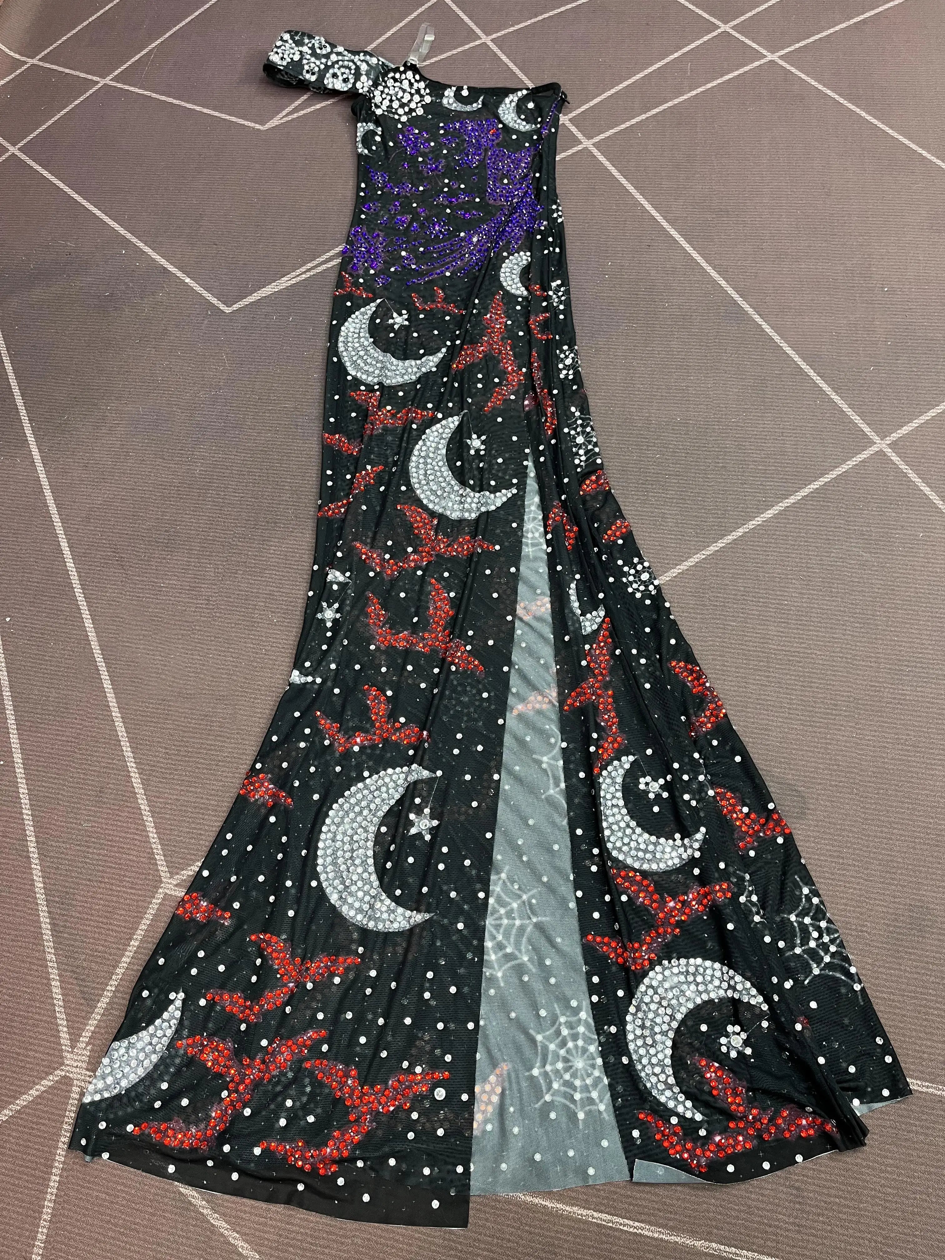 Make a dramatic, spooky‑glam entrance with this Luxurious Halloween Element Shining Rhinestones Off‑the‑Shoulder High‑Split Dress — a couture piece that blends seasonal motifs with red‑carpet craftsmanship. Designed for Halloween parties, birthday celebrations, stage performances, and photoshoots, this gown pairs elegant tailoring with theatrical embellishment to deliver high‑impact sparkle and movement.