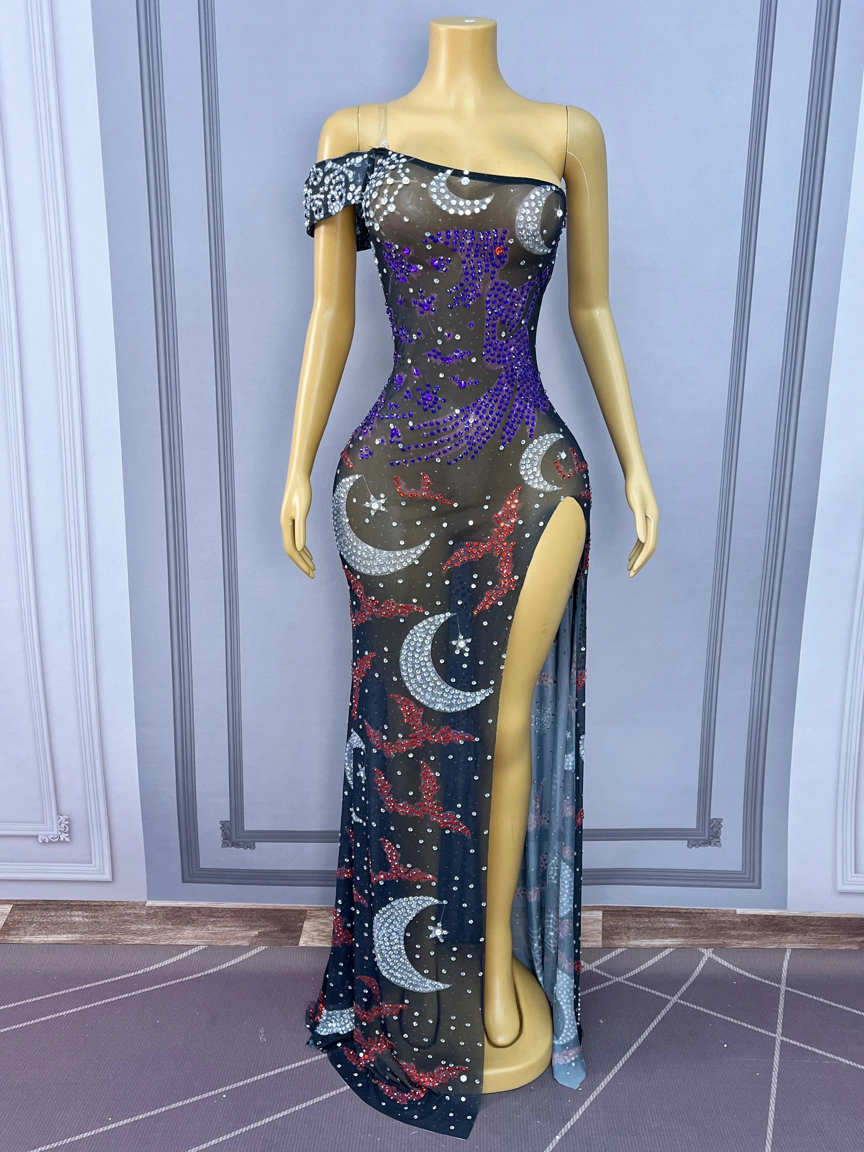 Luxurious Halloween Element Shining Rhinestones Off-the-shoulder High Split Dress Birthday Celebrate Show Gowns Stage Wear