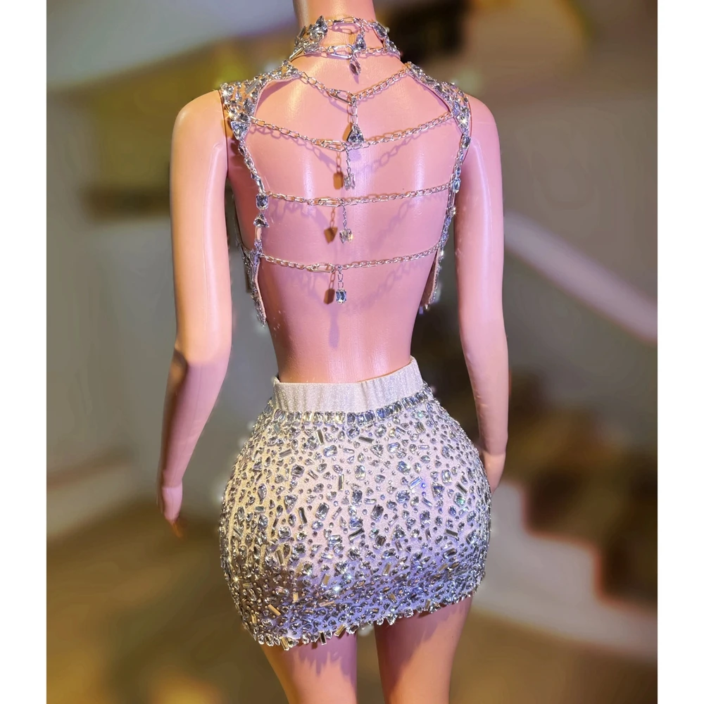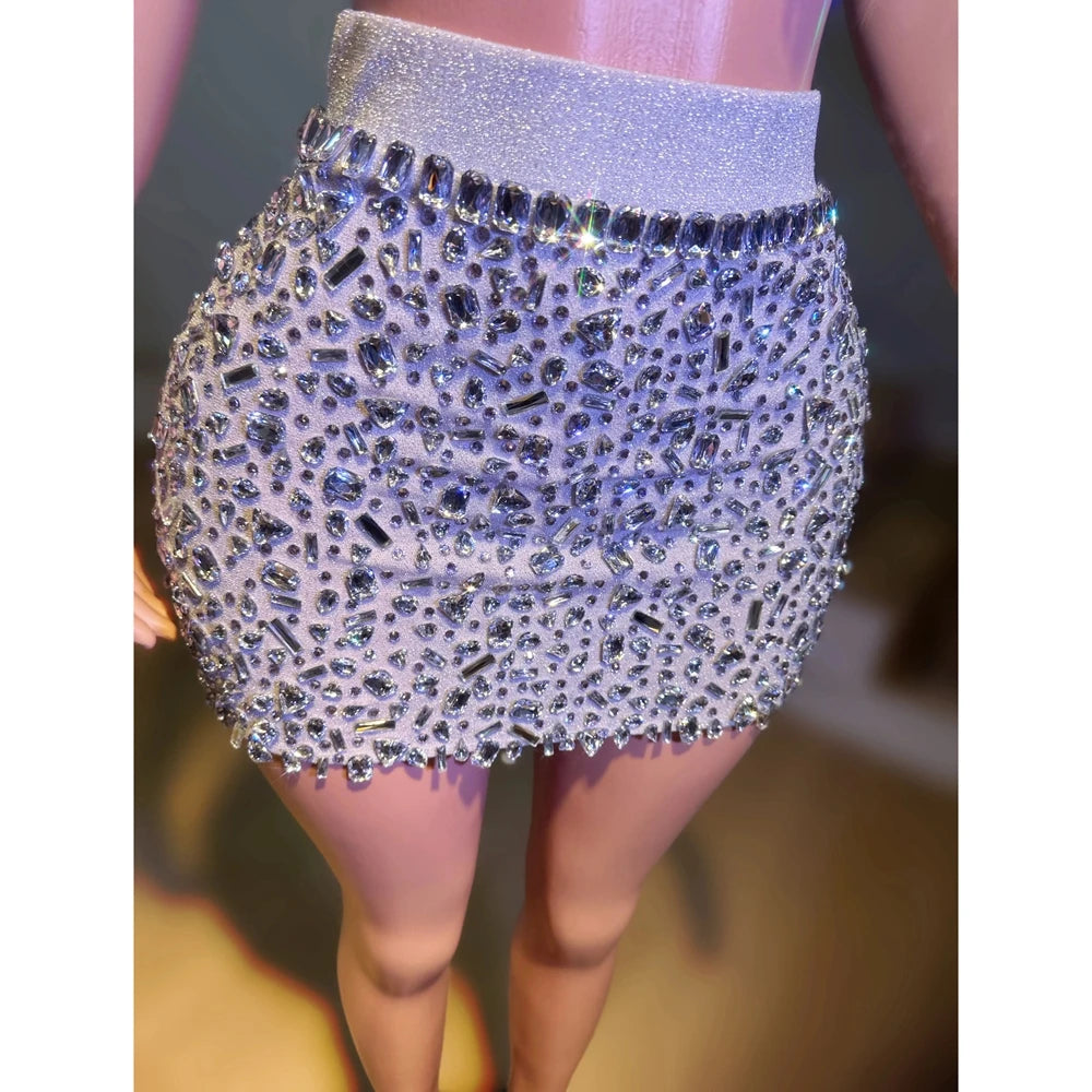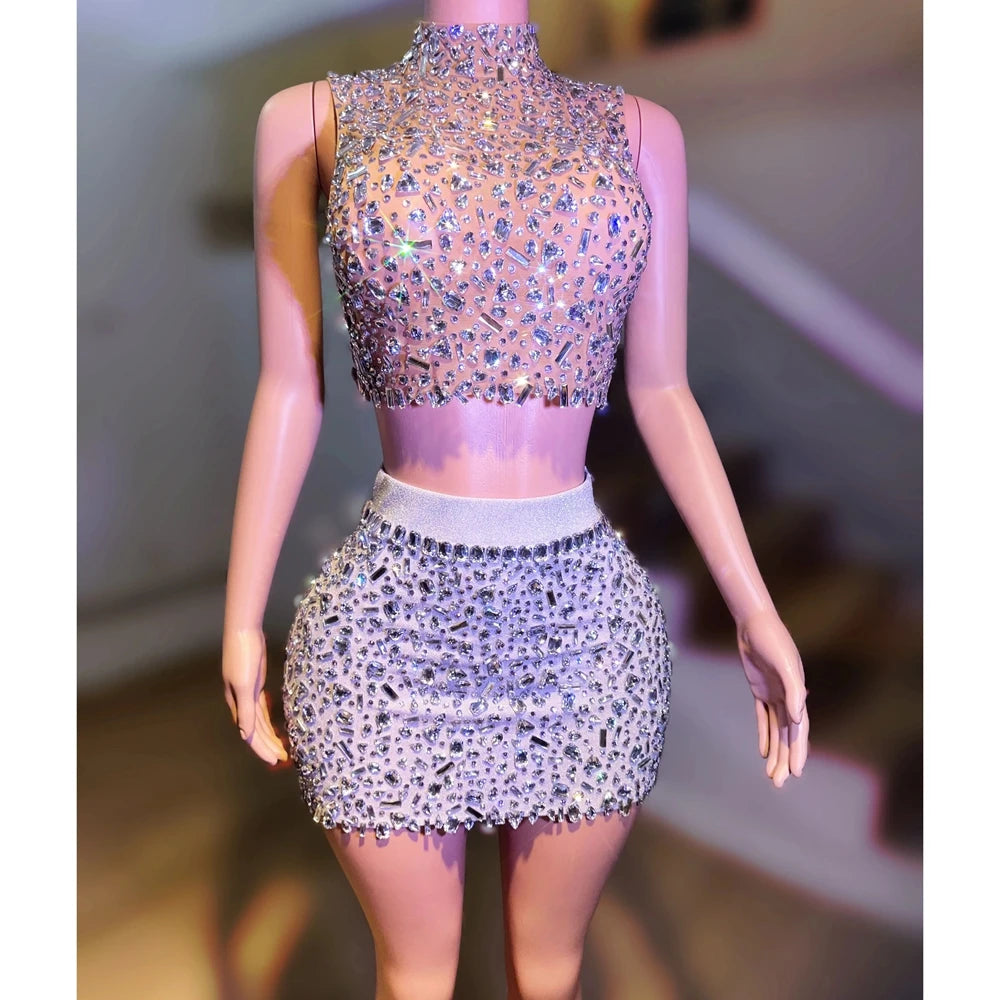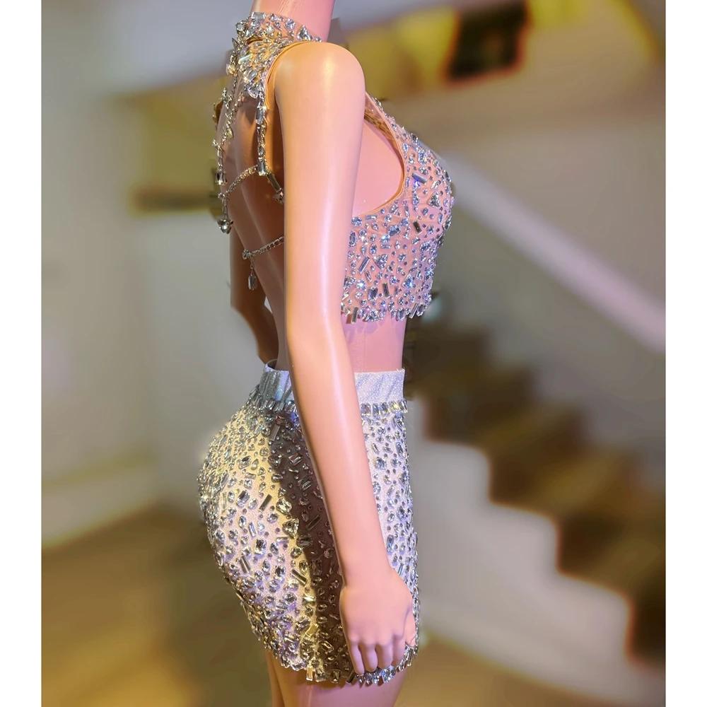 Luxurious Rhinestones Celebrate Evening Birthday Dress Crystals Top Short Skirt Two Pieces Performance Costume Show Stage Wear