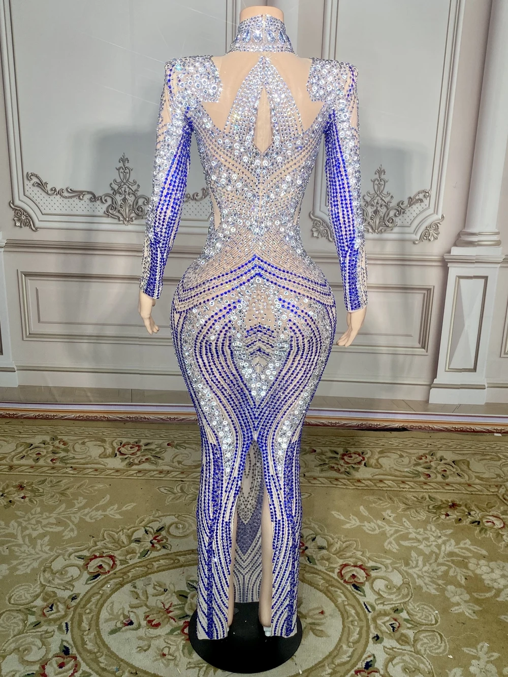Luxurious Rhinestones Long Sleeve Dress for Women Sexy Evening Prom Birthday Celebrate Dress Women Photo Shoot Stage Wear