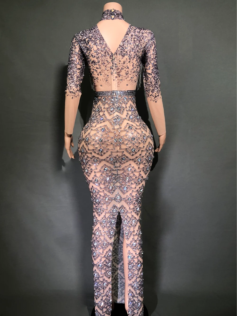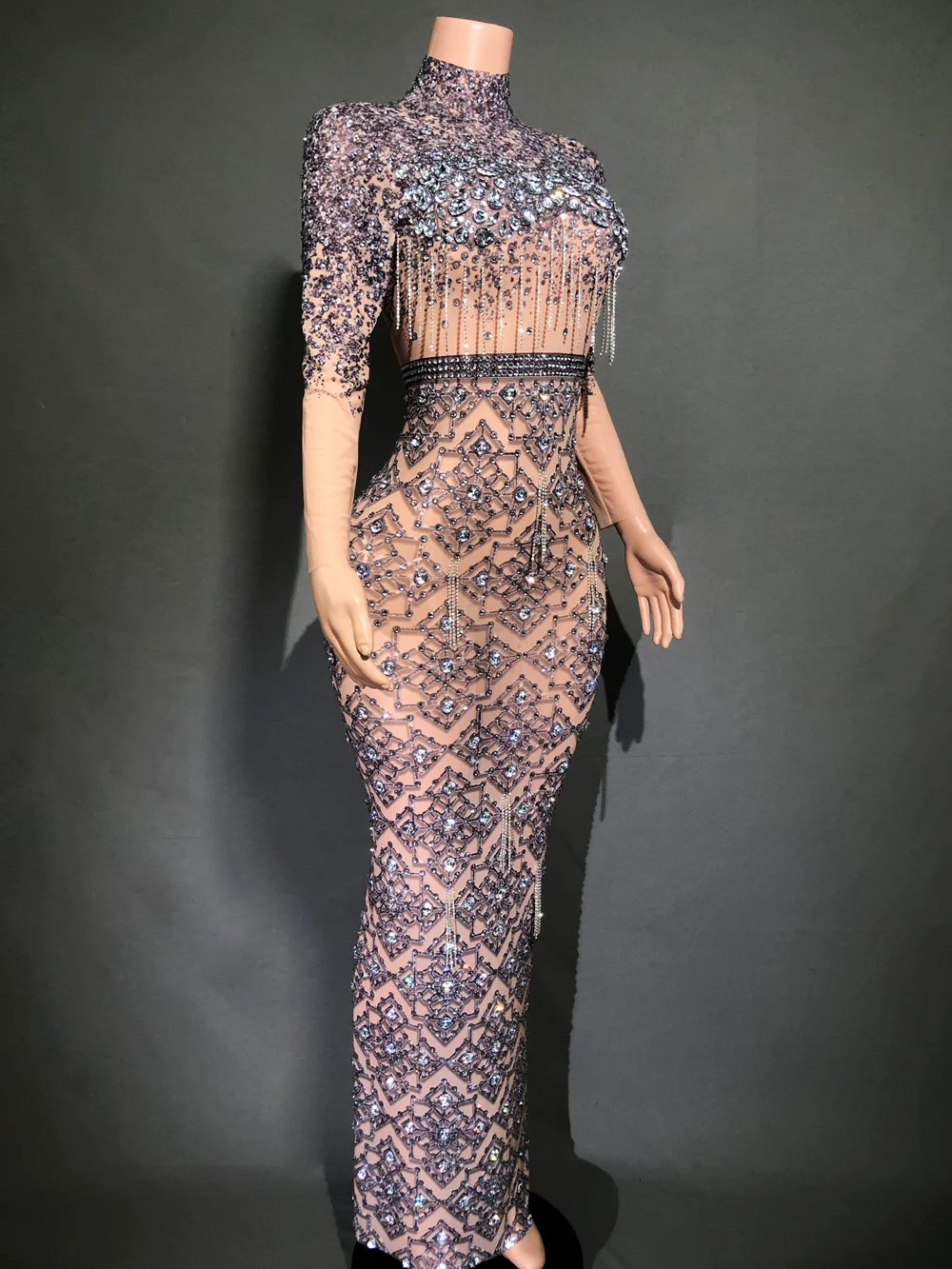 Luxurious Rhinestones Mesh Transparent Long Sleeve Dress for Women Sexy Birthday Celebrate Evening Prom Dresses