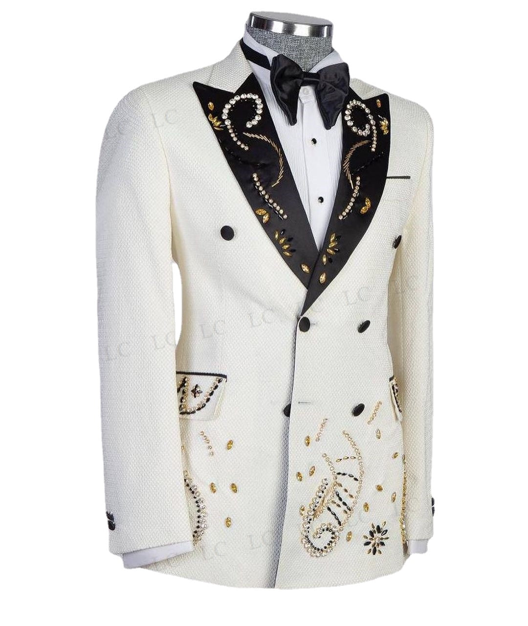 This luxurious 2-piece men's suit set features a blazer and pants adorned with crystals, diamonds, and beadings. The satin lapel adds a touch of elegance and sophistication to the ensemble. Perfect for formal events such as prom, weddings, and groom attire, this suit is designed for a fashion-forward look. Tailored for a comfortable and stylish fit, this suit is available in plus sizes and can be customized for a perfect fit. Make a style statement with this luxurious and fashionable suit at your next special occasion.
