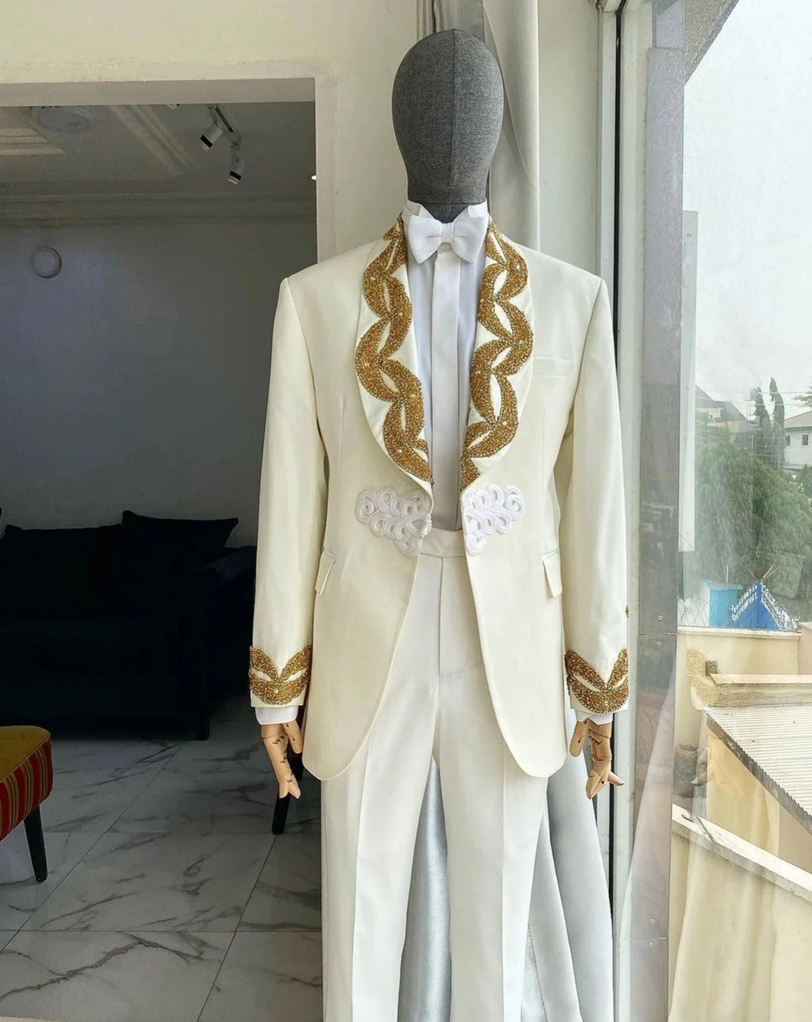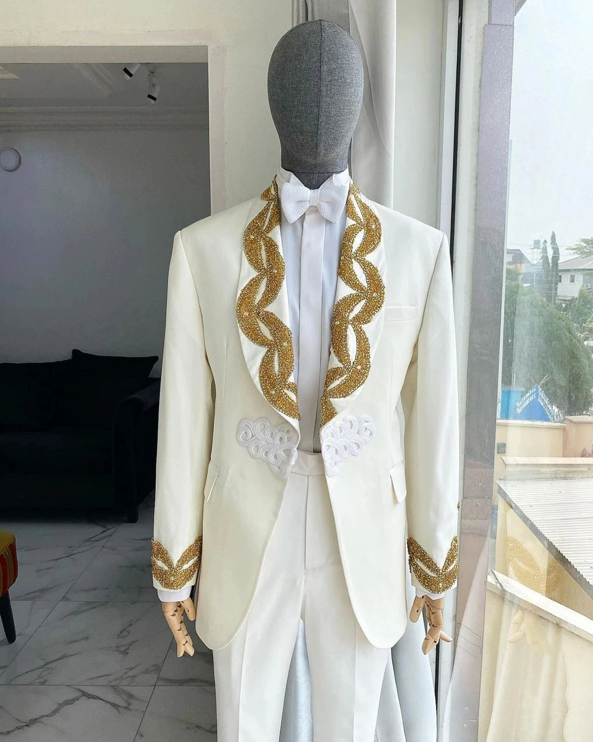 Elevate your formal attire with this luxurious 2-piece men's suit adorned with gold sequins and beads. The set includes a blazer with Chinese knot detailing, wide lapels, and matching pants, perfect for formal events like proms, weddings, and groom attire. Available in plus sizes, this suit is tailored to perfection for a sophisticated and elegant look