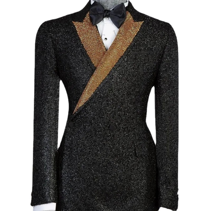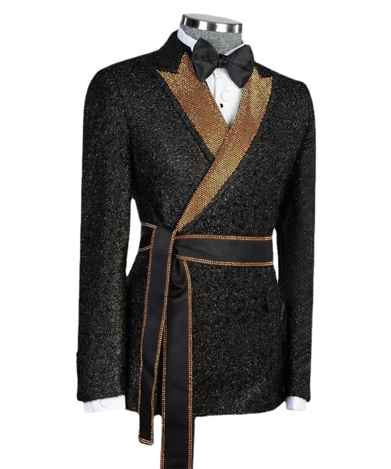 This luxurious one-piece men's suit features intricate beadings and diamonds, exuding luxury and style. The blazer comes with a unique belt detail and a single button closure, perfect for fashion-forward individuals attending proms, weddings, or formal events. Tailored for plus sizes, this custom suit is ideal for a groom looking to make a statement on their special day