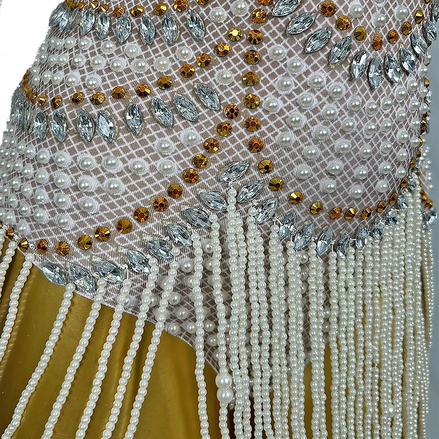 Elevate your stage presence with theLuxury Crystal Pearl Tassel Banquet Jumpsuit, a dazzling performance piece designed for dancers, entertainers, and anyone who wants to command attention at banquets, galas, and evening events. This short-sleeve, tight mini bodysuit blends sophisticated couture details with practical performance features, creating a look that is both glamorous and movement-friendly. The silhouette is tailored to hug the body’s contours, highlighting the waist and elongating the legs while allowing full freedom for choreography and dramatic poses.