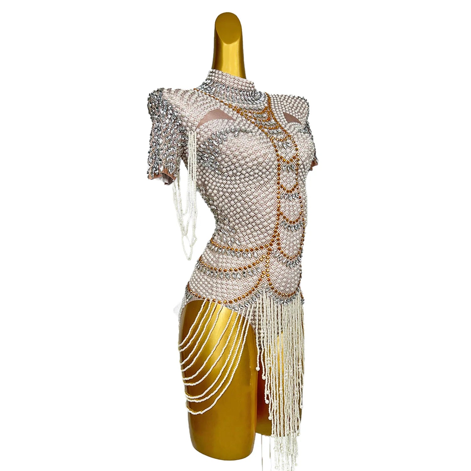 Luxury Crystal Pearl Tassel Banquet Jumpsuit Dancer Stage Performance Costume Women Short Sleeve Tight Mini Bodysuit