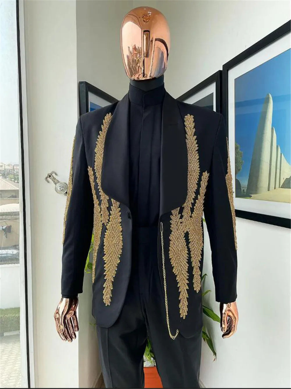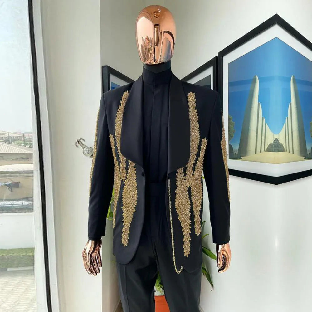 Make a statement at your wedding with this luxurious crystals beaded suit for men. Custom made with a shawl lapel blazer, this ensemble is perfect for banquets and special occasions. The groom wear tuxedo exudes sophistication and style, making it an ideal choice for your wedding day. Costume Homme Pour Mariage.