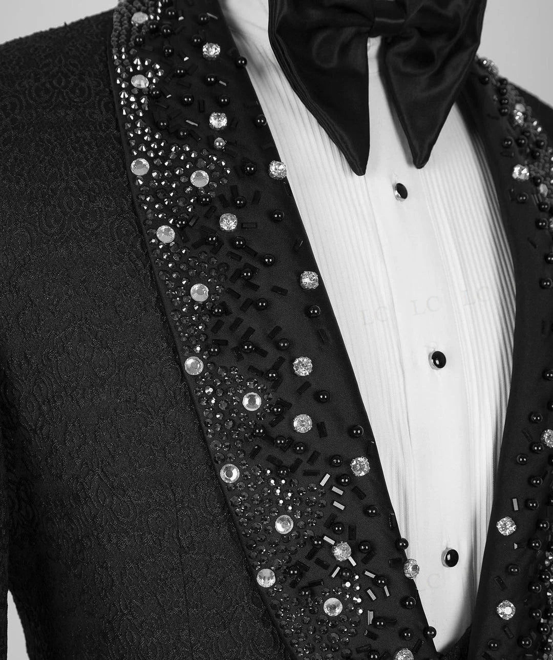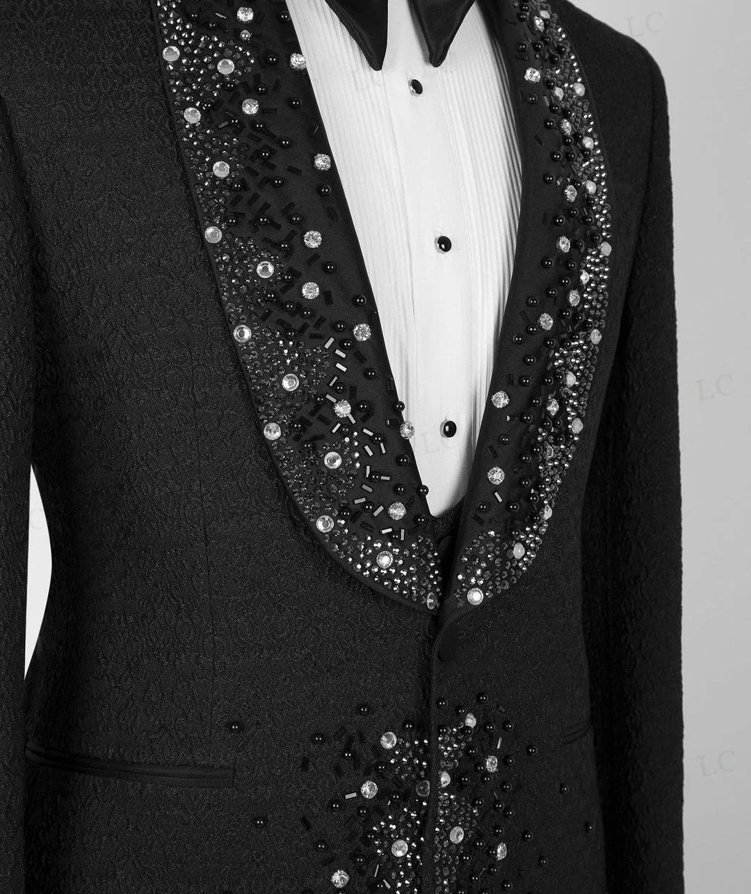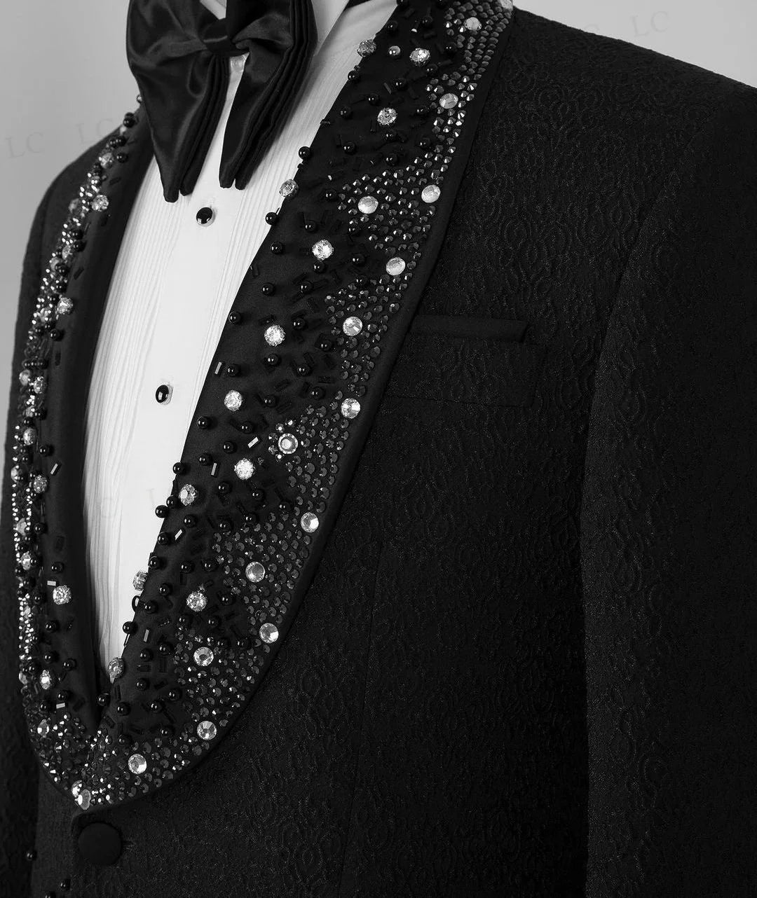 This luxurious men's suit set is perfect for proms, weddings, and formal events. The set includes a stylish blazer and vest adorned with exquisite crystals and beading. The one-button design adds a touch of sophistication, making it ideal for work wear or special occasions. Tailored to perfection, this suit is available in plus sizes for a comfortable and stylish fit.
