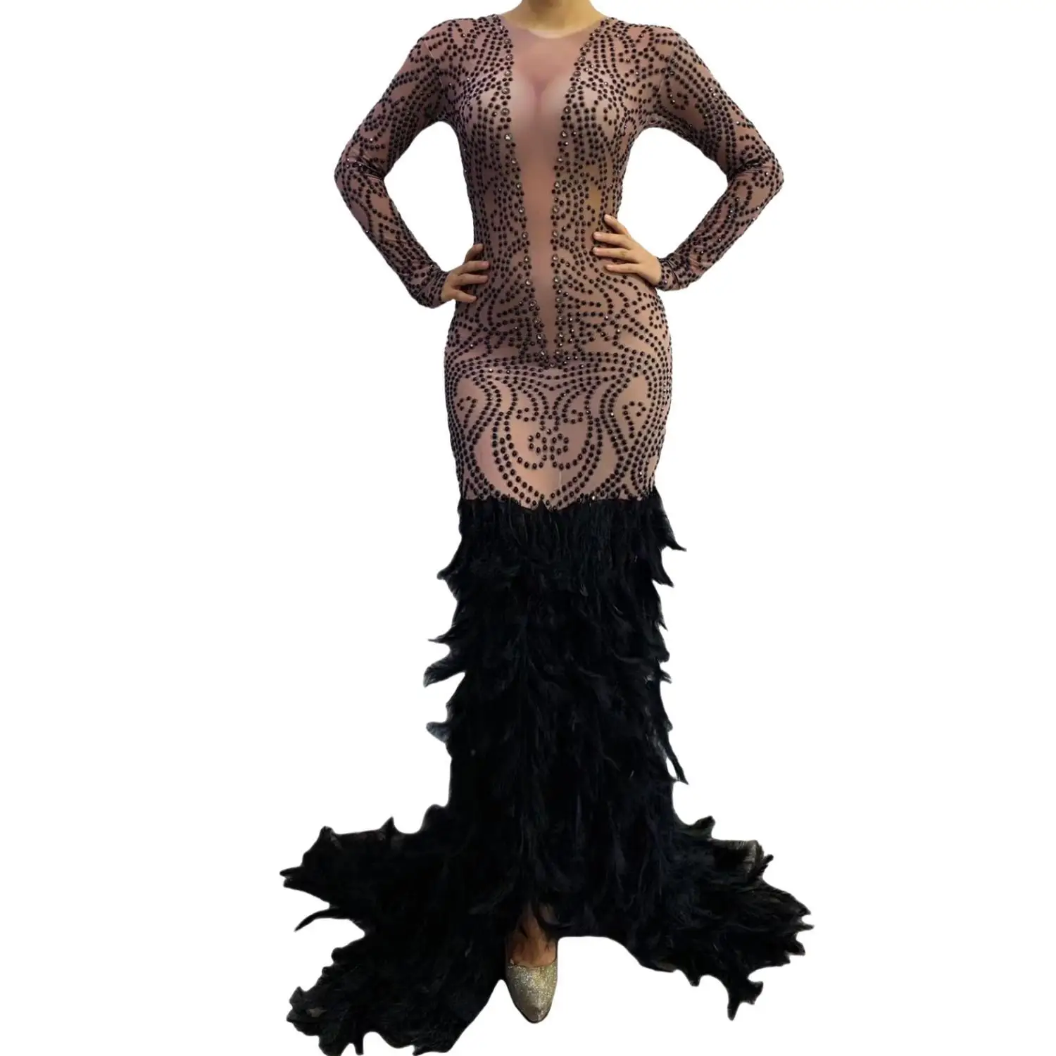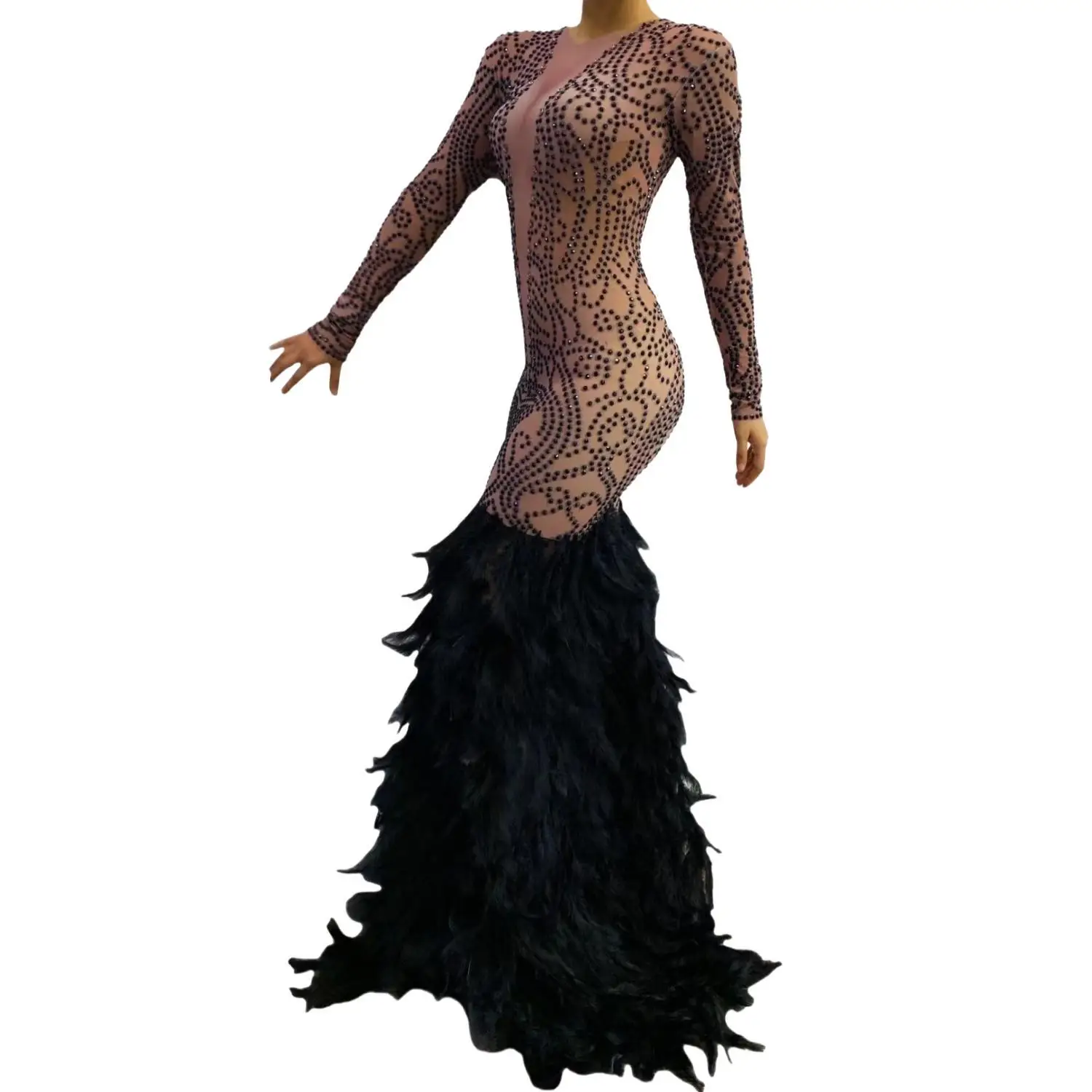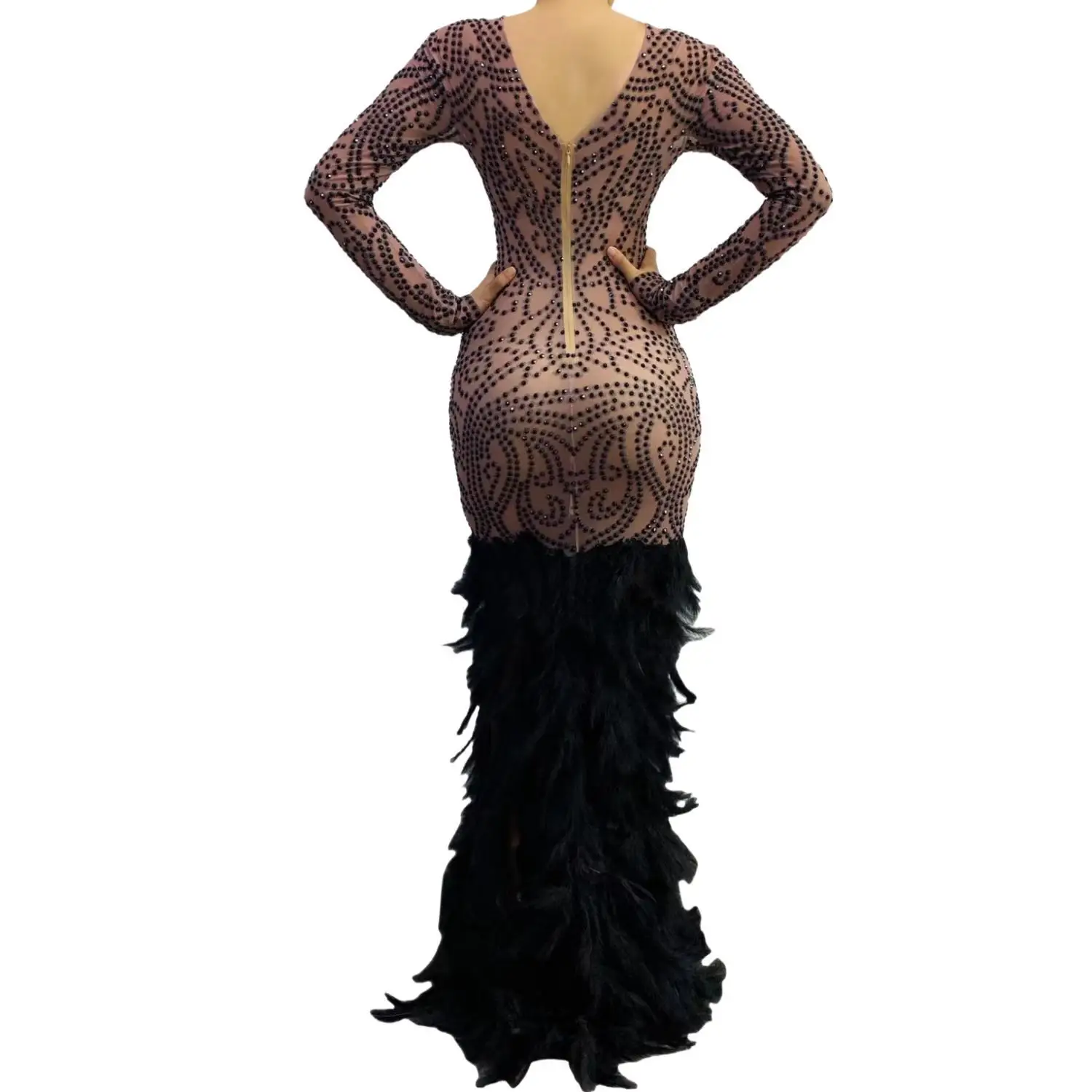 Luxury Fashion Long Sleeve Prom Dresses 2024 Mermaid Style Feather Black Girls Black Feather Prom Gala Party Gowns Zhouyu
