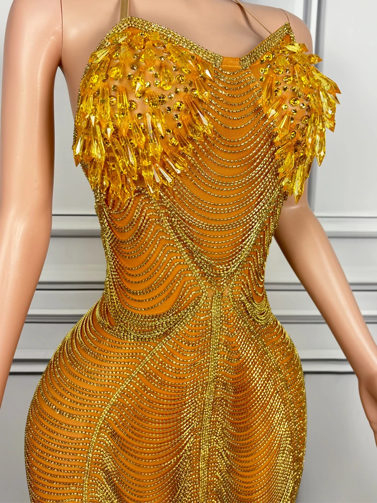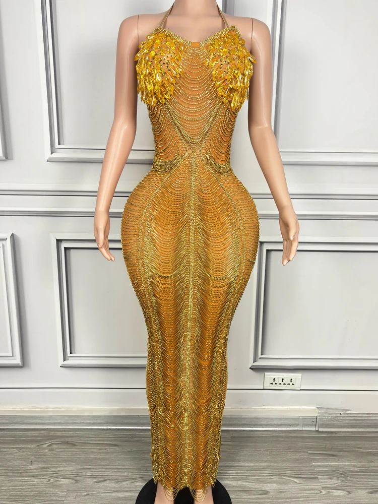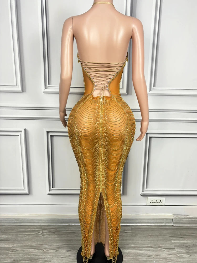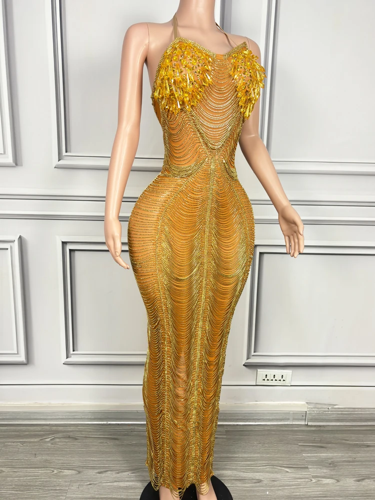 Luxury Golden Diamond Chain Tassels Women Evening Party Wear Sexy Backless Photoshoot Show Outfit Sing Stage Performance Costume