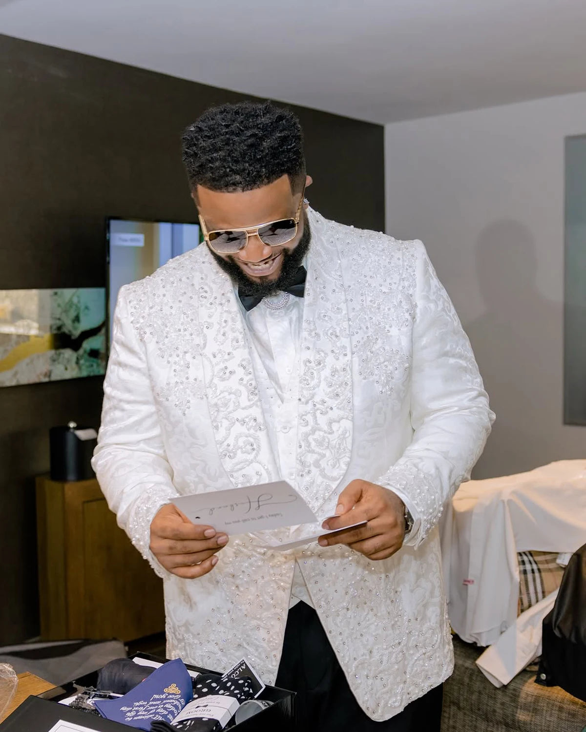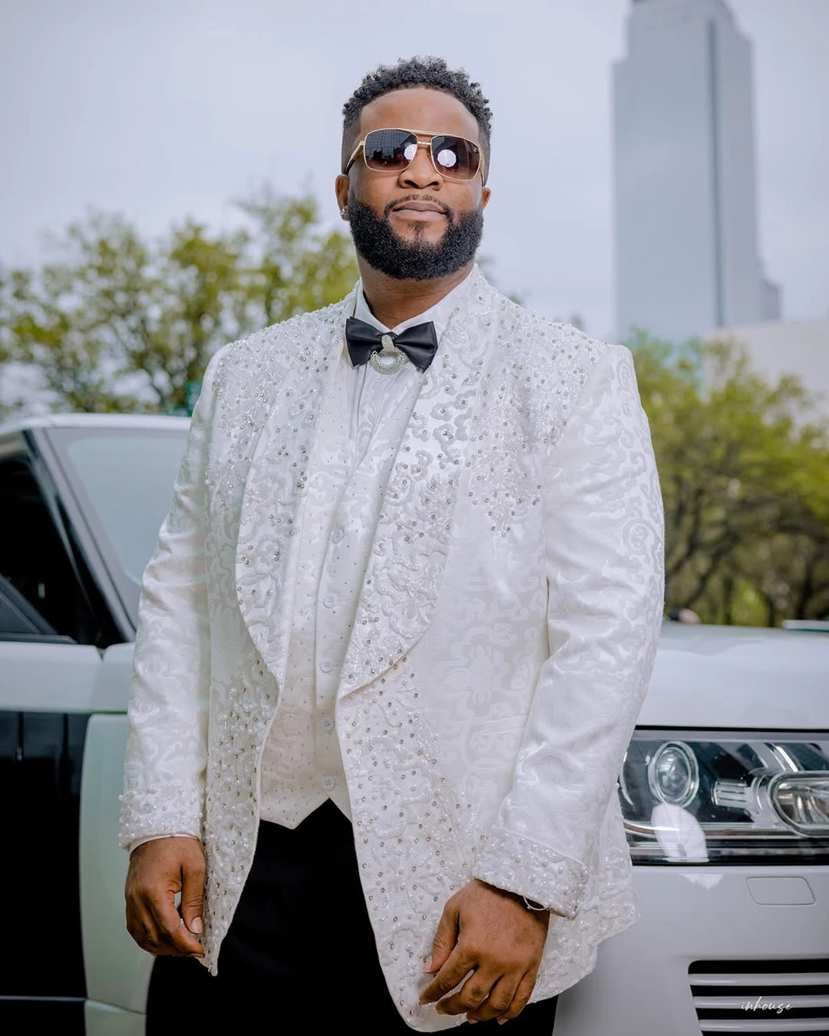 Create a striking, couture-level look with this Luxury Tailor-Made 2-piece suit, thoughtfully designed for grooms, groomsmen, or style-savvy men attending formal events. Combining a refined shawl lapel one-button blazer with matching tailored trousers, the set features jacquard appliqués and precision rhinestone embellishment for understated sparkle and textured sophistication.