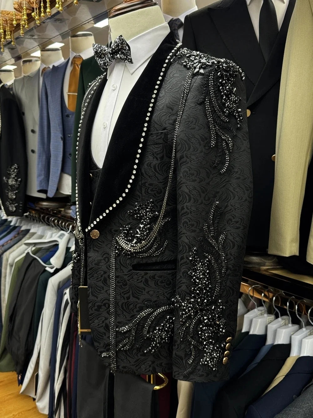 Make a show-stopping entrance with this Luxury Men’s 3‑Piece Suit — a tailor‑made ensemble that blends couture embellishment with classic tailoring. Crafted for grooms, red‑carpet appearances, and high‑end events, this set includes a shawl‑lapel jacket richly decorated with appliqués and a rhinestone tassel, a textured jacquard vest, and perfectly fitted trousers — all customizable to your exact measurements and stylistic preferences.