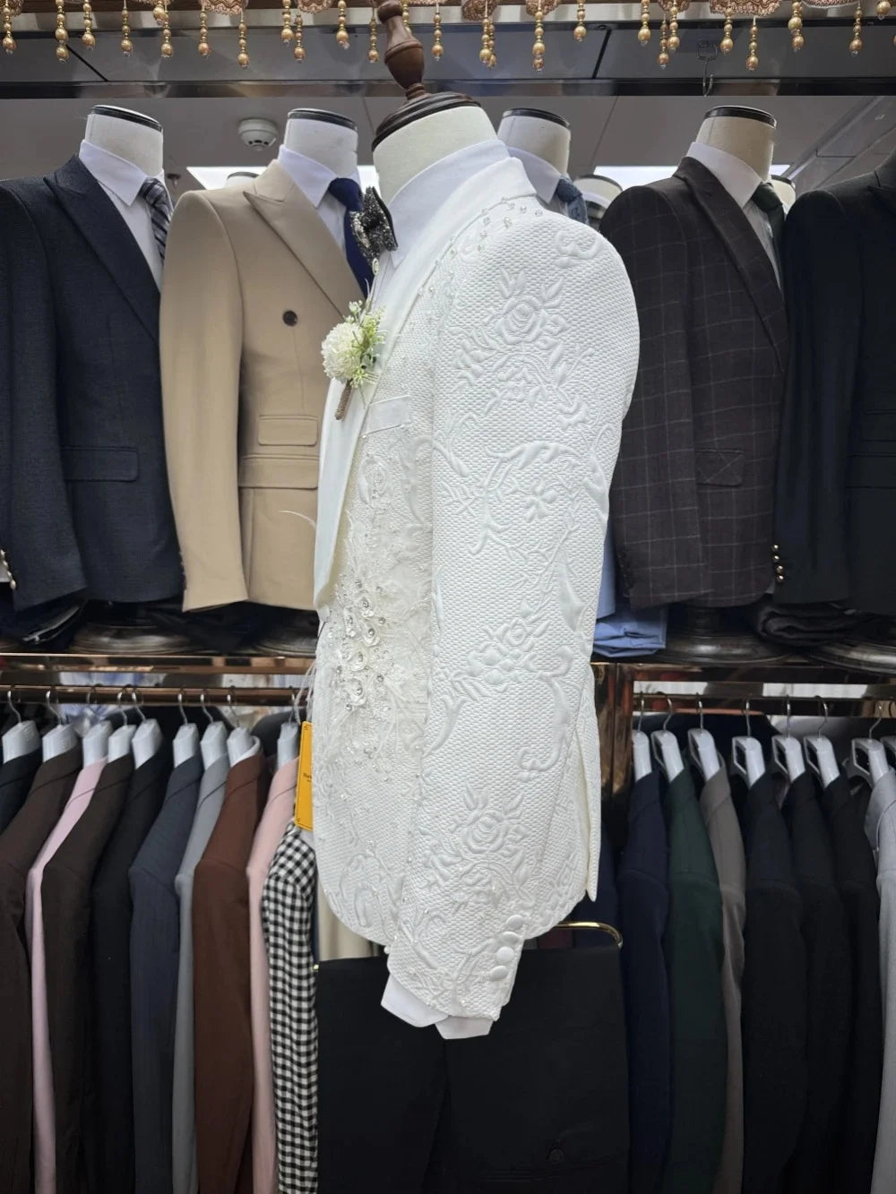 Experience couture-level refinement with this Luxury Men's 3‑Piece Suit — a tailor-made ensemble that pairs a singular one-button jacket and matching trousers with an elegant jacquard vest. Designed for grooms, black-tie events, gala evenings, and anyone who wants a distinguished, bespoke look, this set combines classic proportions with luxurious appliqués and pearl detailing for a truly memorable presentation