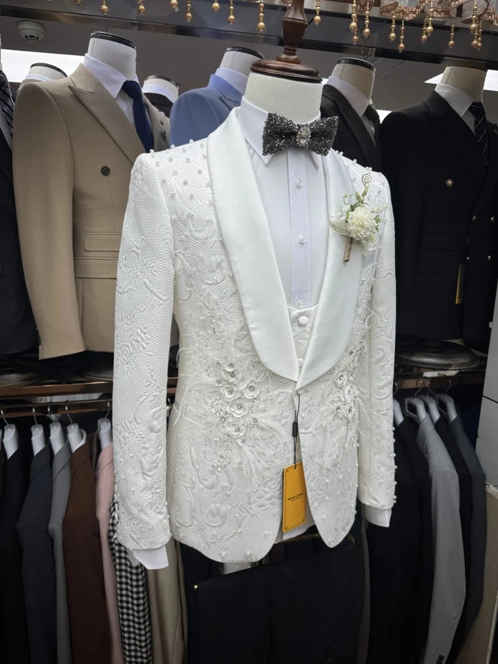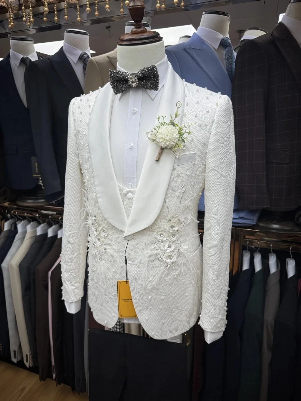 Luxury Men's Suit Shawl Lapel Appliques Tailor-Made 3 Pieces Set Jacket Pearls Jacquard One Button Customized Coat Vest Pants