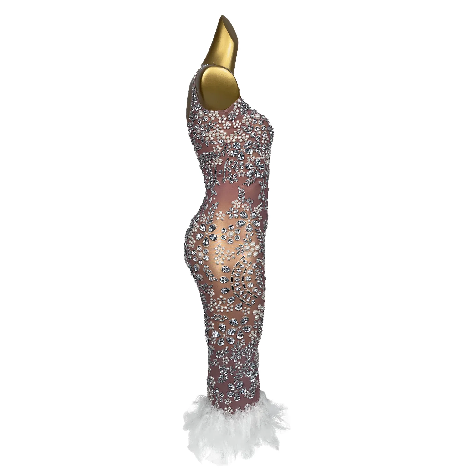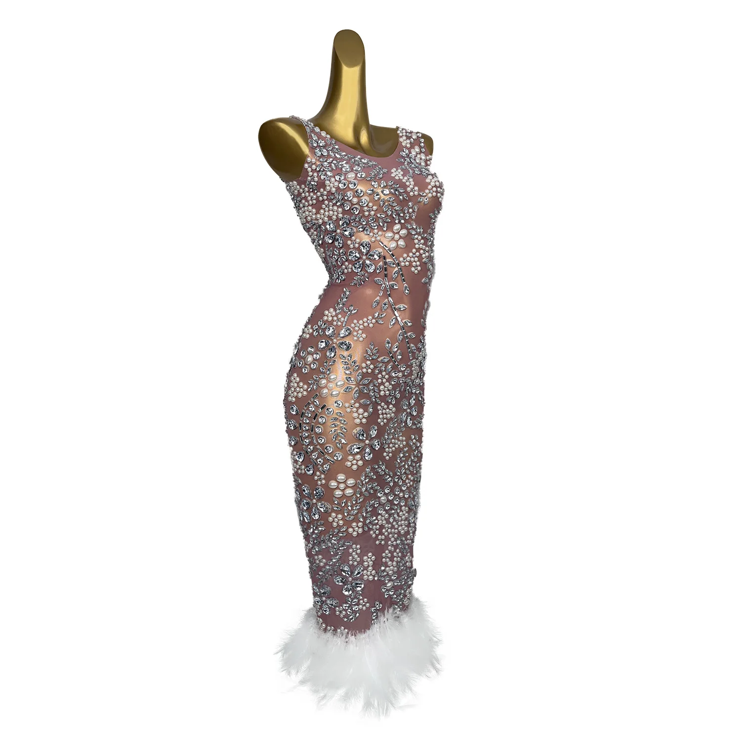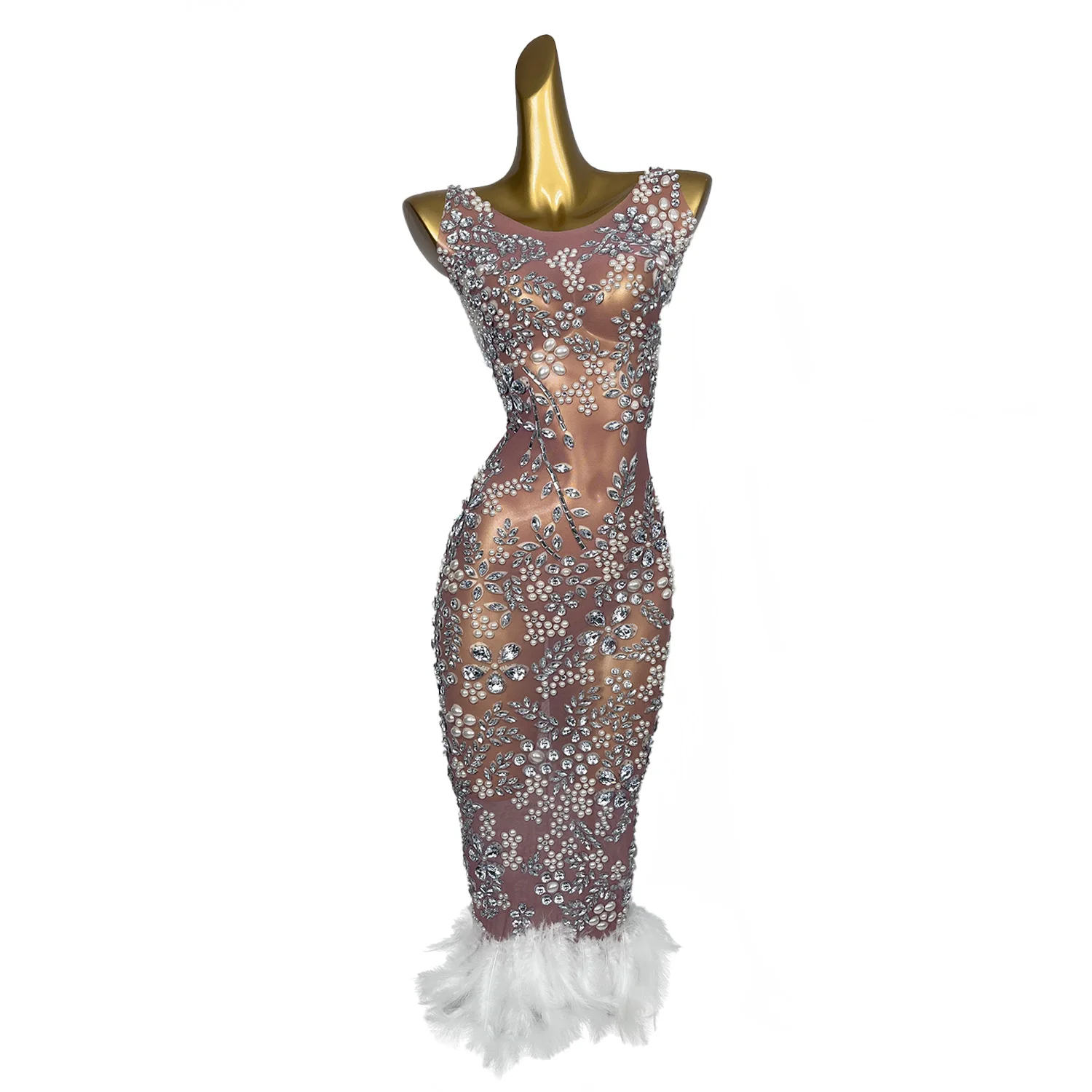 Luxury Pearl Diamonds Dress Women Ball Gown Wedding Dress Fashion Feather Shining Rhinestone Cocktail Party Dresses Meihua