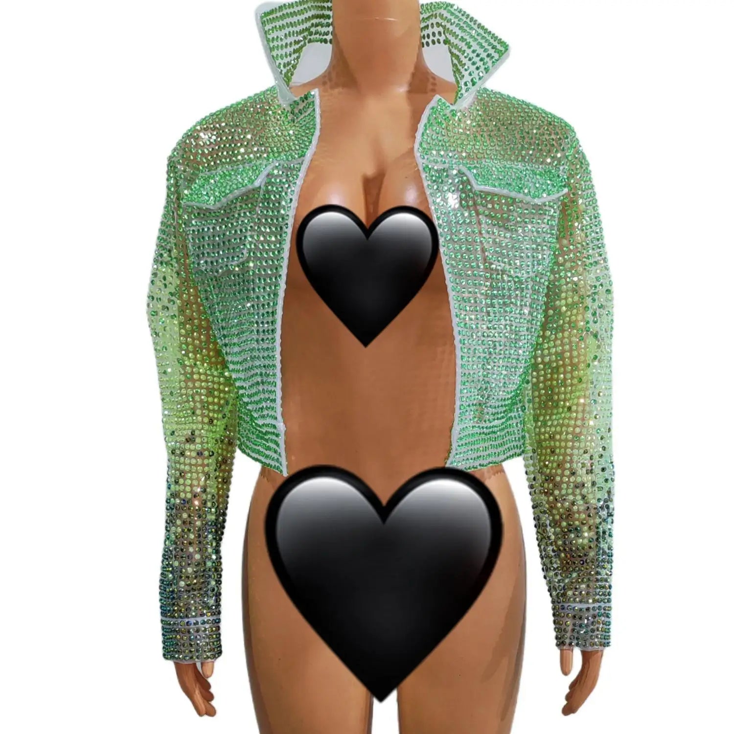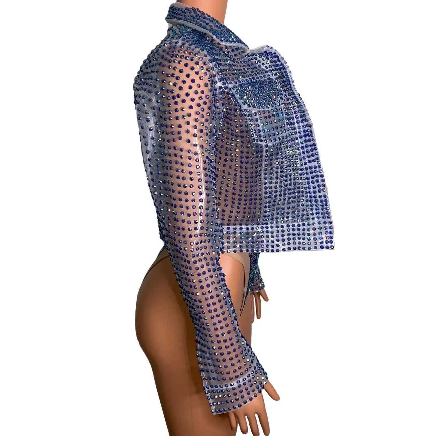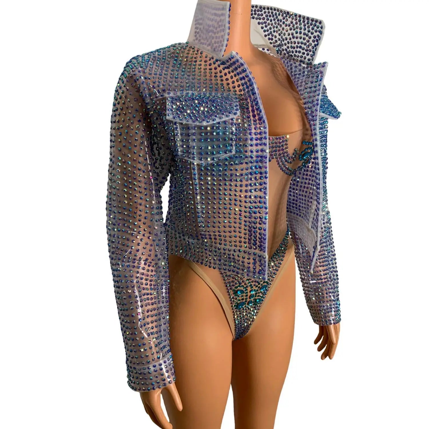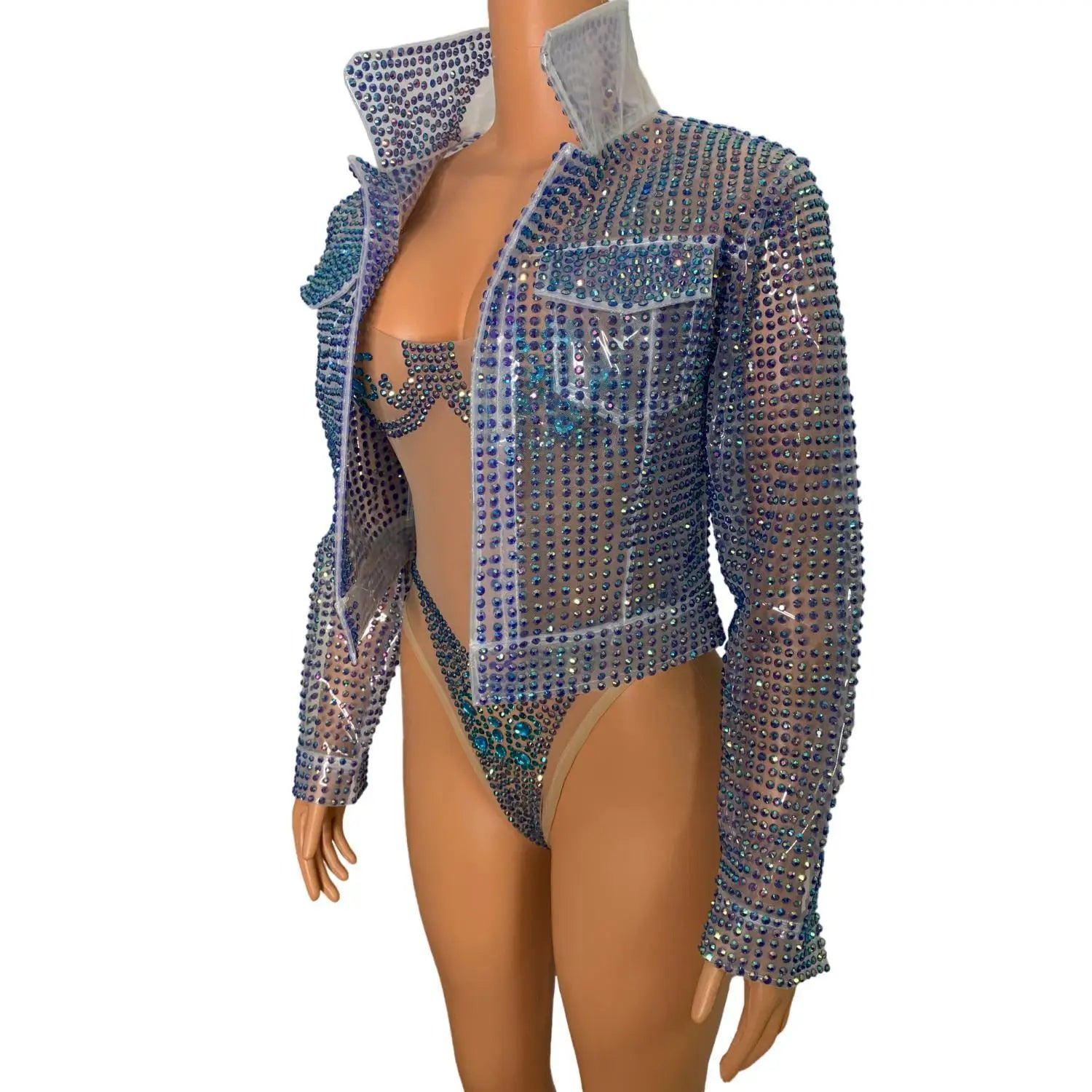 Step into dazzling glamour with thisLuxury Rhinestone TPU Jacket One-Piece Bodysuit, a high-impact stage and nightlife costume crafted for performers, pageant contestants, singers, drag artists, and anyone who wants to command attention. Combining futuristic TPU accents with couture rhinestone work and a tailored bodysuit base, this piece merges durability, shine, and show-ready design.