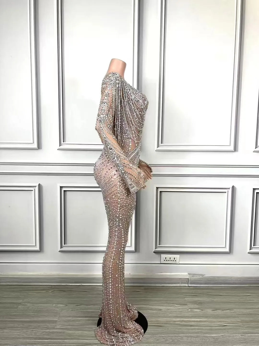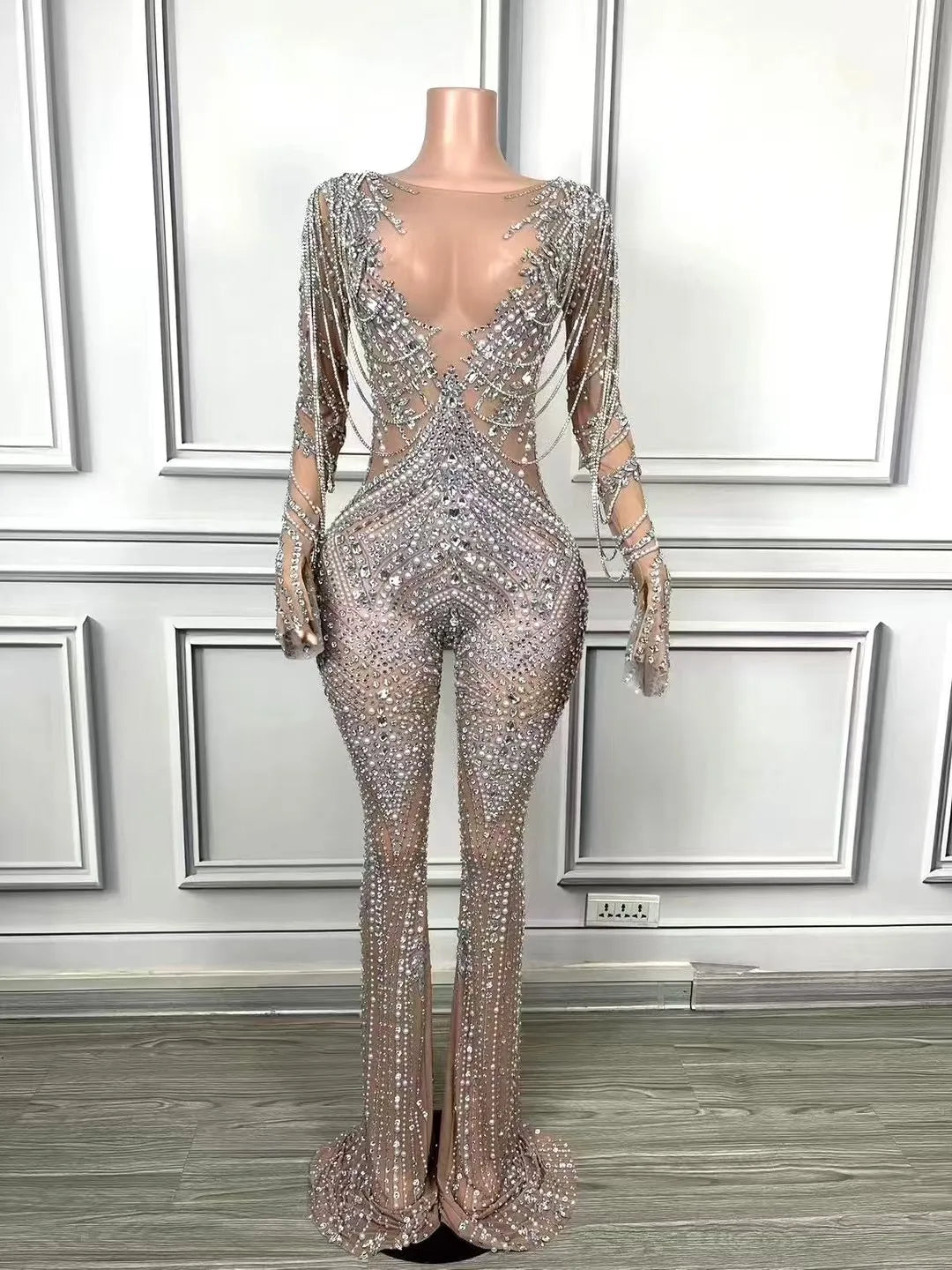 Dazzle the crowd in this luxury rhinestones chain sheath jumpsuit, designed for women who want to shine at evening parties and performances. This stunning costume is perfect for nightclub singers and dancers, featuring intricate rhinestone detailing that sparkles under the lights. With a sleek silhouette, this jumpsuit provides both style and comfort, making it an ideal choice for photoshoots and stage wear. Stand out and make a statement in this glamorous outfit!