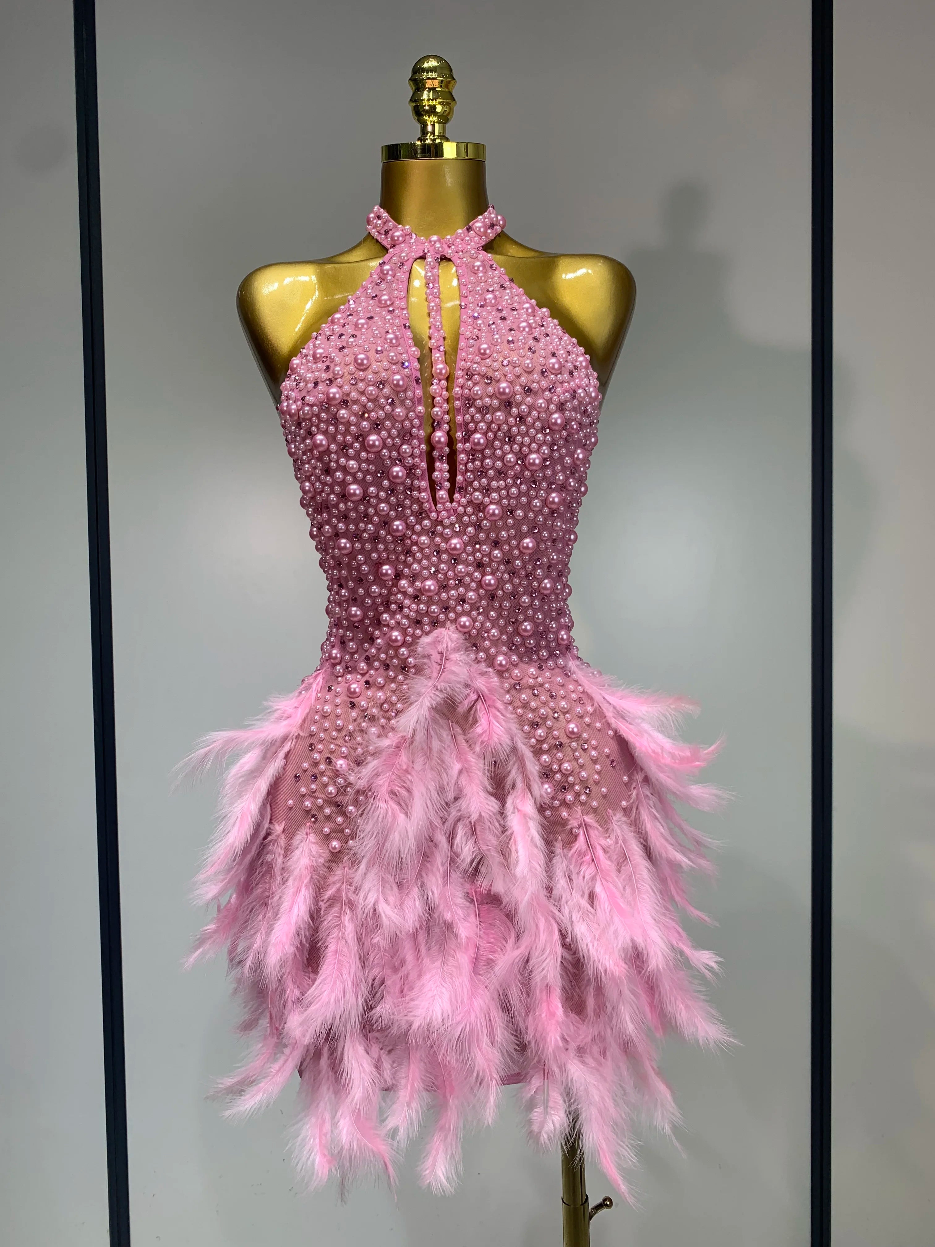 Luxury Rhinestones Pearls Halter Backless Short Feathers Dress Women Sexy Celebrate Birthday Dress Performance Dance Costume