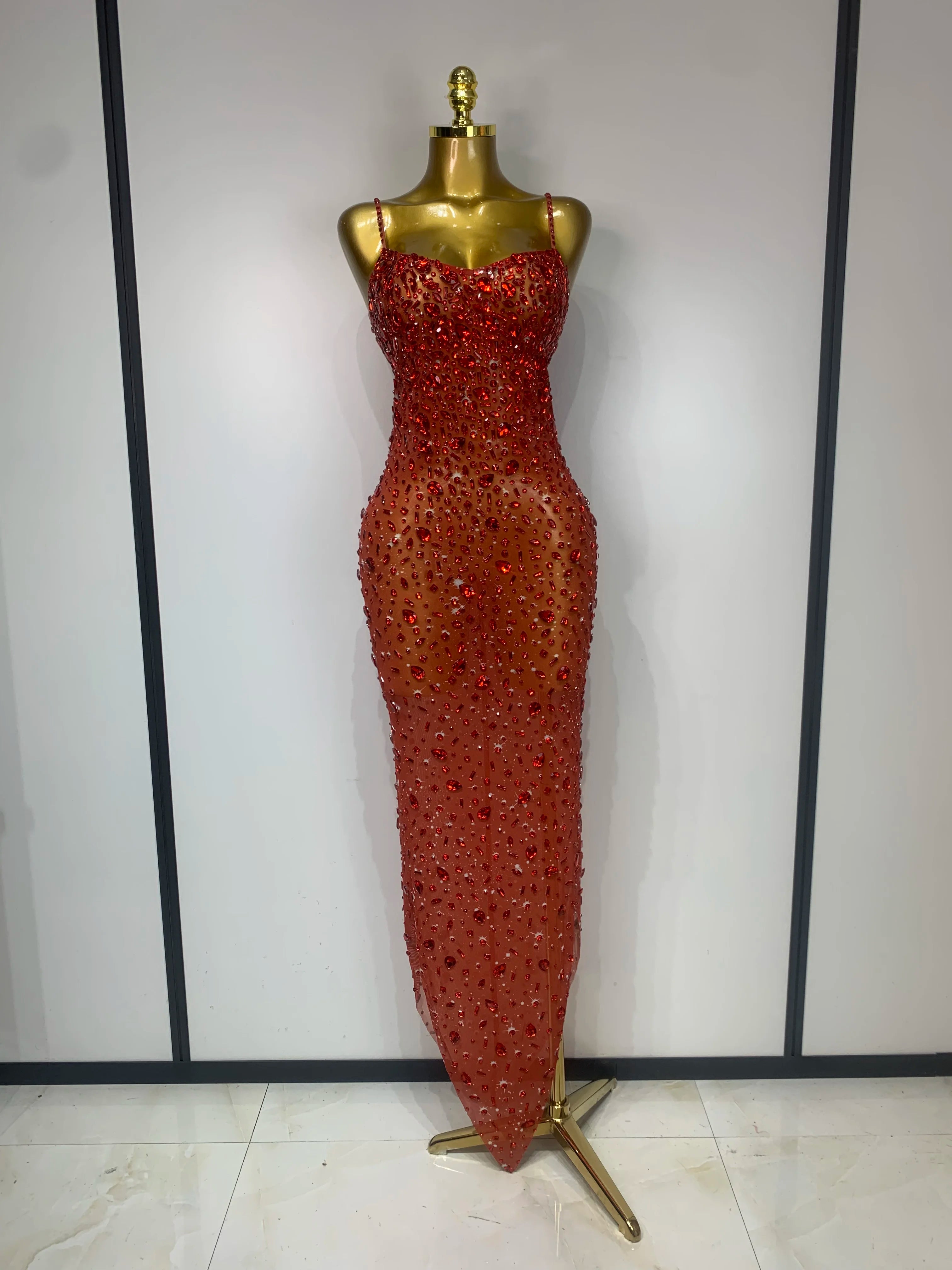 Luxury Rhinestones Sexy Mesh See Through Bodycon Dress Women Birthday Evening Cocktail Party Gown Red Carpet Club Stage Outfit