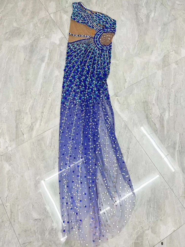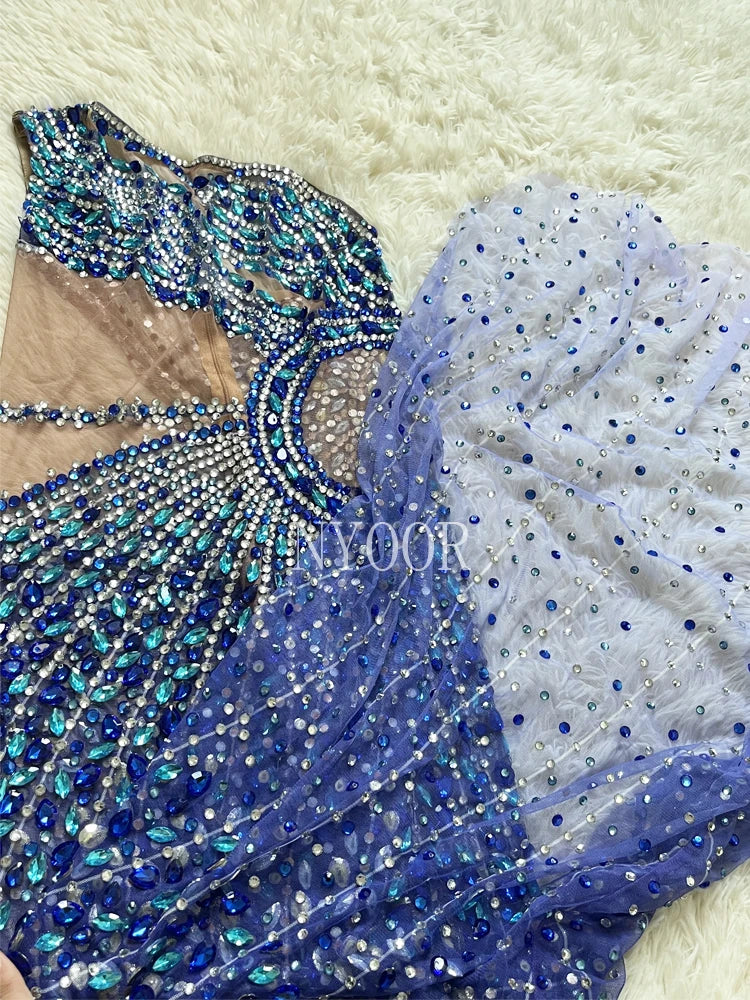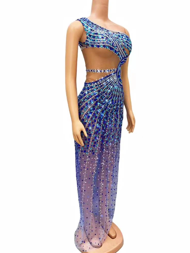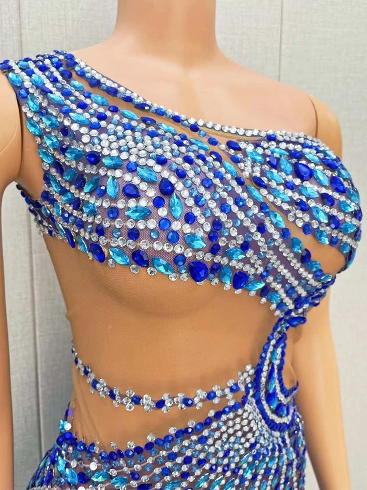 Luxury Shining Rhinestone Sleeveless Women Blue Dress Sexy See Through Mesh Party Wear Carnival Parade Stage Performance Costume