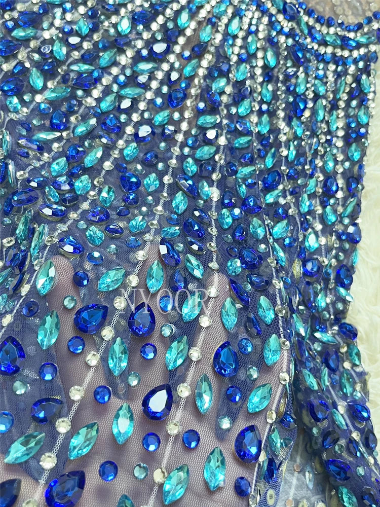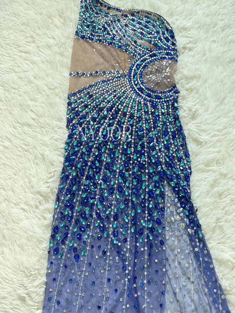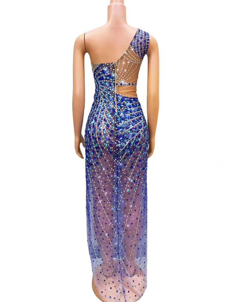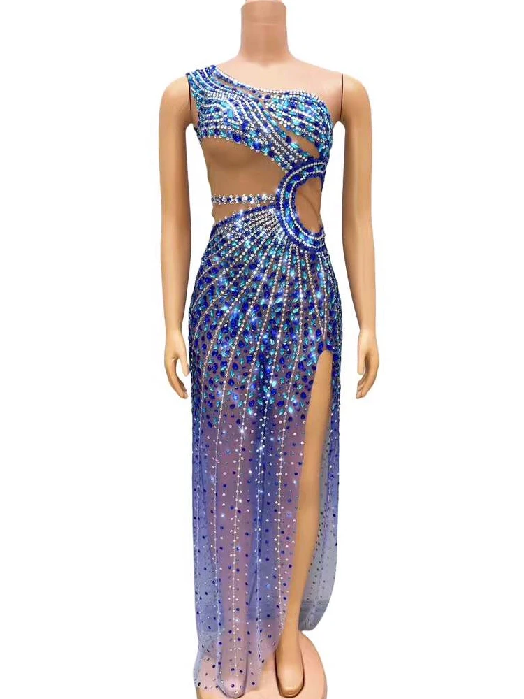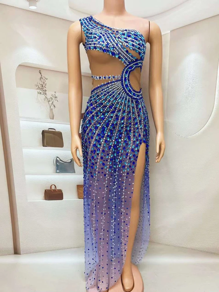 Luxury Shining Rhinestone Sleeveless Women Blue Dress Sexy See Through Mesh Party Wear Carnival Parade Stage Performance Costume