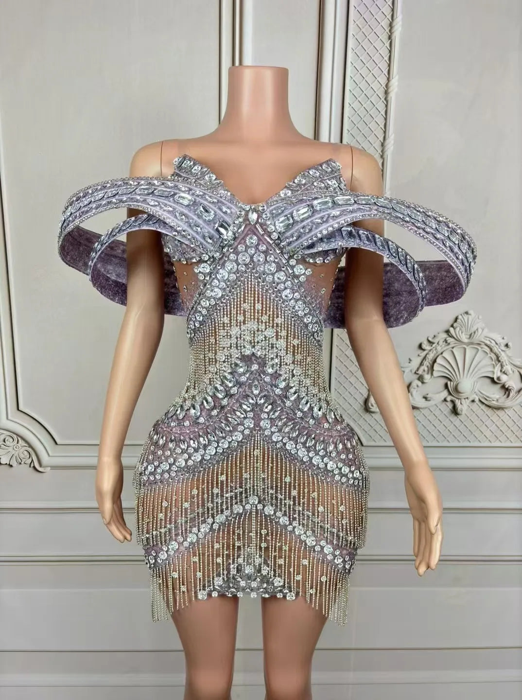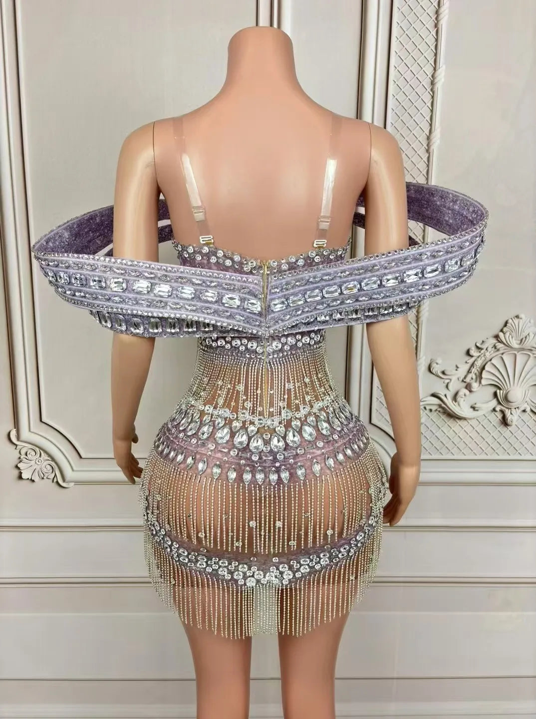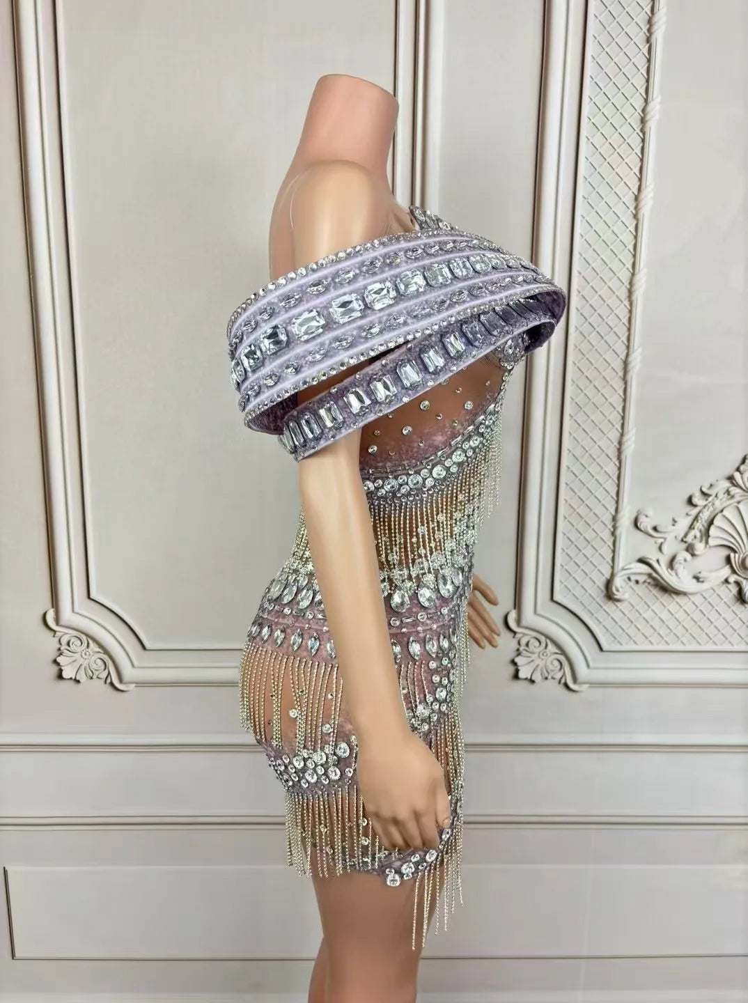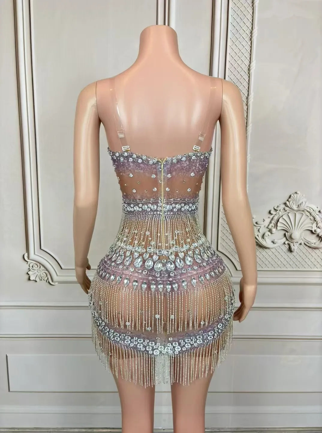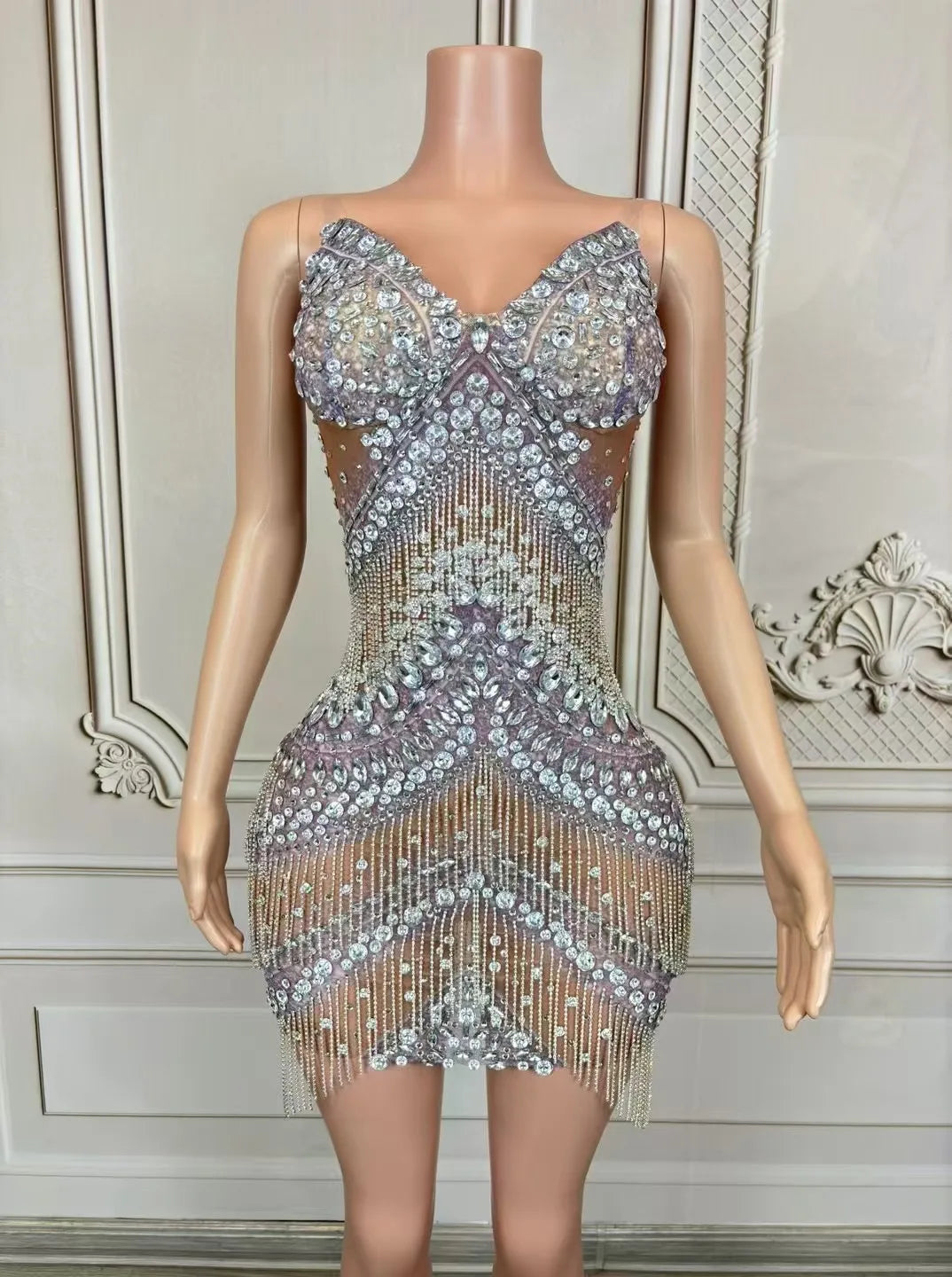 Shine bright in our luxury sparkly rhinestones chain short mesh dress, designed for women who love to dazzle. This sexy dress is perfect for stage performances, evening celebrations, club outings, birthday parties, and photoshoots. Featuring exquisite rhinestone embellishments and a chic mesh design, it combines elegance with a playful edge. Make your special moments unforgettable and turn heads wherever you go in this stunning costume!