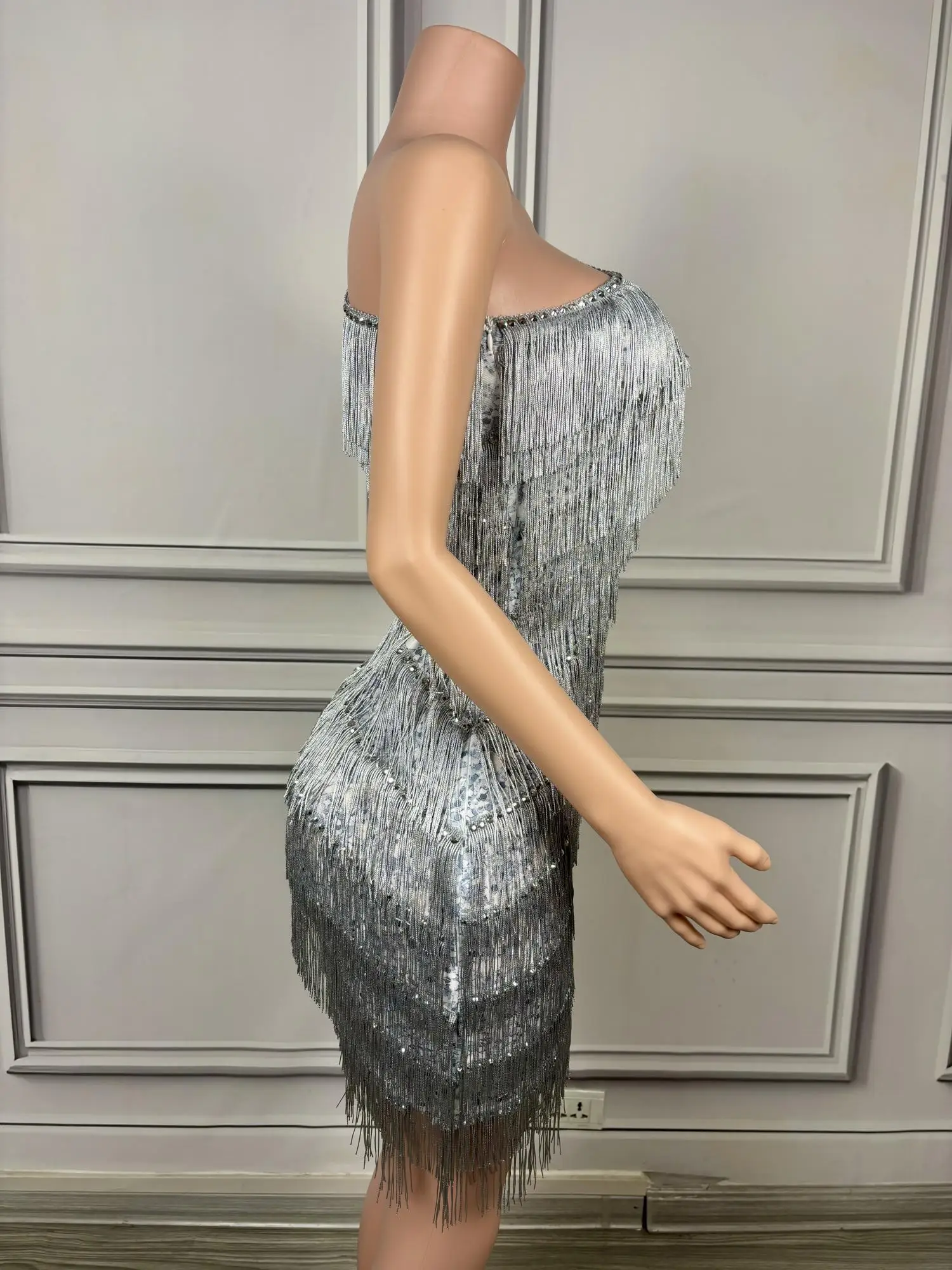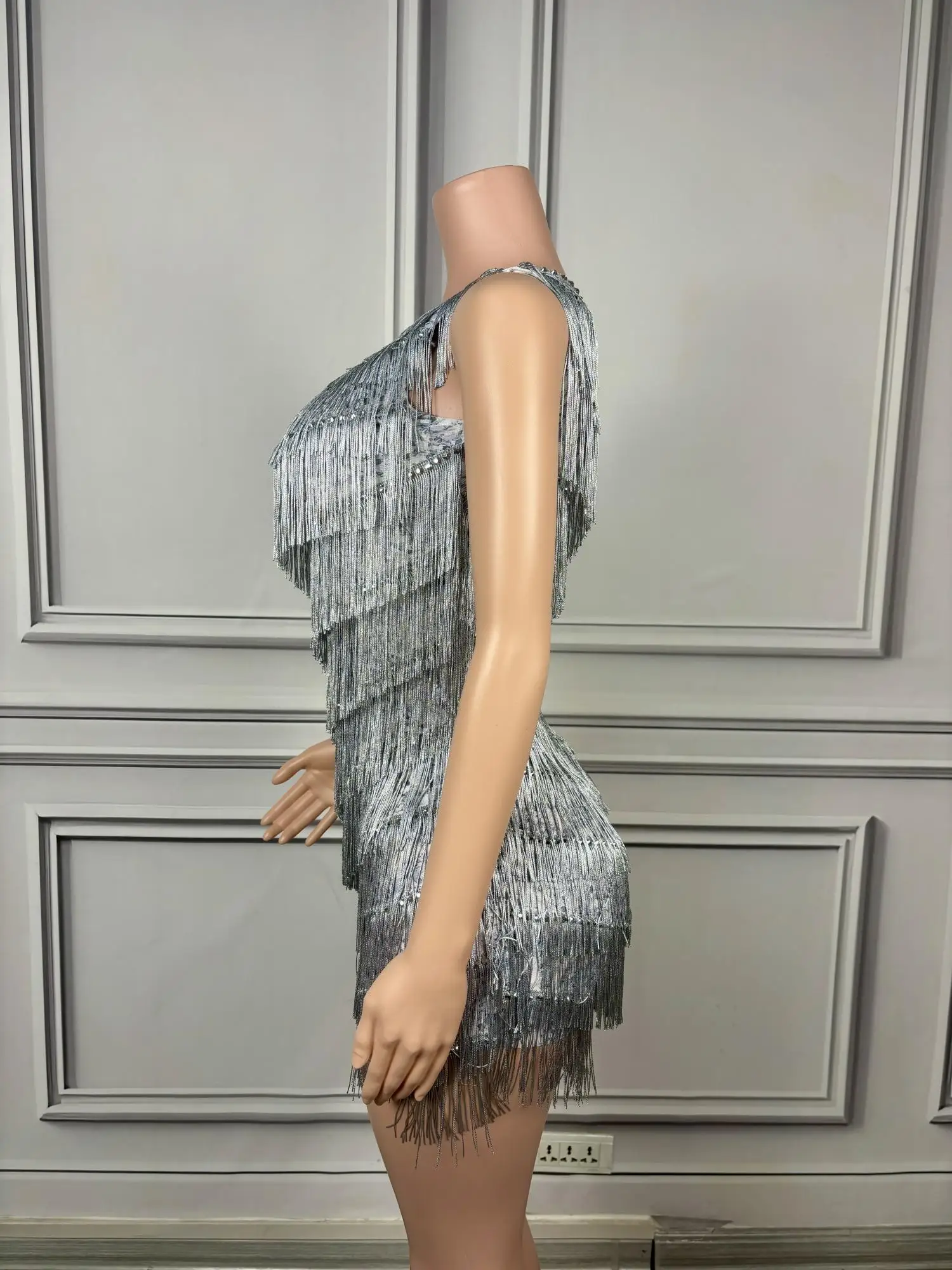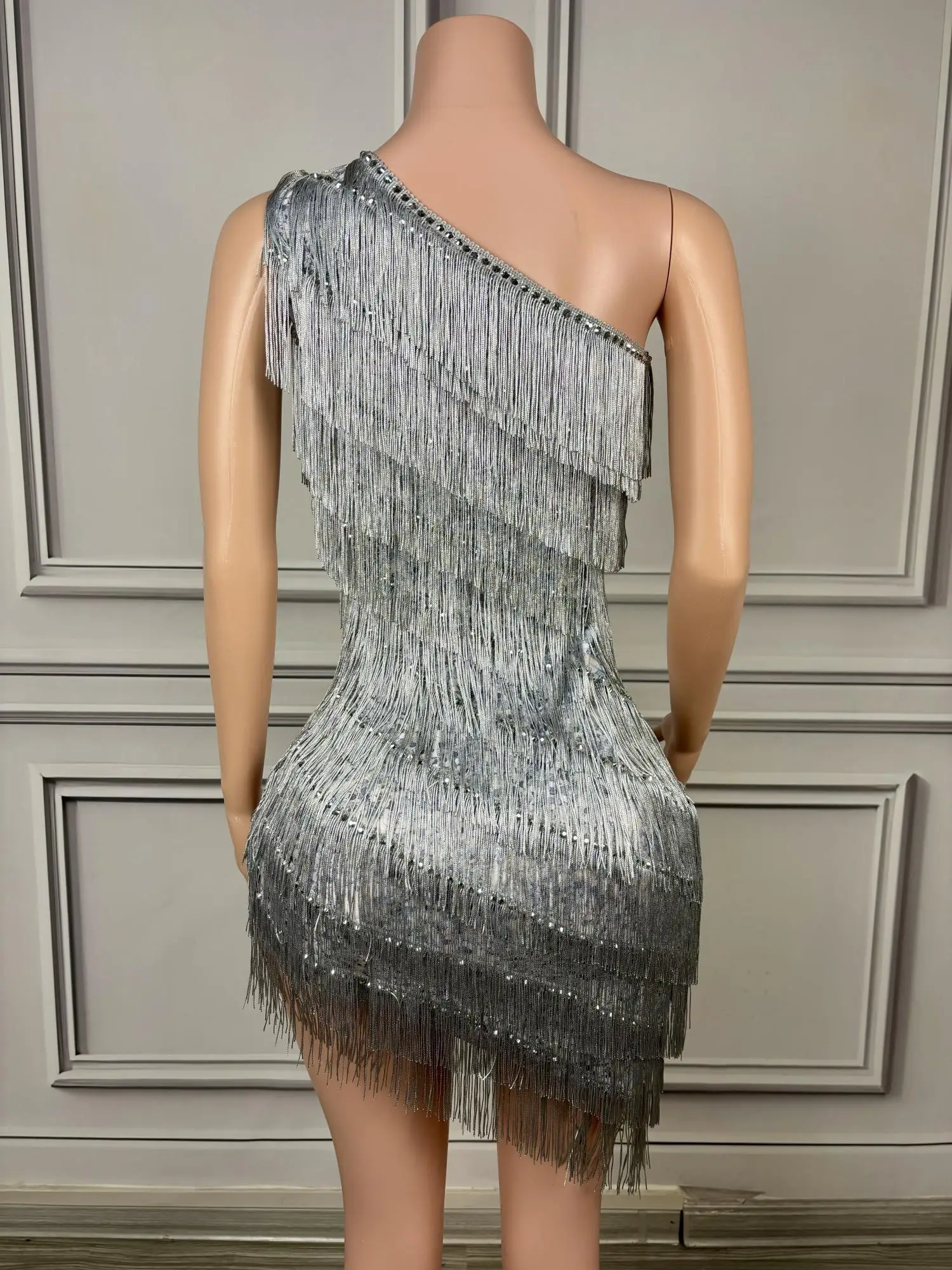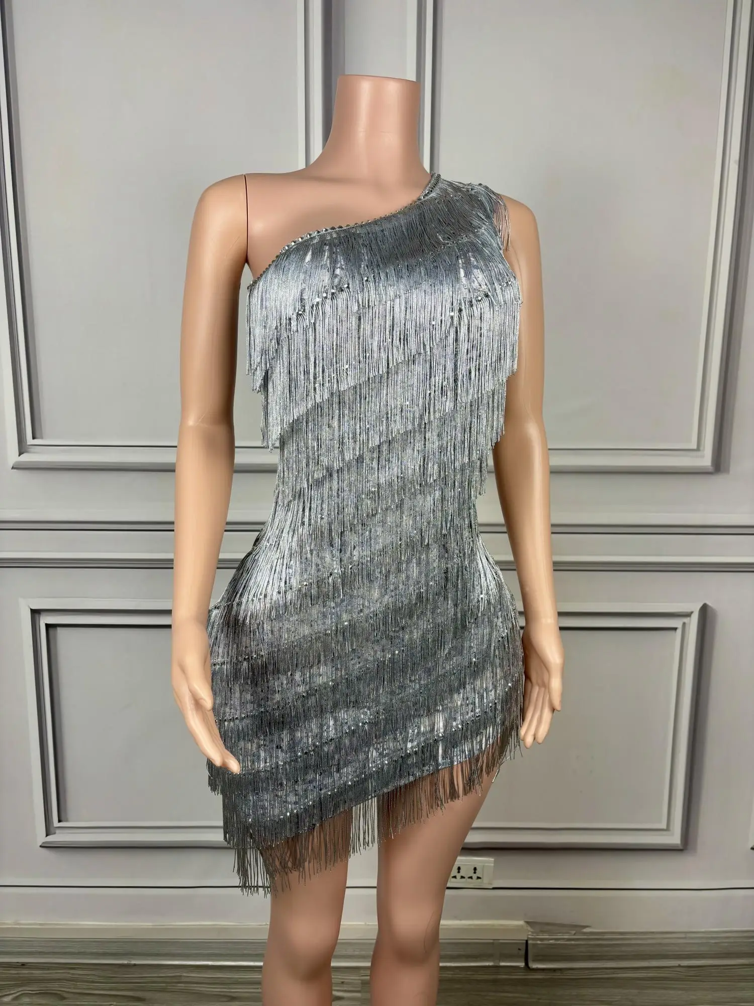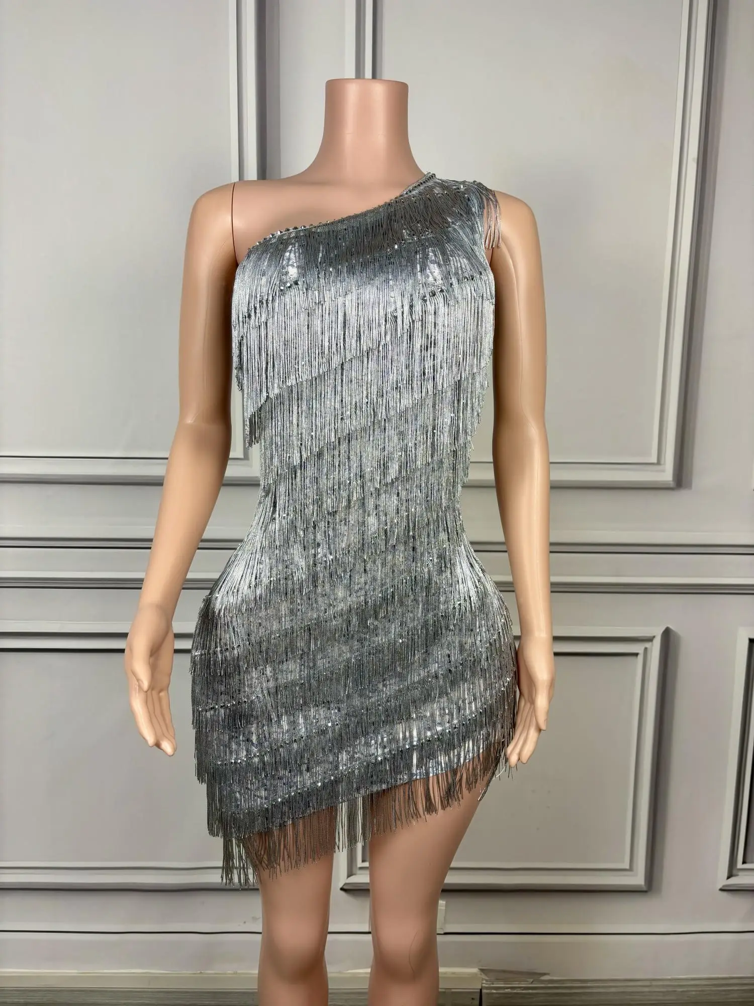 Luxury Tassels Mini Sheath Dress Sexy One Shoulder Birthday Evening Party Performance Costume Nightclub Stage Wear Silver Titian