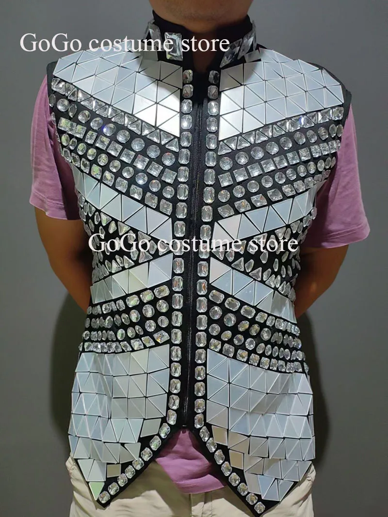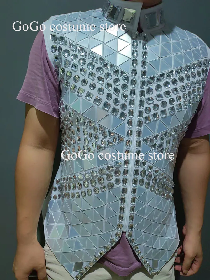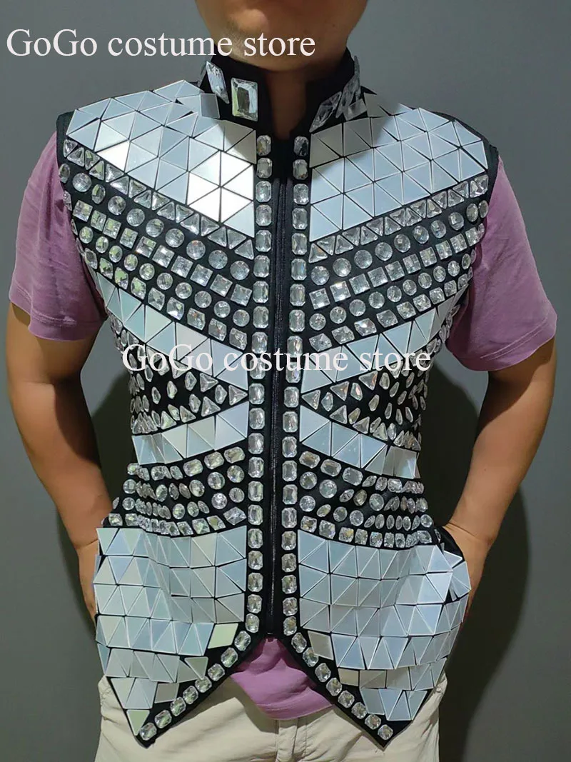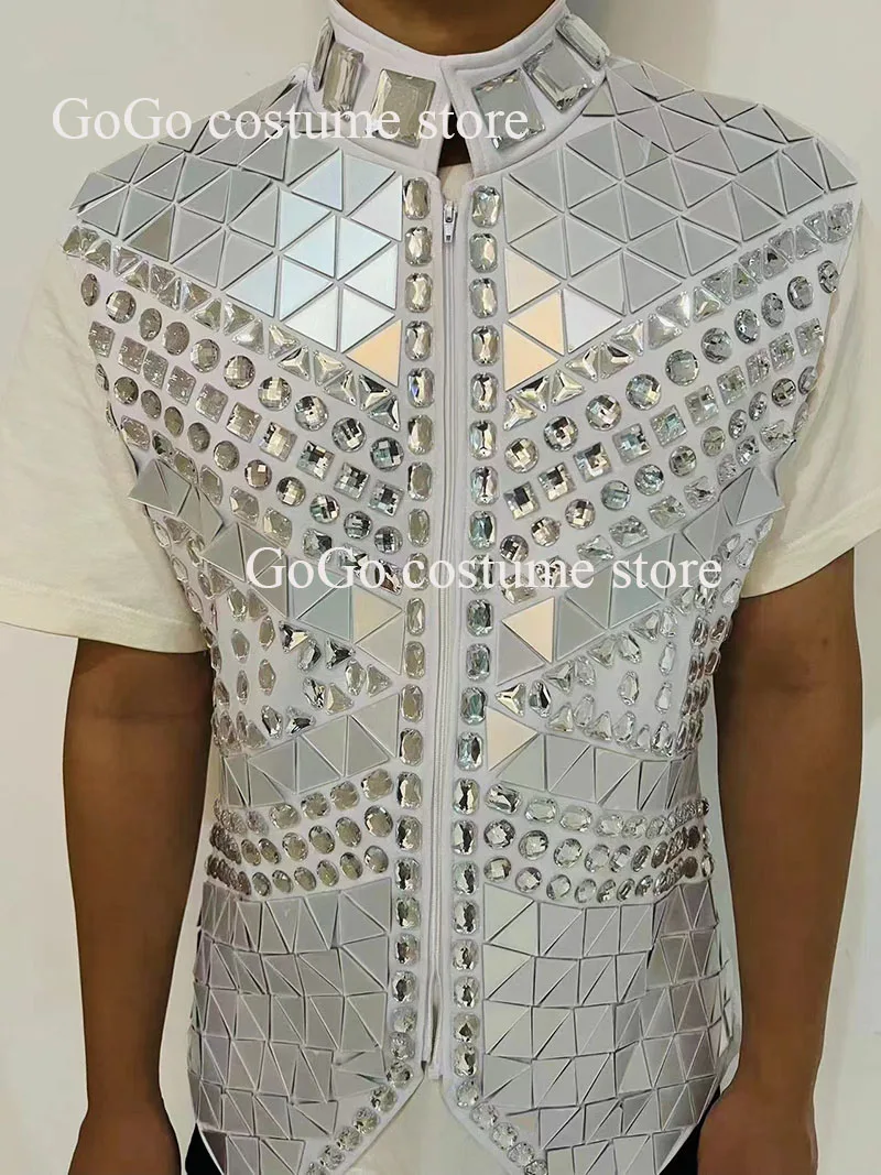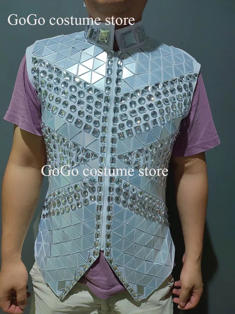Male Singer Bar Nightclub Stage Crystal Sequins Vest Performance Clothes Drum Dance Coat Sparkly Rhinestones Mirror Waistcoat