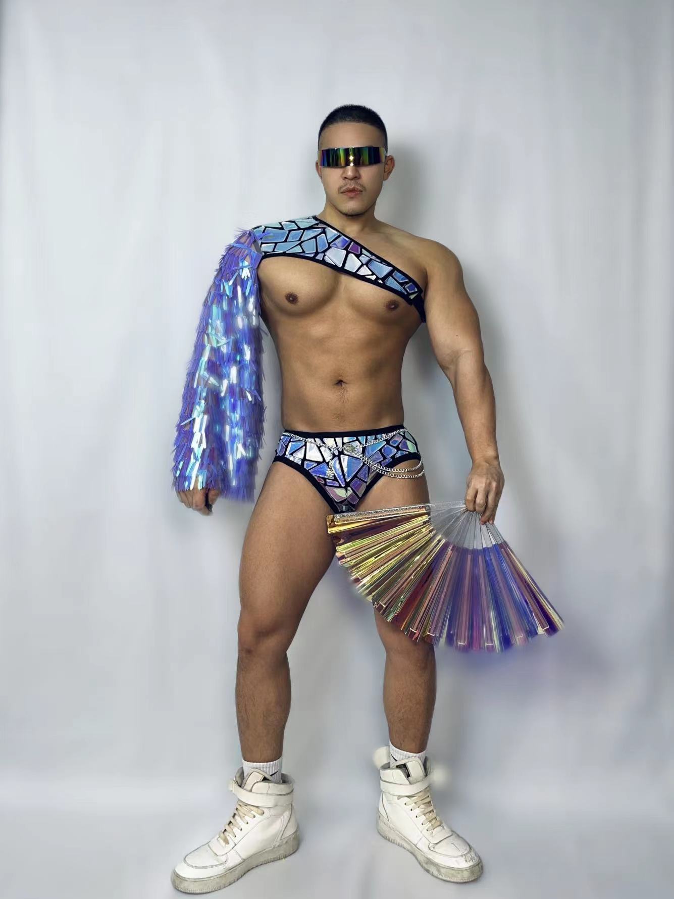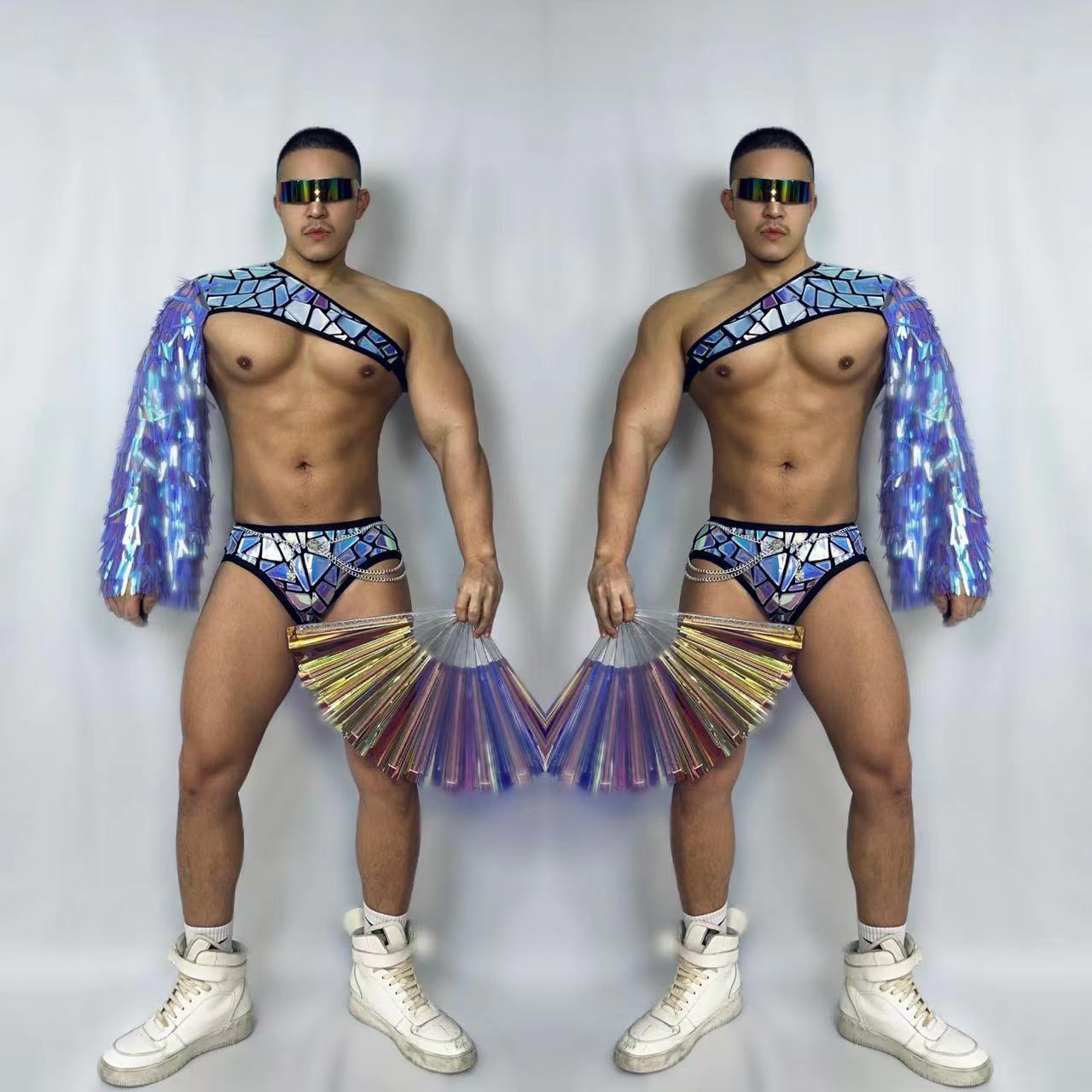 Man Mirror Bright Laser Single Shoulder Top Shorts Suit Nightclub Bar DS Singer Gogo Costume Party Show Stage Wear