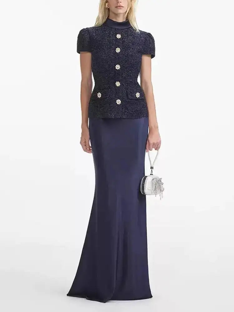 Formal Luxury Evening Dresses Women Summer Autumn Single Breasted Crystal Satin Tweed Long Dress Blue Party Dinner Vestidos